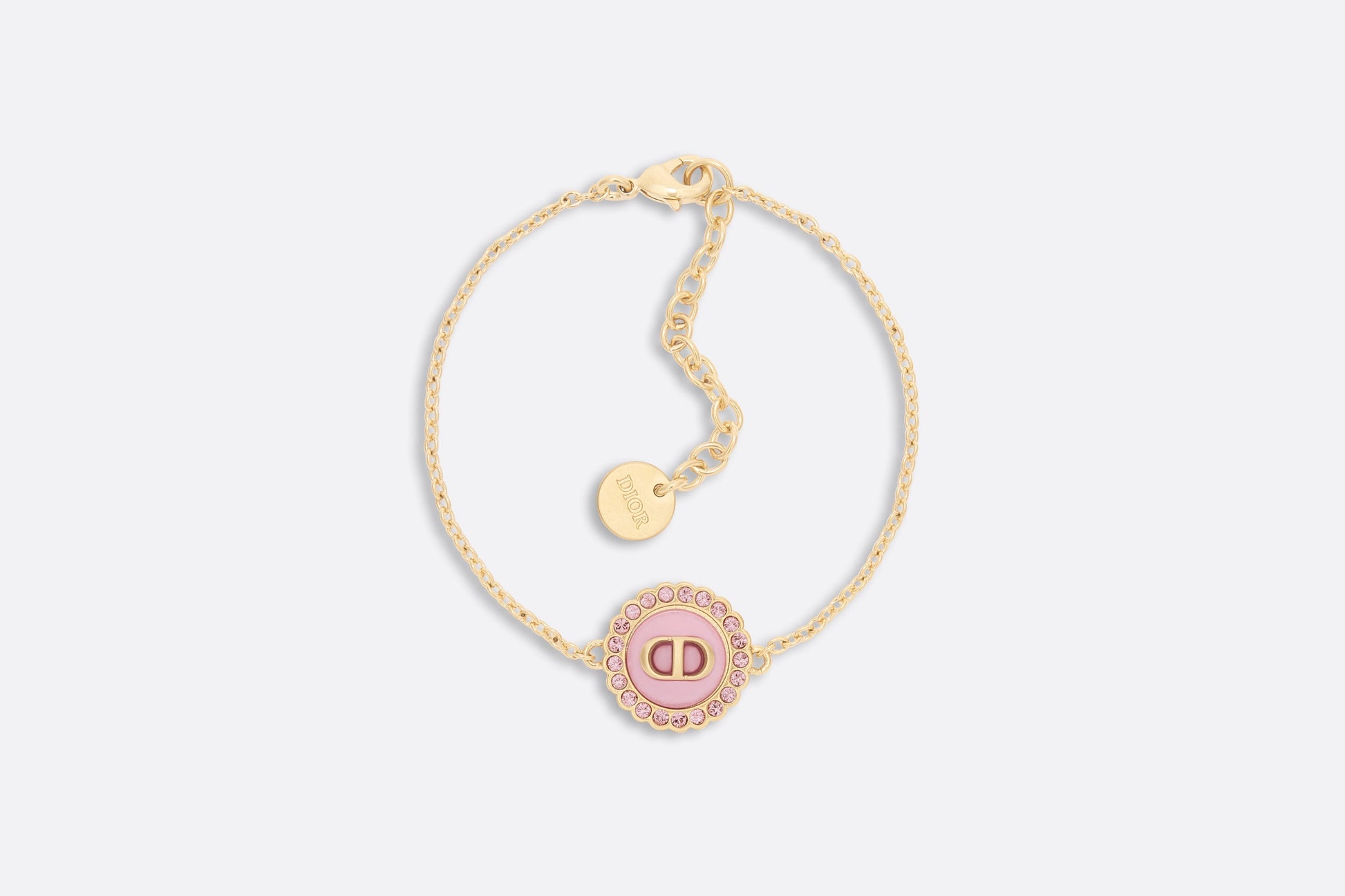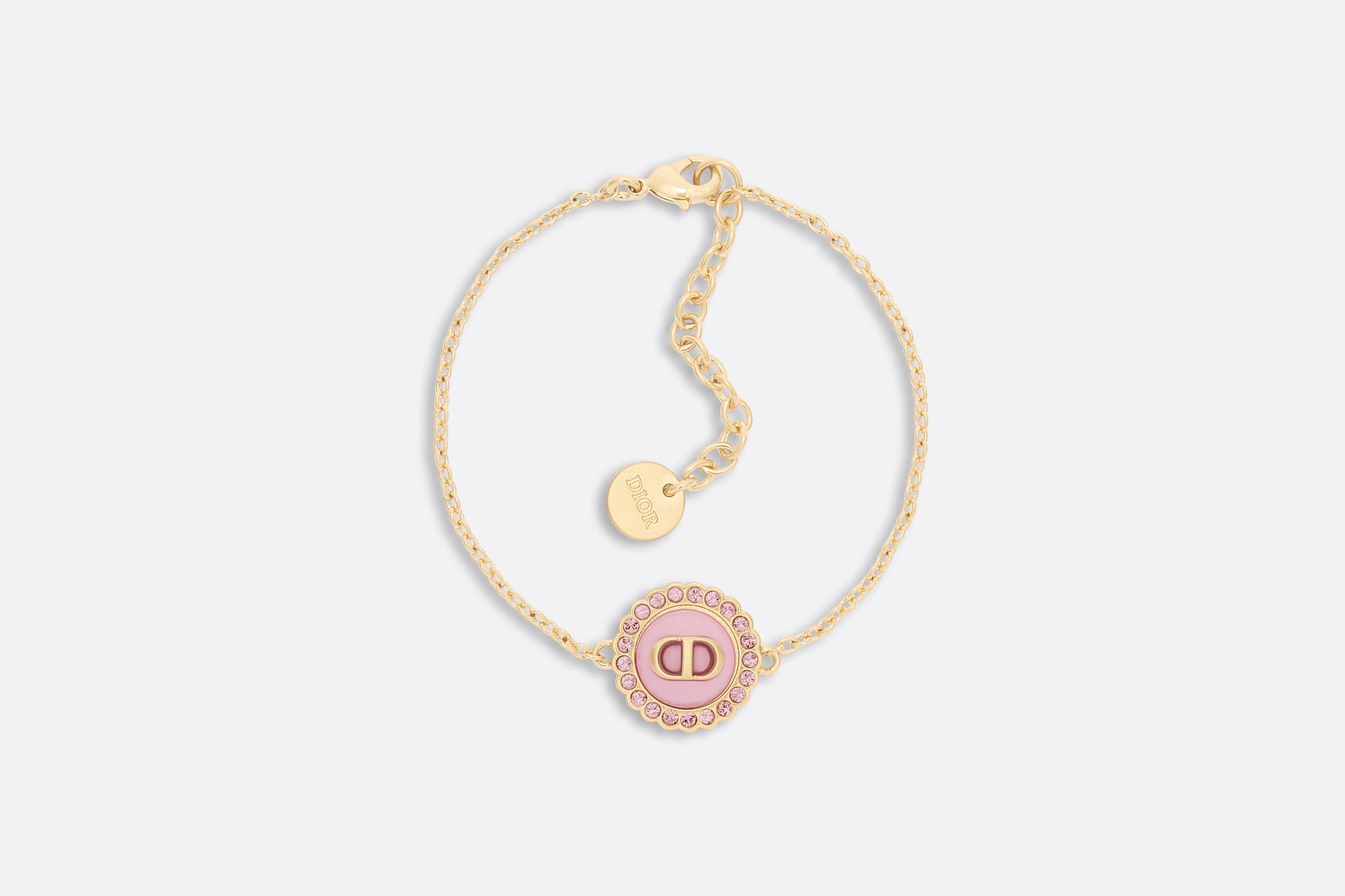 The Petit CD bracelet is an elegant and colorful creation. The thin chain crafted in gold-finish metal showcases a light pink glass cabochon adorned with the CD signature and delicately encircled by pink crystals. The sophisticated bracelet can be worn with other creations from the Petit CD line.