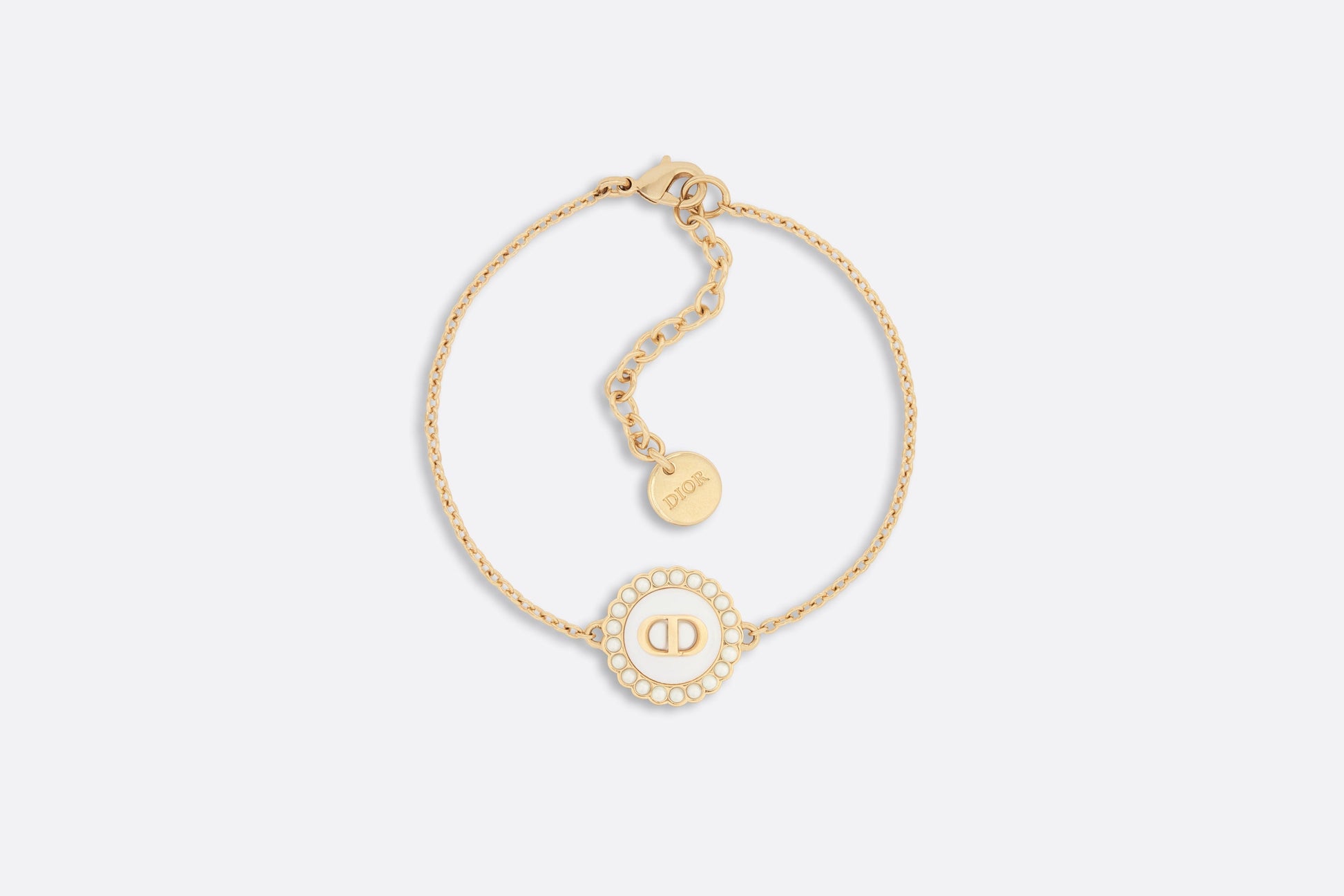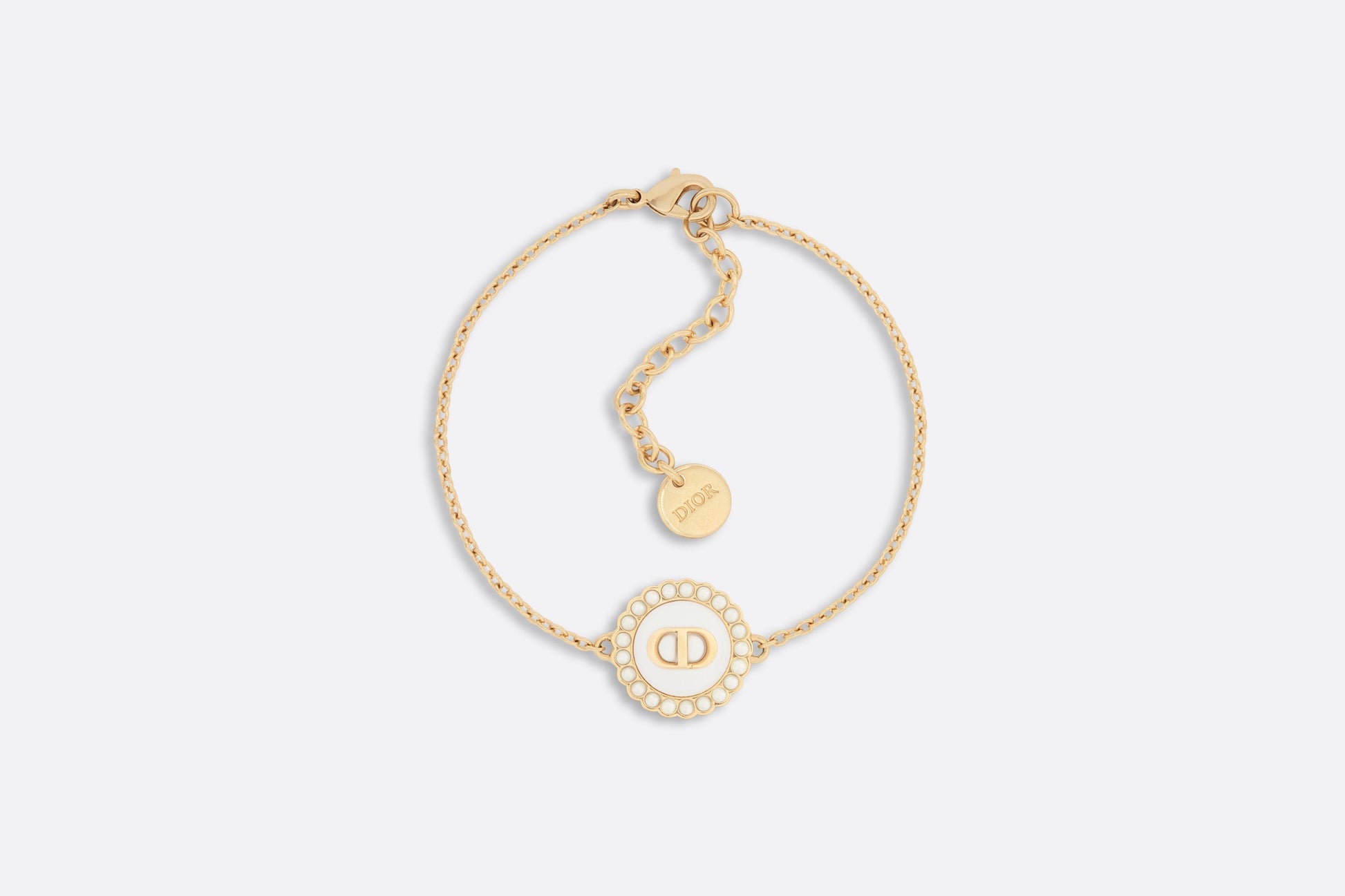 The Petit CD bracelet is an elegant and timeless creation. The thin chain crafted in gold-finish metal showcases a latte glass cabochon adorned with the CD signature and delicately encircled by white resin pearls. The sophisticated bracelet can be worn with other creations from the Petit CD line.