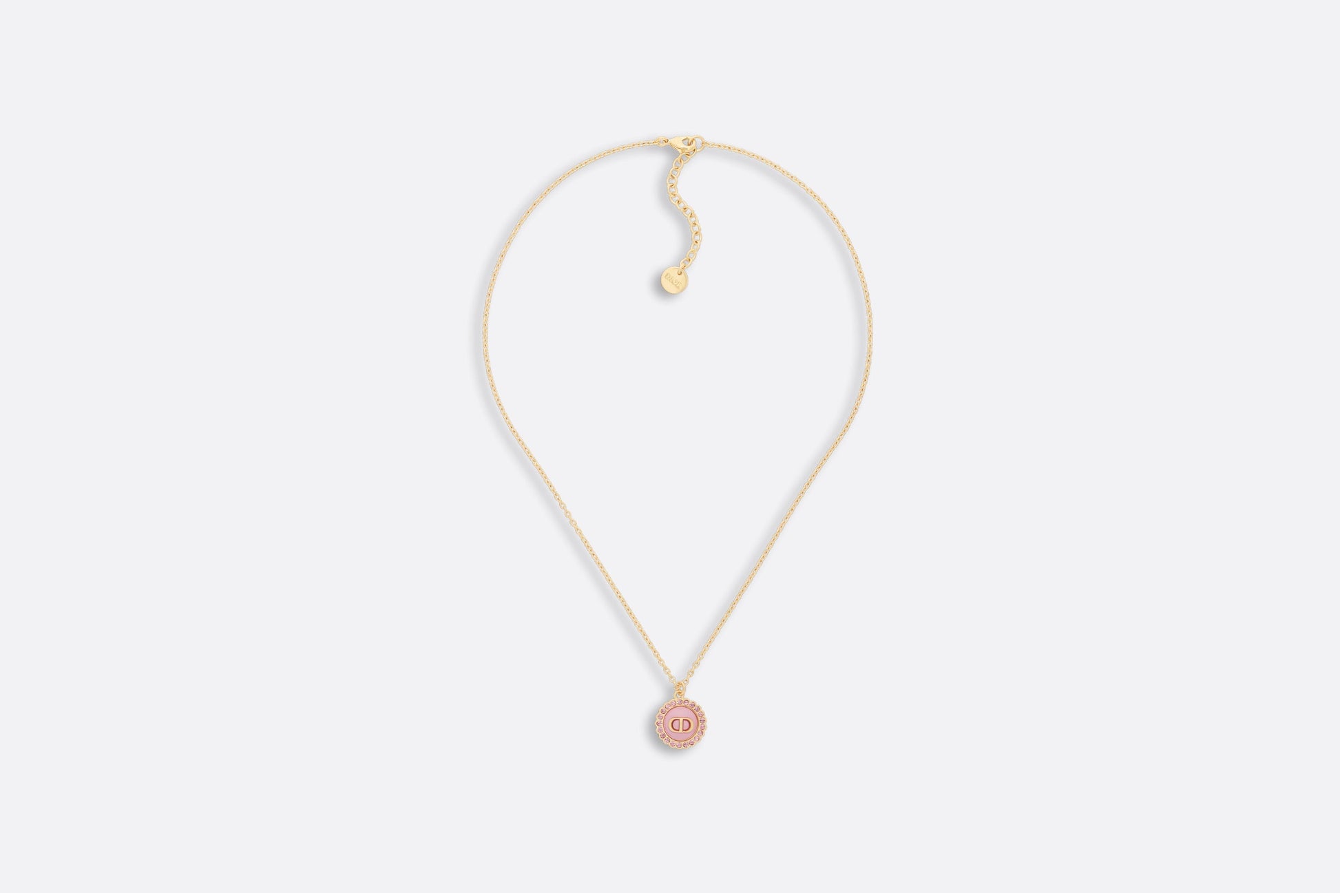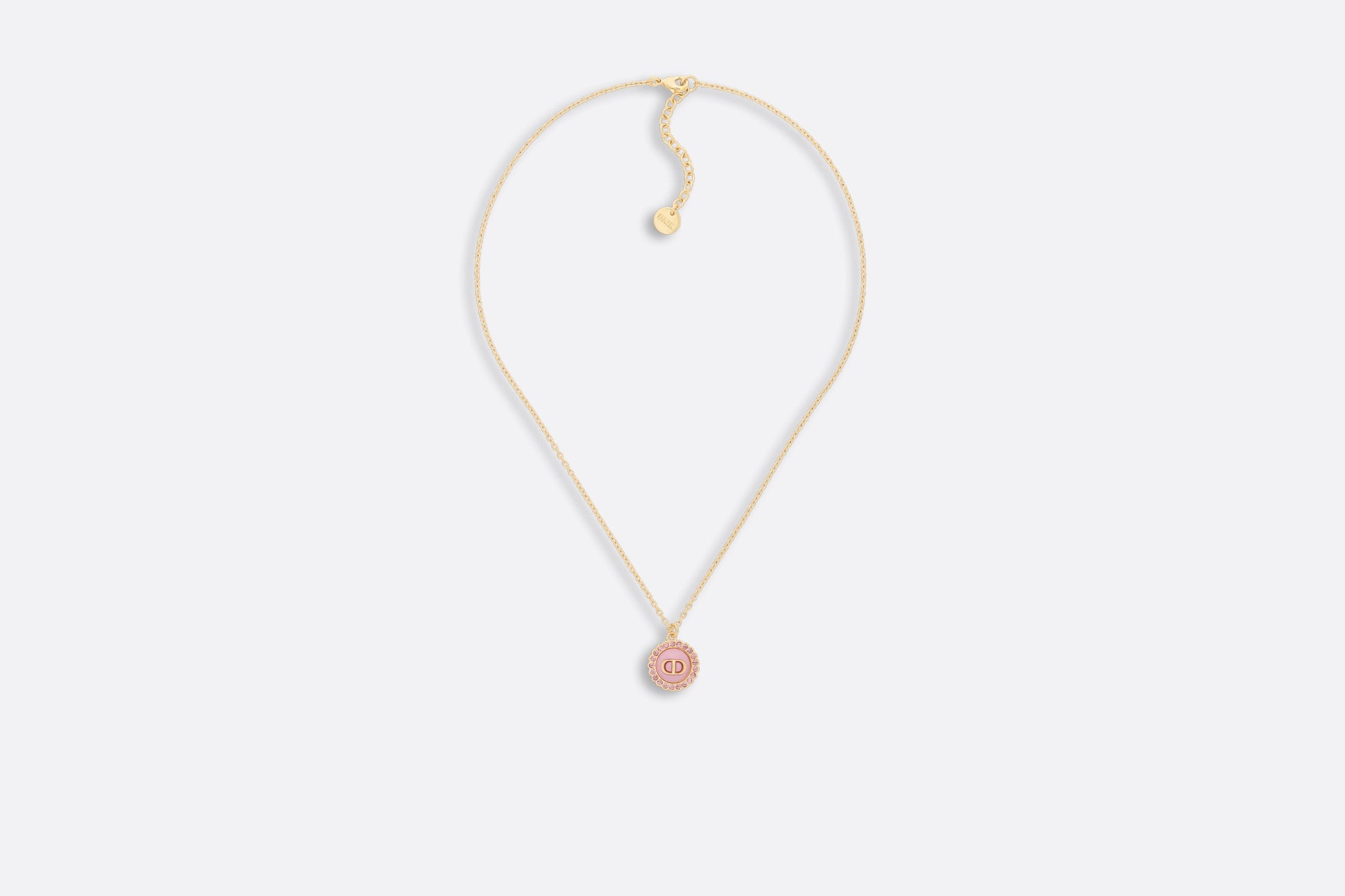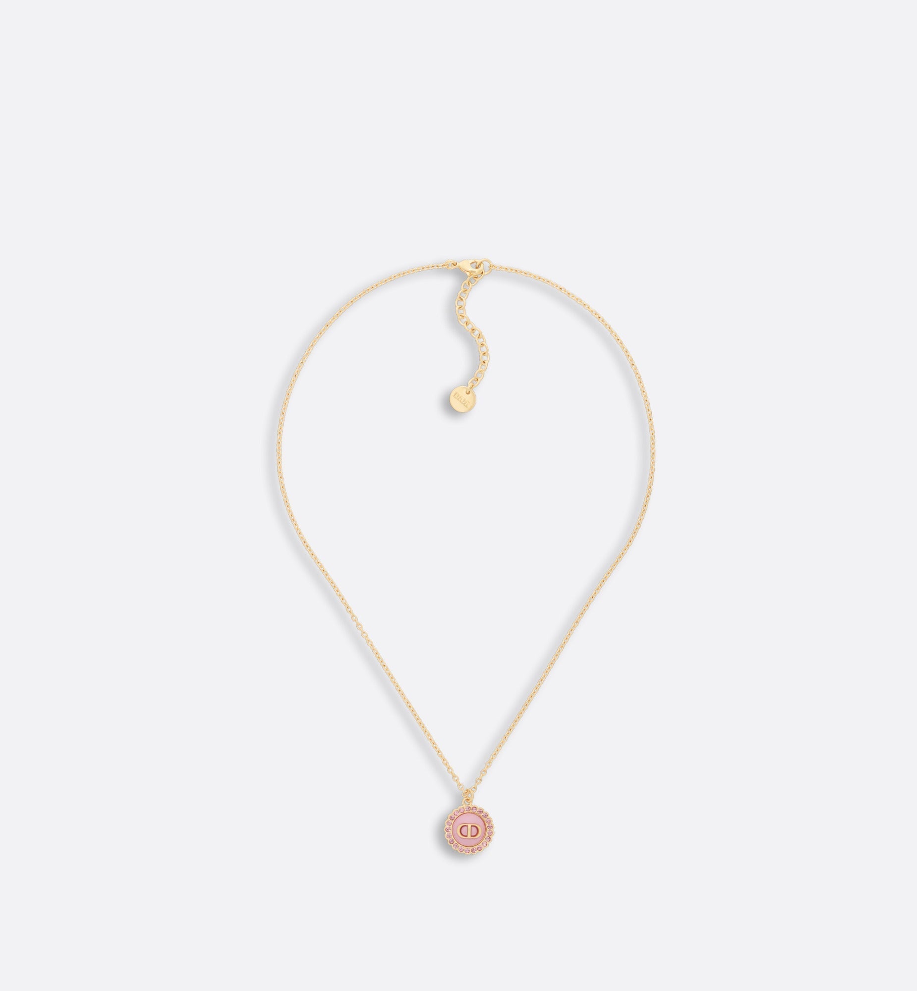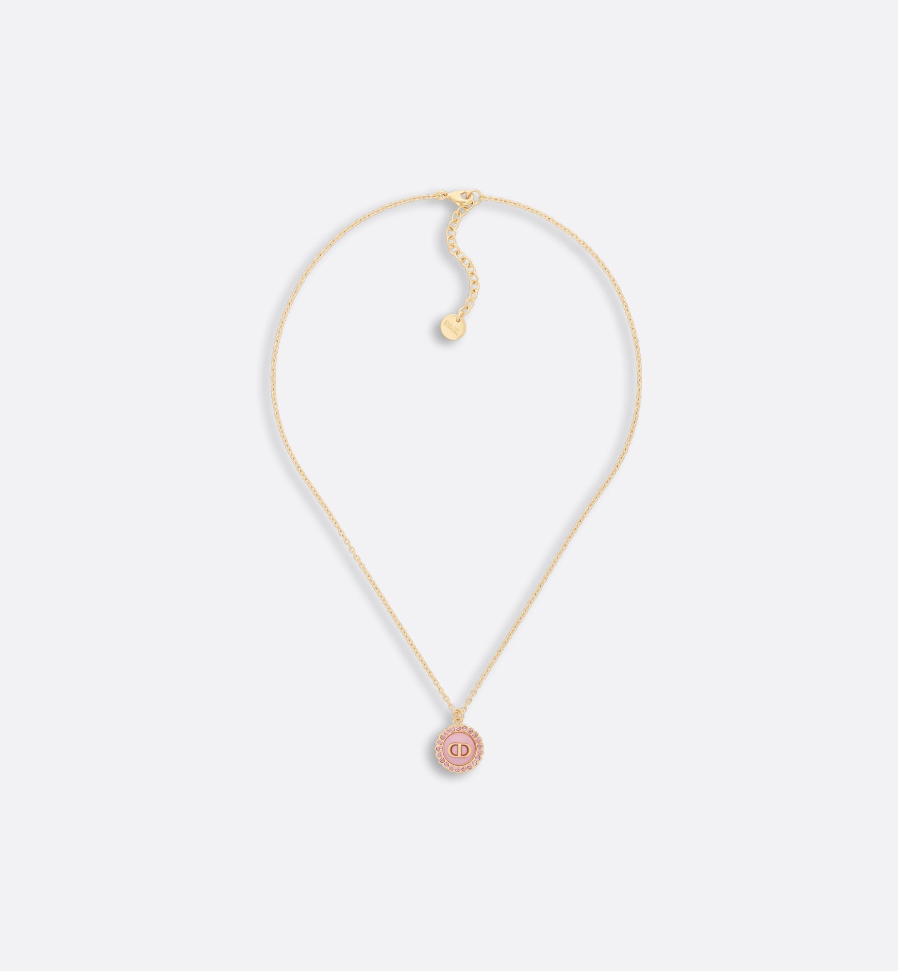 The Petit CD necklace is an elegant and colorful creation. The thin chain crafted in gold-finish metal showcases a light pink glass cabochon adorned with the CD signature and delicately encircled by pink crystals. The sophisticated necklace can be worn with other creations from the Petit CD line.