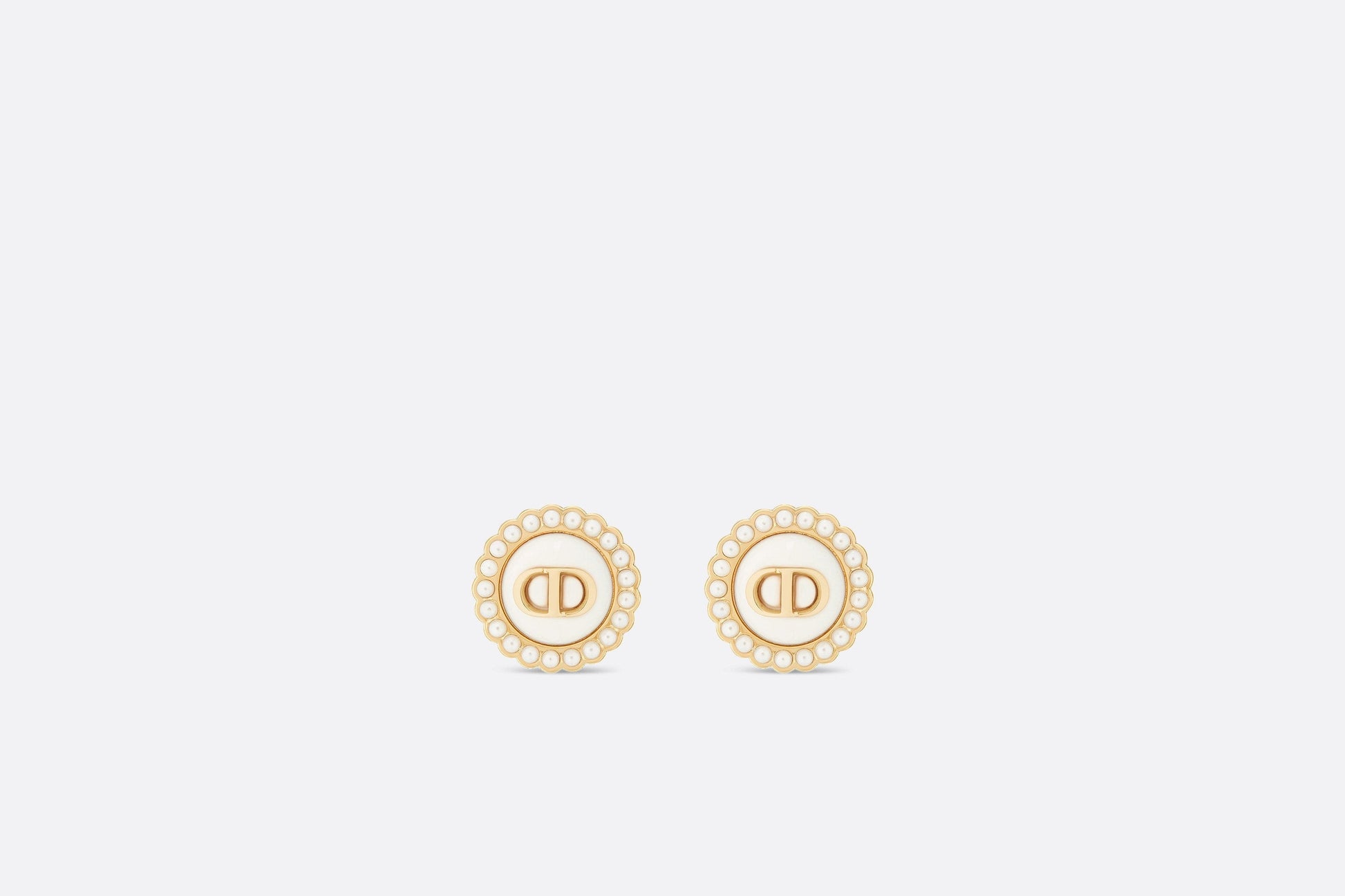 The Petit CD studs boast an elegant and colorful style. Finely crafted in gold-finish metal, they are composed of a latte glass cabochon delicately encircled with white resin pearls and enhanced by a CD signature. The earrings can be worn with other creations from the Petit CD line.
