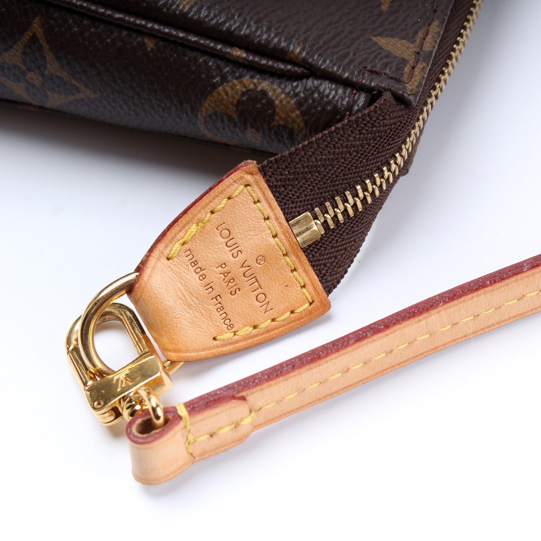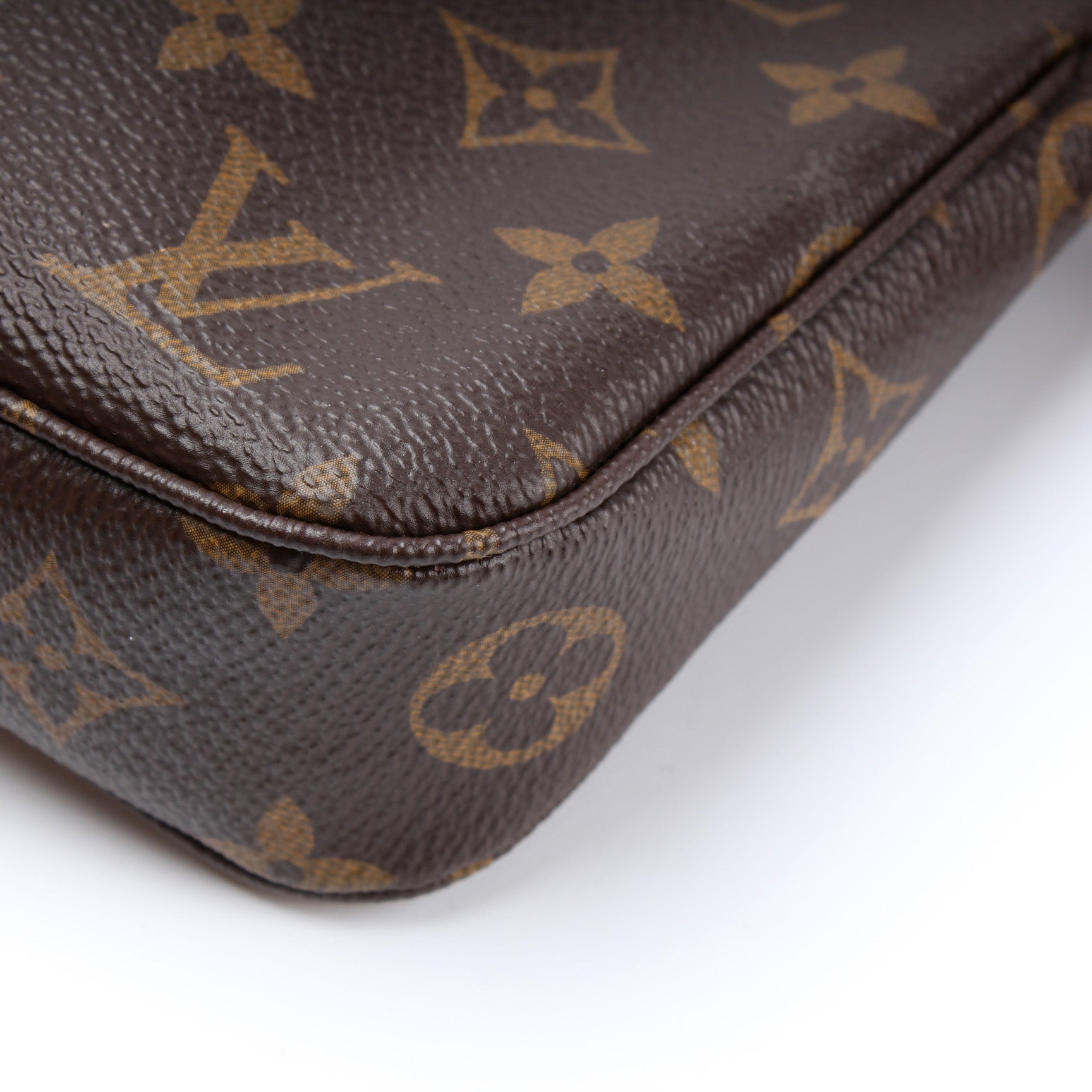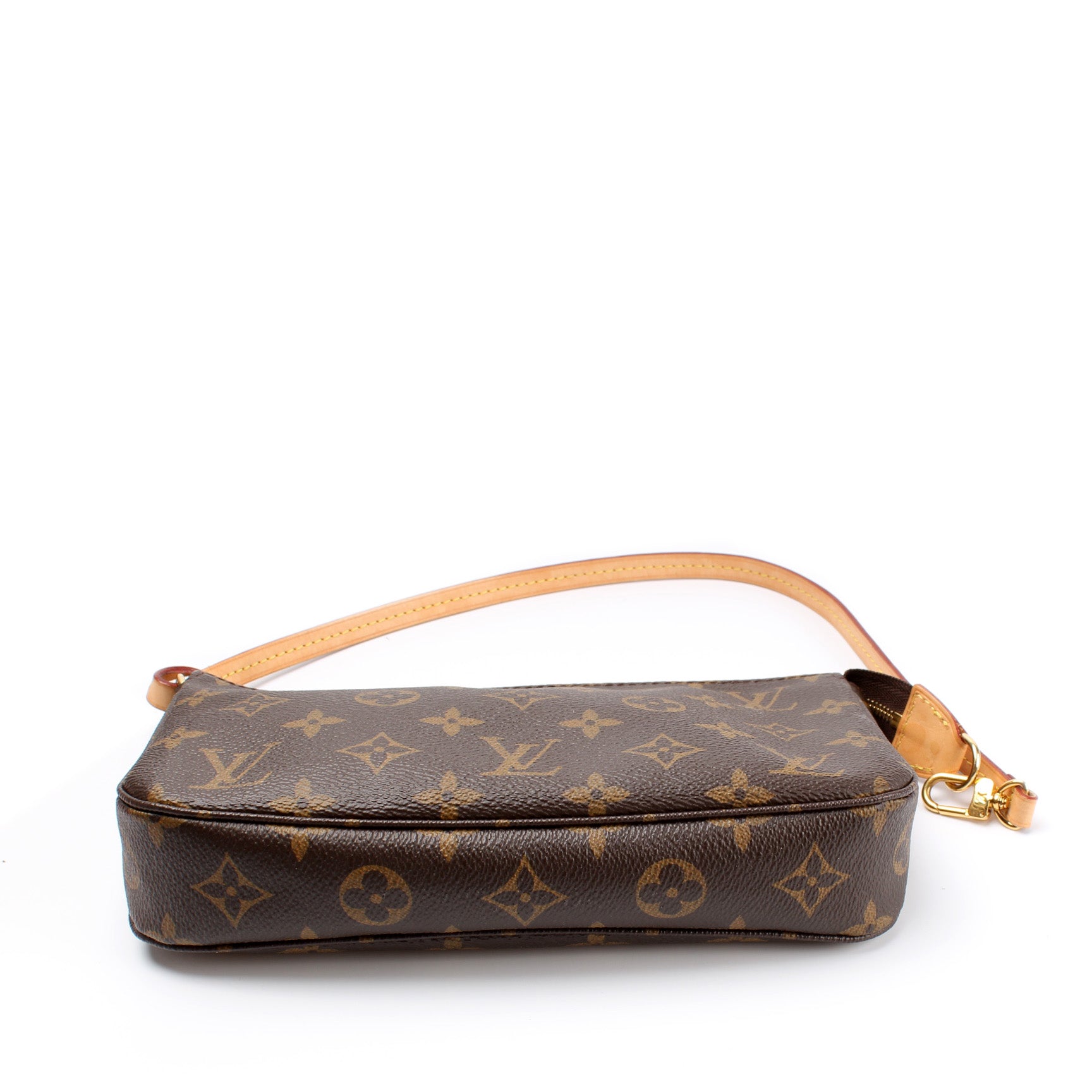 This Louis Vuitton Pochette Accessoires is guaranteed 100% . The exterior is in the classic Monogram coated canvas.