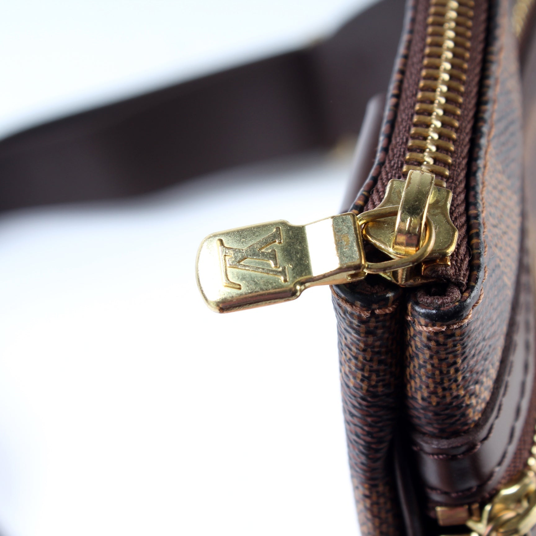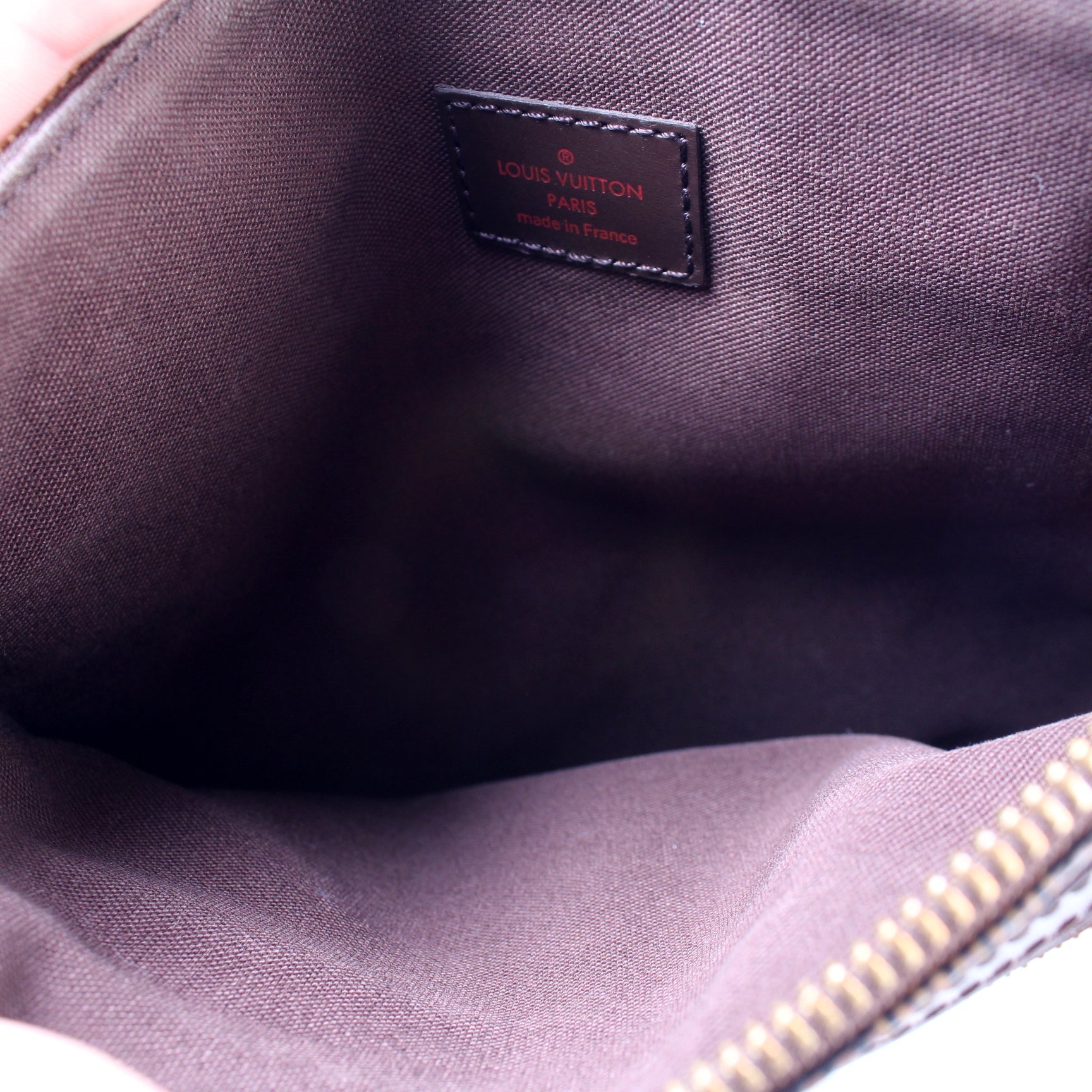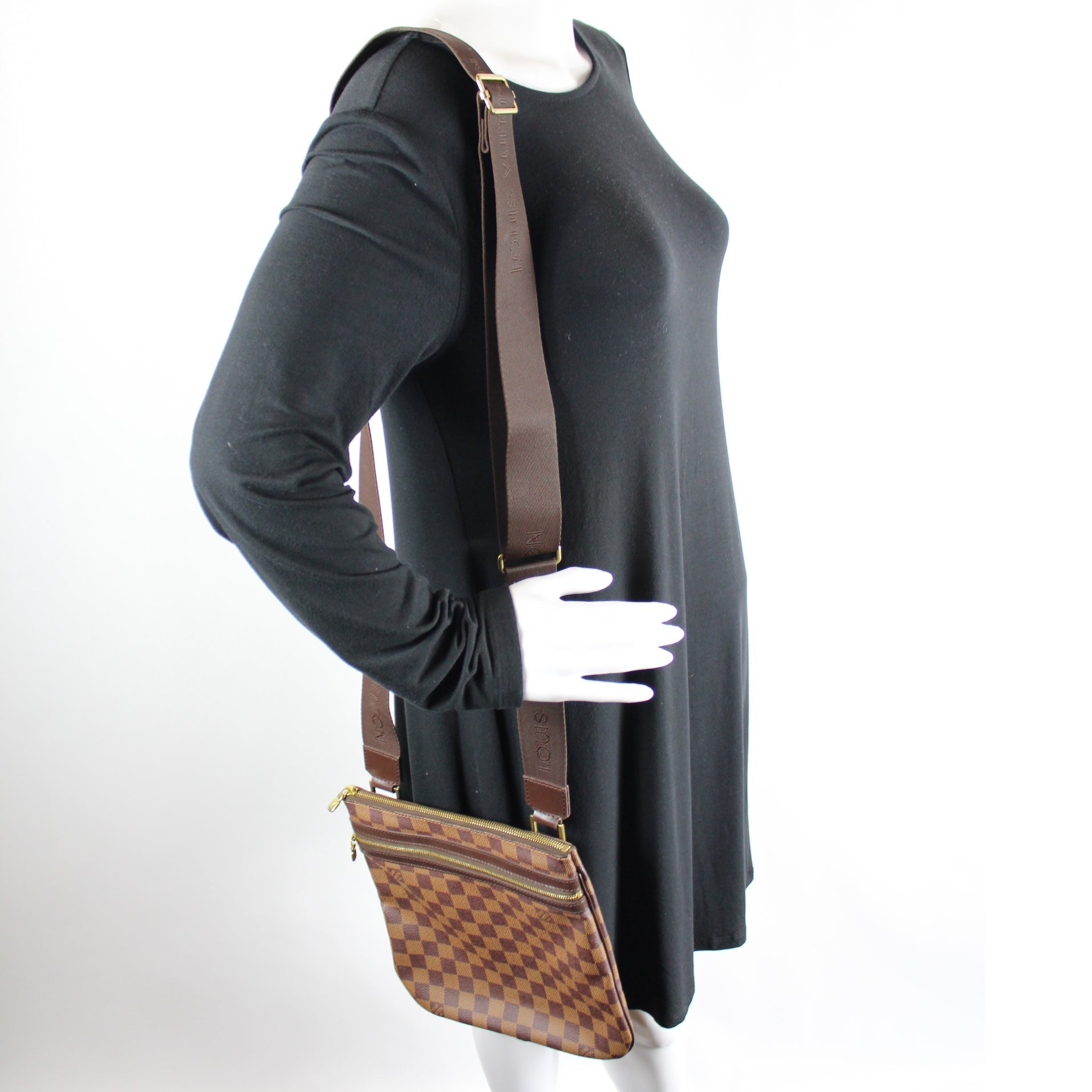 This Louis Vuitton Pochette Bosphore is guaranteed 100% . The exterior is in the classic Louis Vuitton Damier Ebene coated canvas.