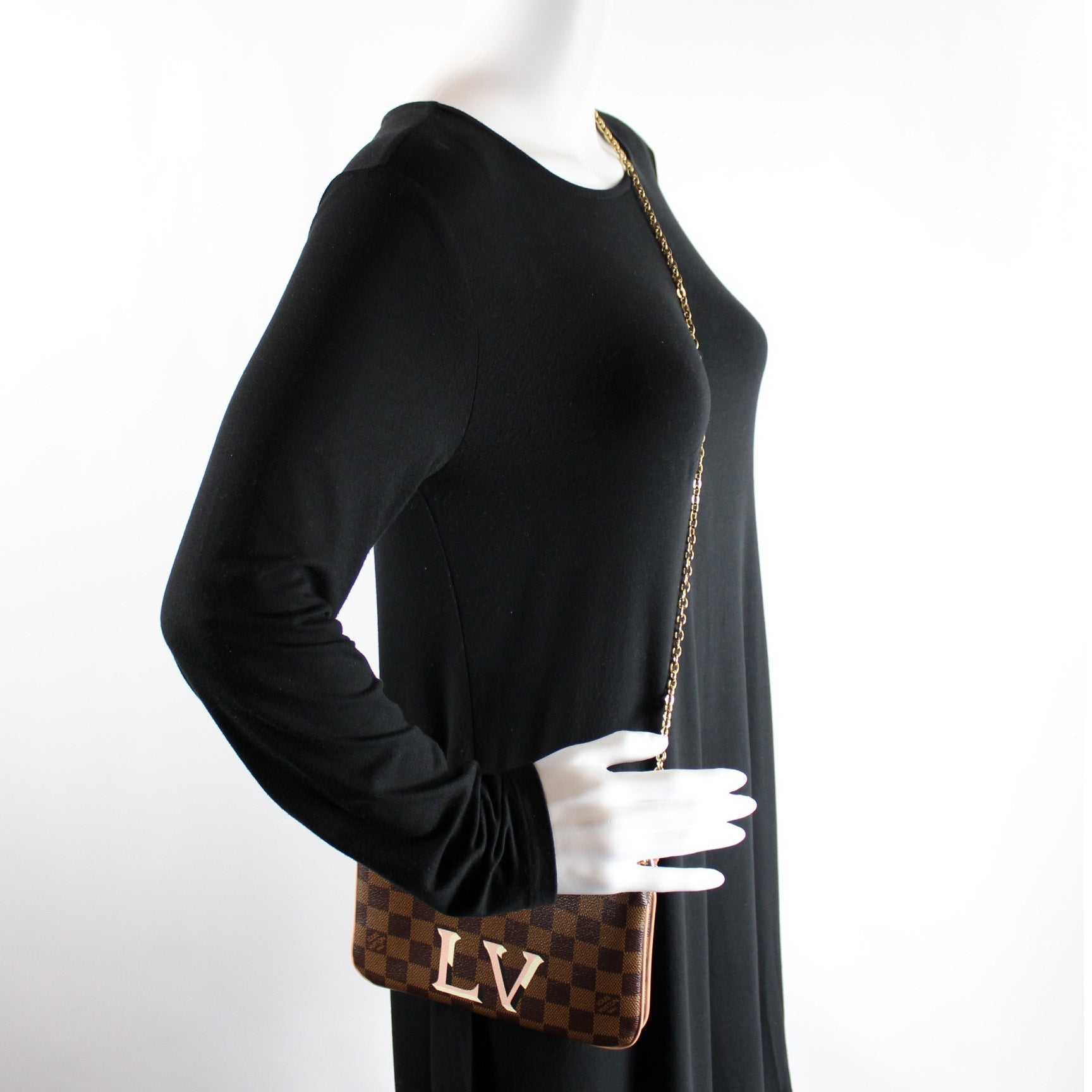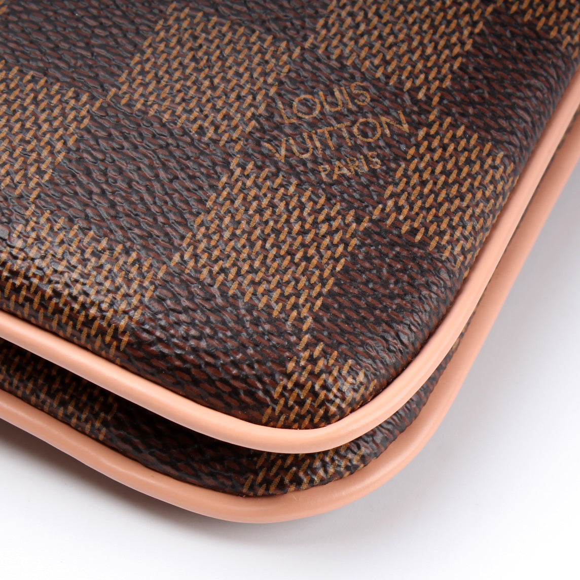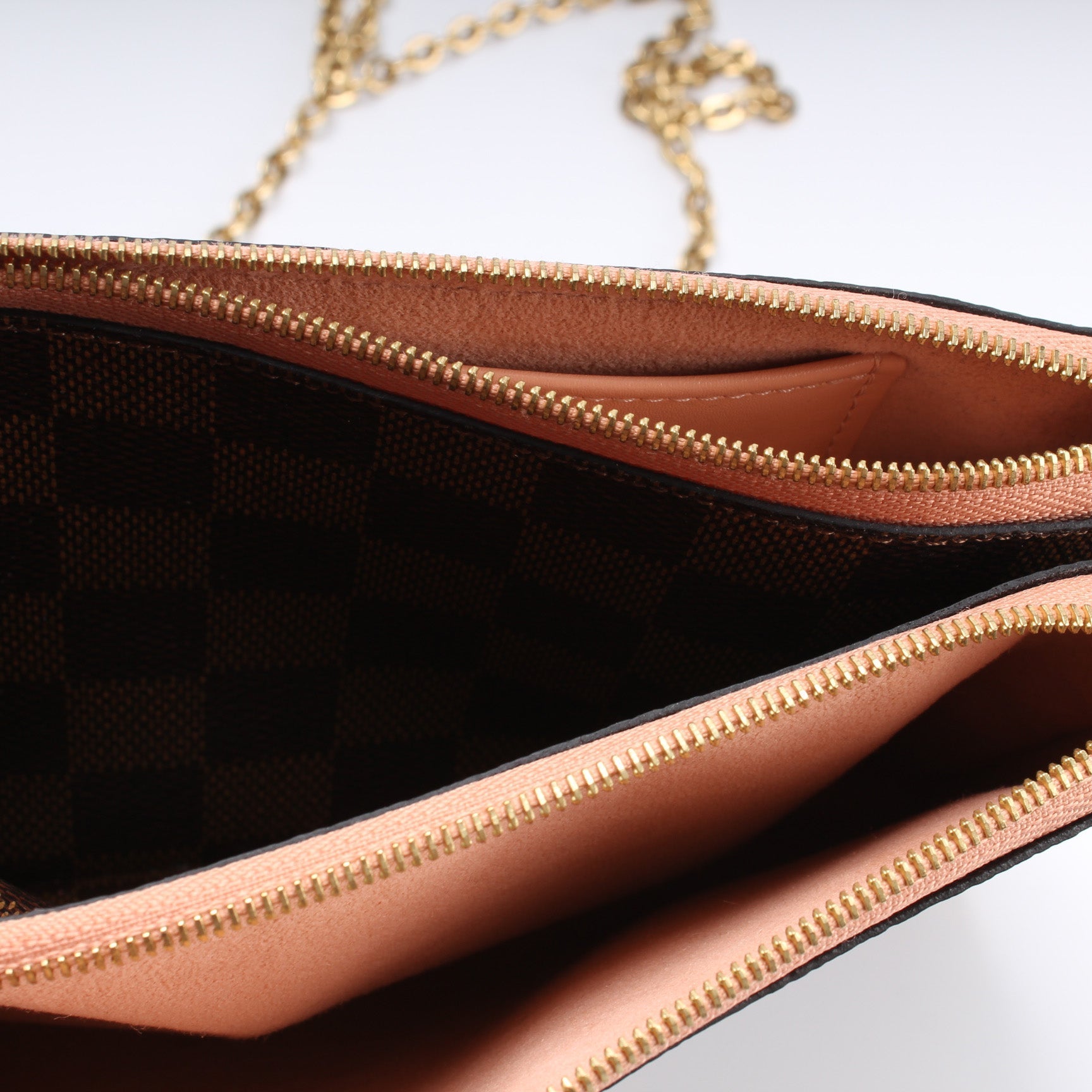 This Louis Vuitton Double Zip Pochette is guaranteed 100% . The exterior is in the classic Louis Vuitton Damier Ebene coated canvas.