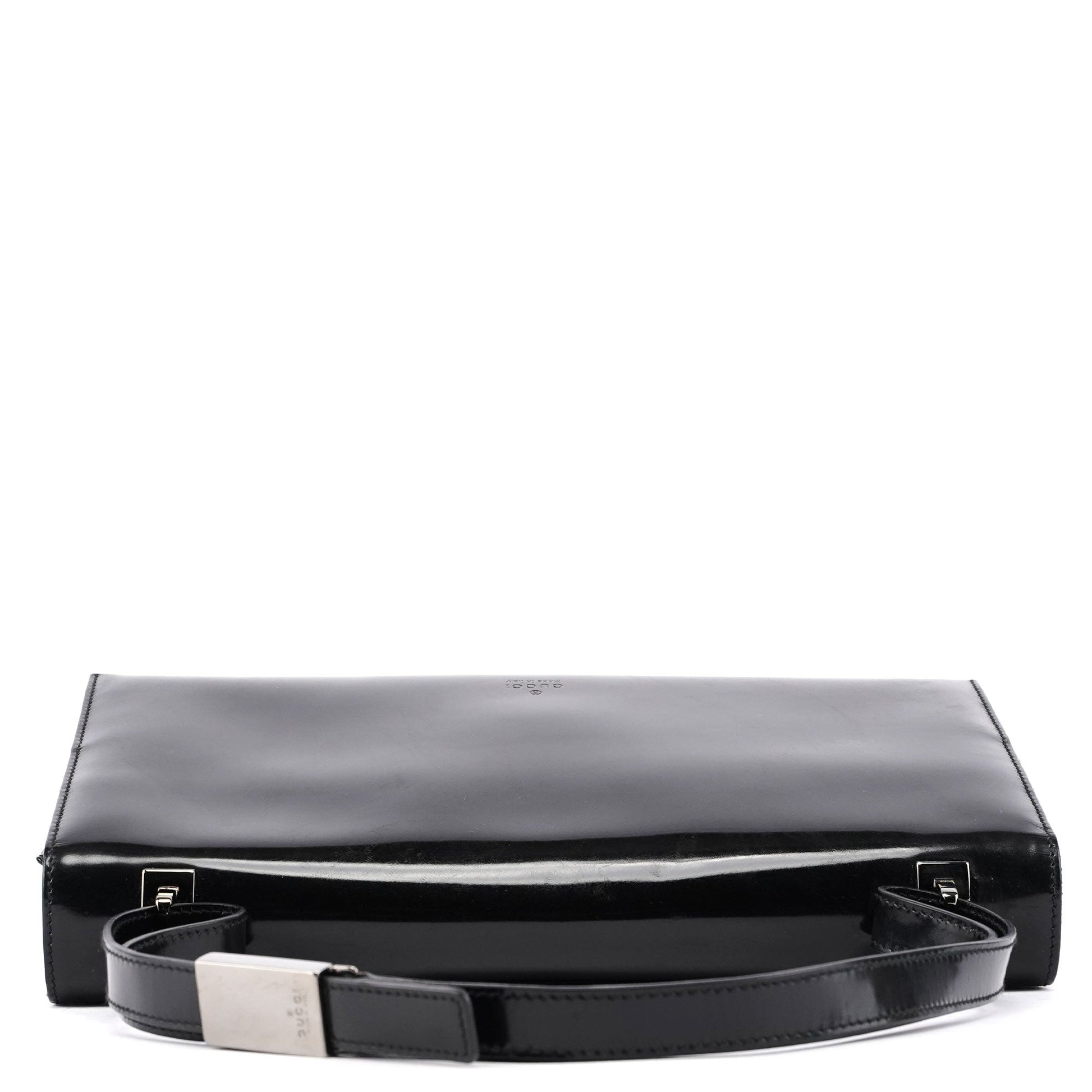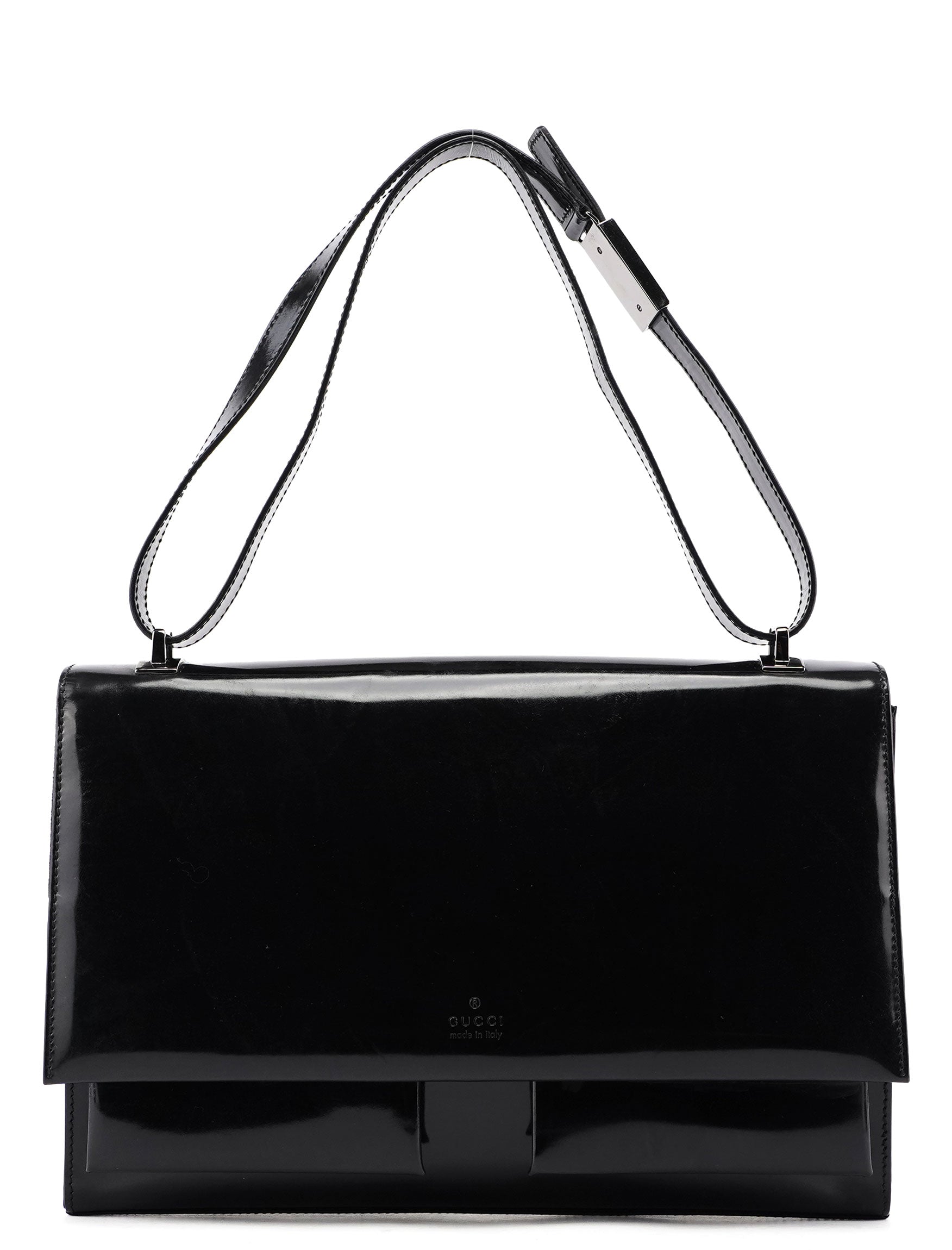 Handcrafted from black patent leather, this Gucci Spazzolato bag by Tom Ford from the late 1990s features silver-tone hardware engraved with the Gucci logo and a back pocket. The interior is lined in suede with an interior zipper pocket and compartments, and the Gucci logo is embossed on the front flap, showcasing timeless elegance.