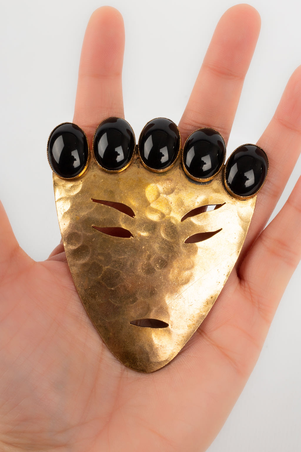 CHANEL -Rare broche en métal doré martelé ornée de cabochons en pâte de verre figurant un visage.