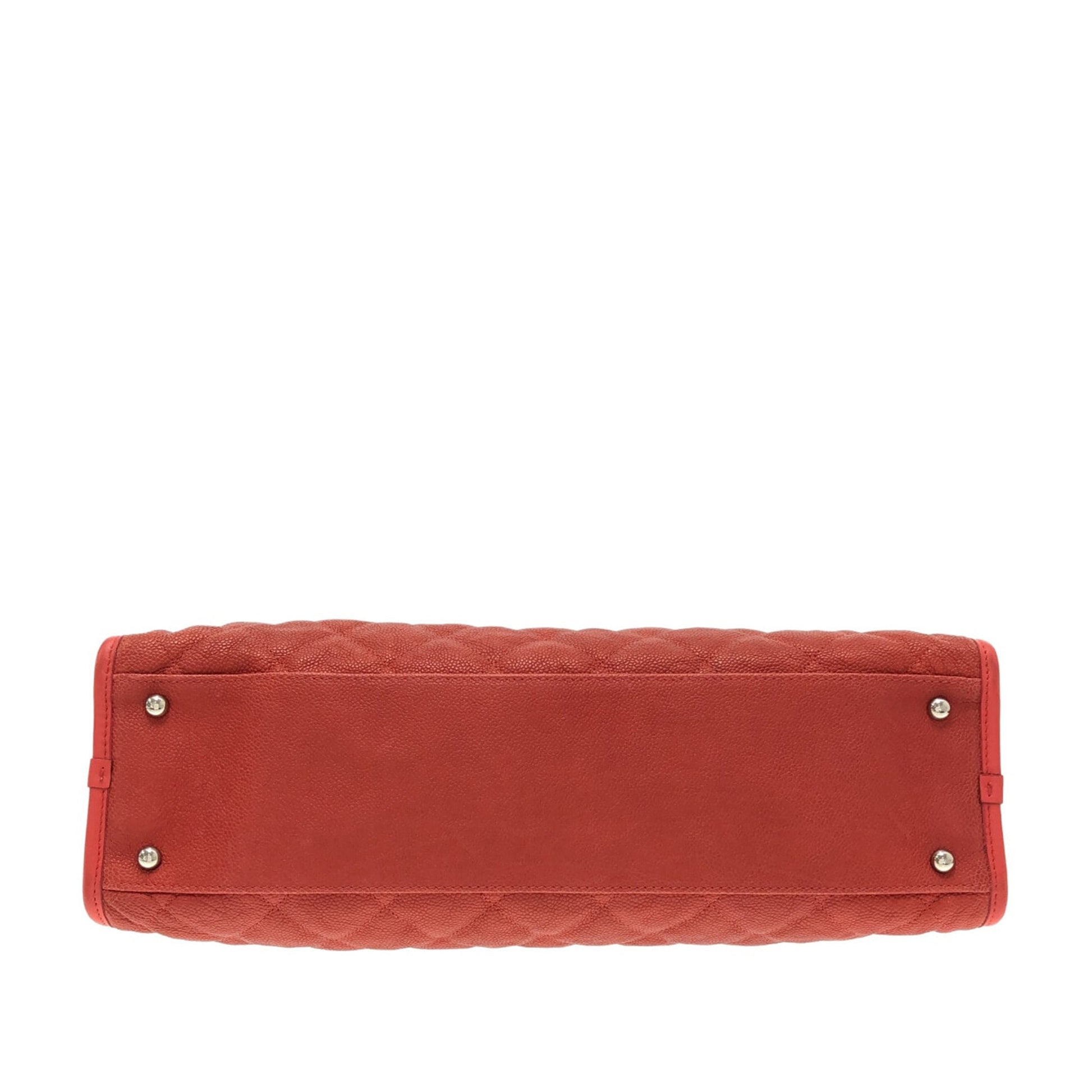 Product Details: Red Chanel Caviar French Riviera Tote. This tote bag features a caviar leather body, leather woven chain straps, an open top with magnetic snap button closure, an interior zip compartment, and interior zip and slip pockets. 9.4" L x 14.6" W x 4.7" D.
