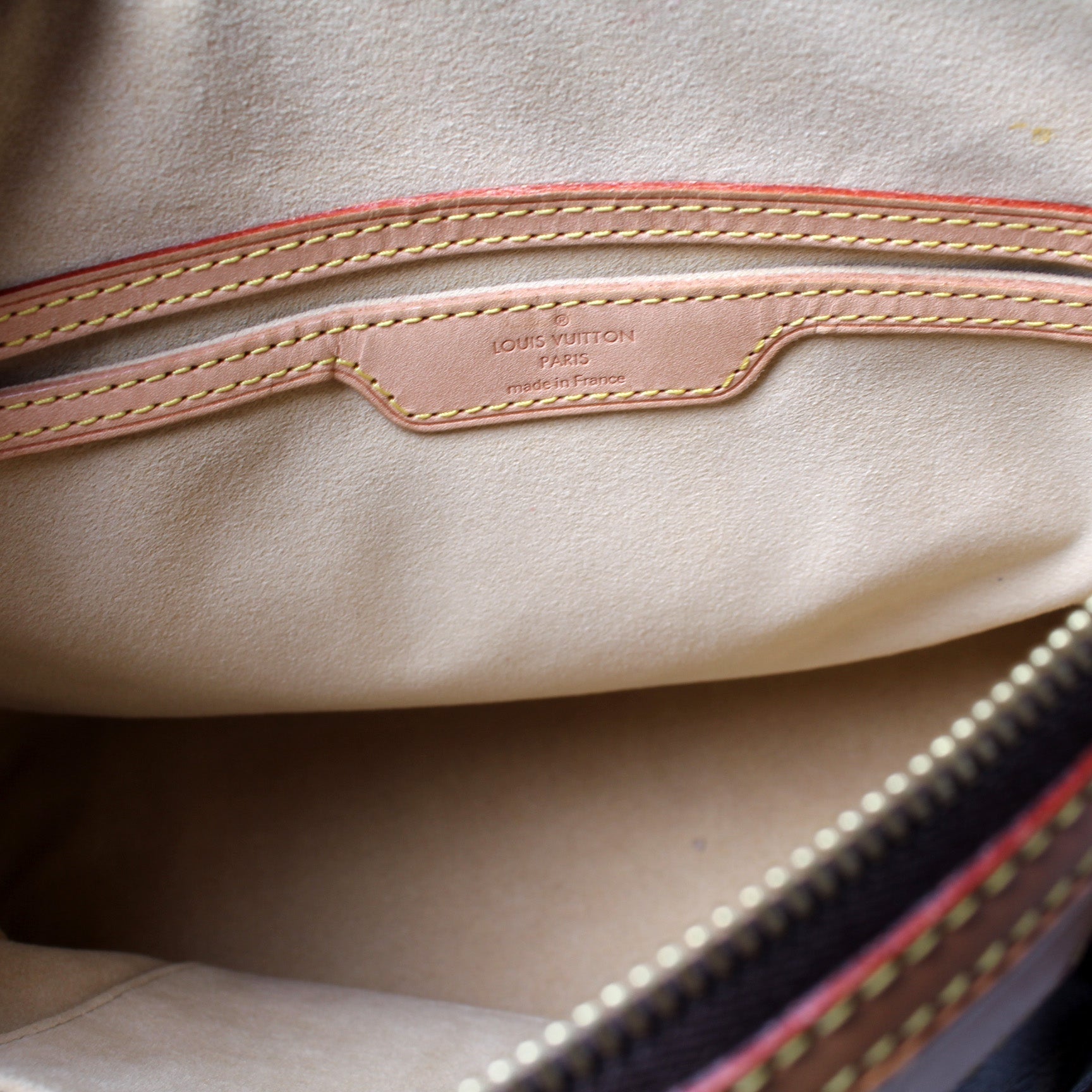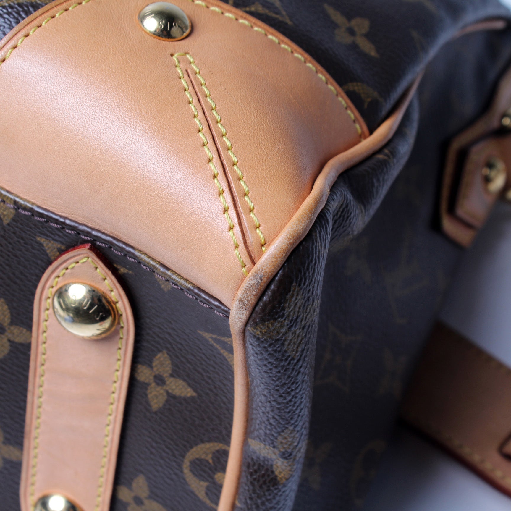 Exterior: The exterior canvas is free of any rips or cracks. The corners and leather details show signs of wear and discoloration as pictured.
