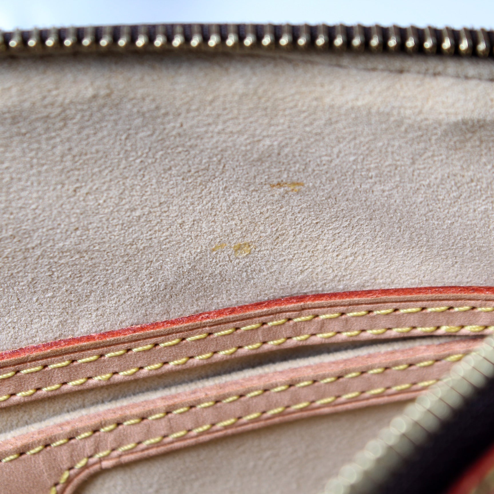 Hardware: The zipper operates properly and runs smoothly. The hardware has discoloration and signs of wear.