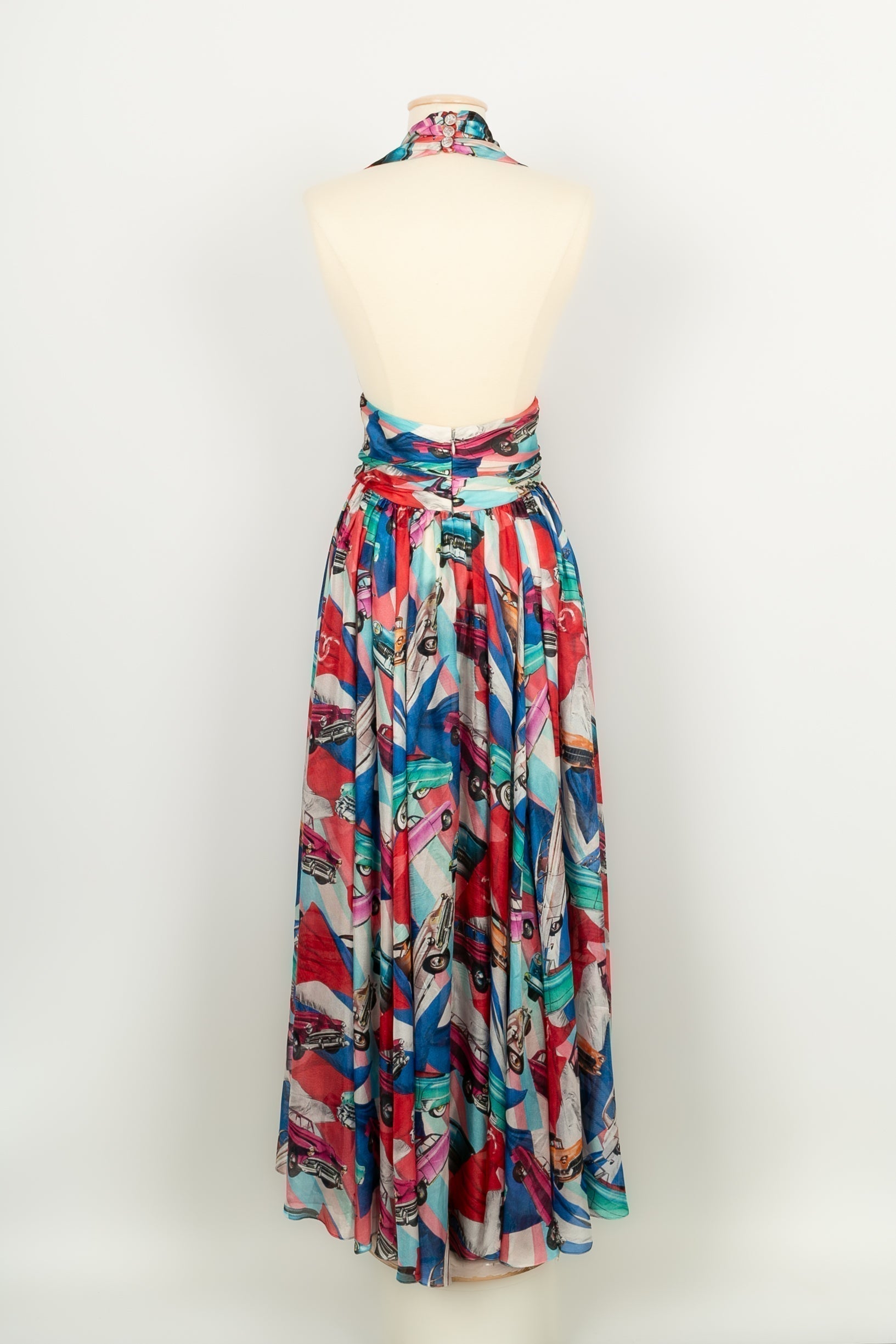 CHANEL - (Made in France) Robe longue en soie dans les tons de rouge, bleu et de vert. Taille 34FR. Collection Paris-Cuba Croisière 2017.