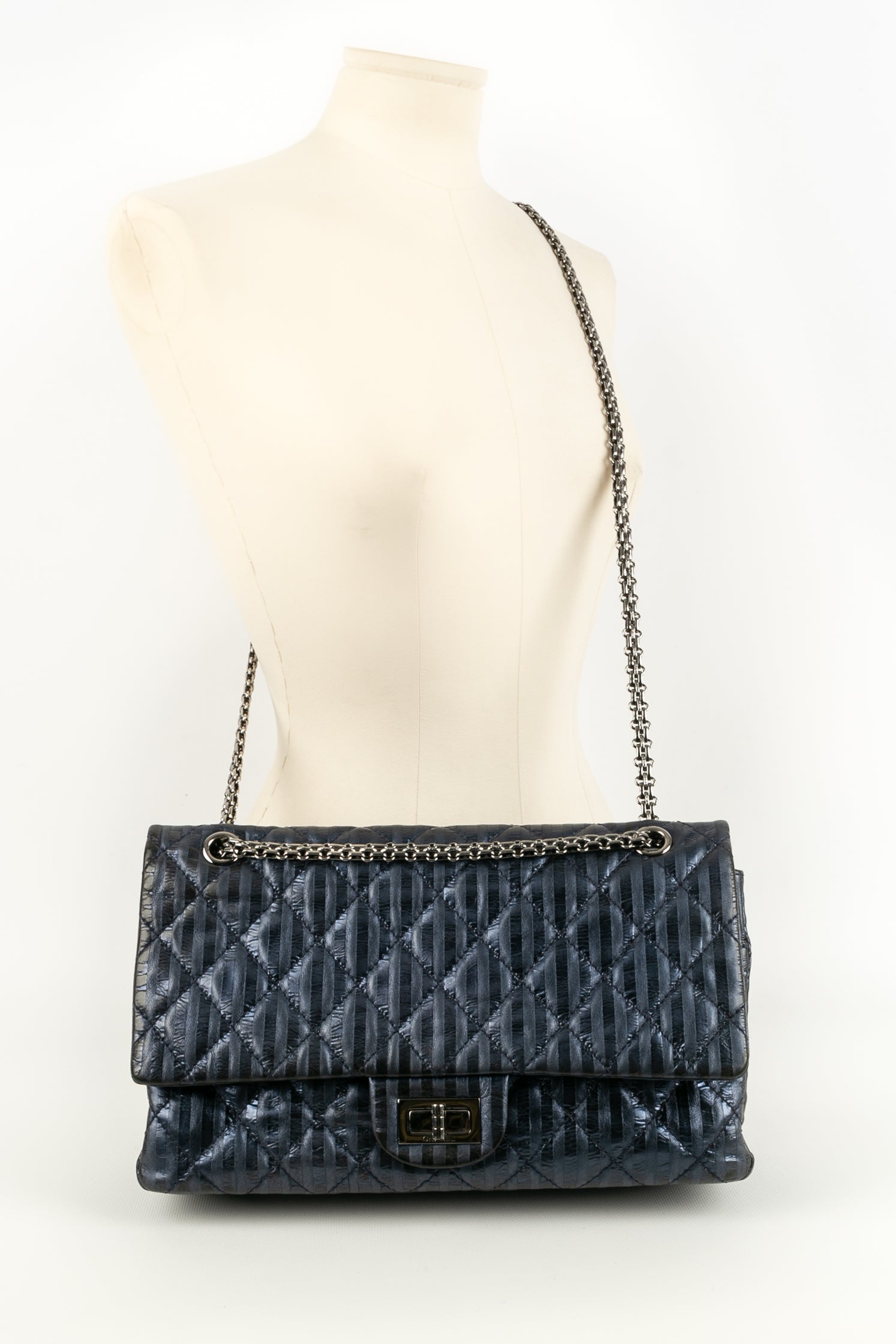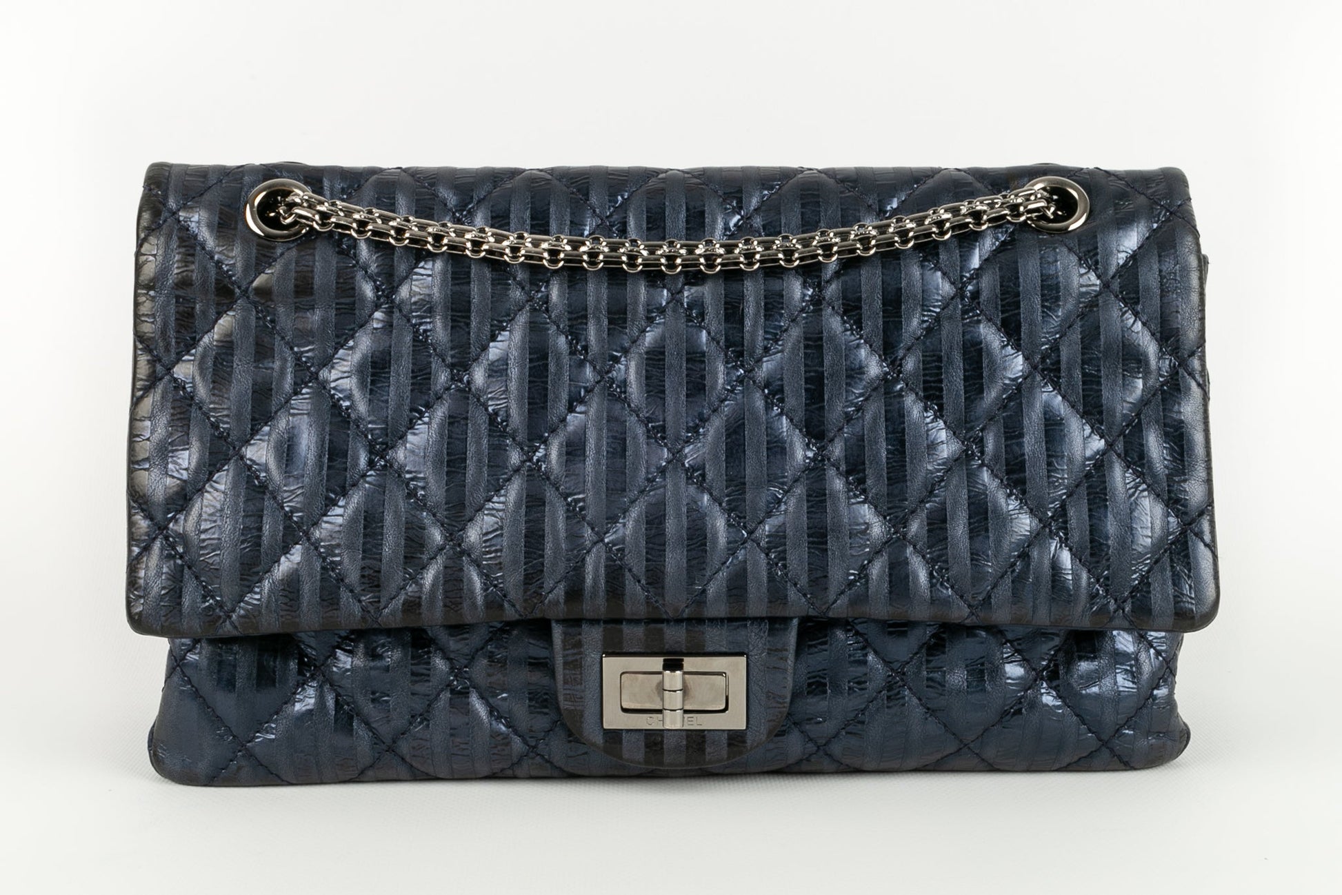 CHANEL -(Made in France) Sac en cuir bleu métallisé modèle 2.55. Attributs en métal argenté foncé. Numéro de série et carte d'ité présents. Collection 2008/09.