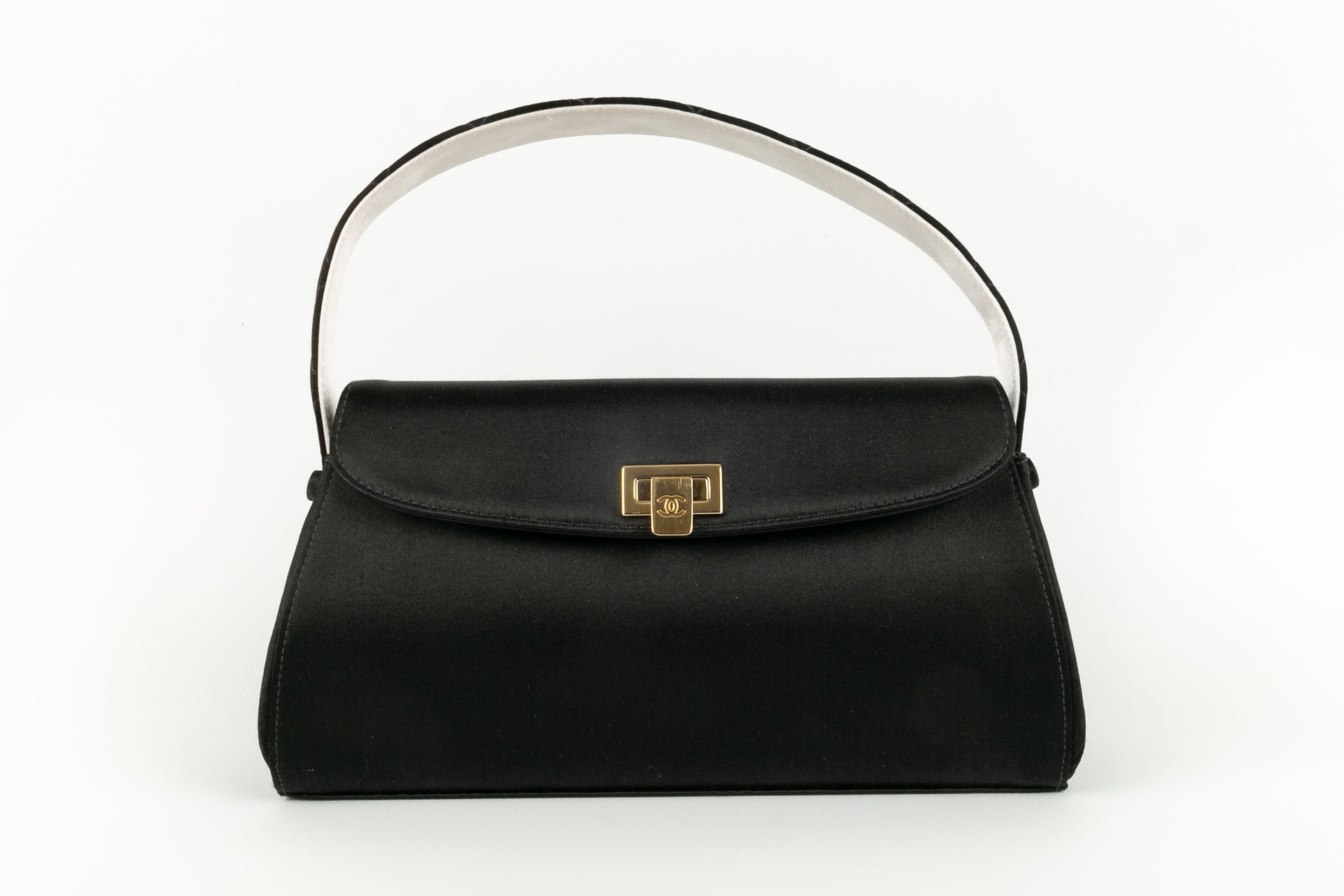 CHANEL - (Made in France) Sac en satin noir et cuir à double compartiments. Numéro de série et carte d'ité présents. Collection 2002/03.