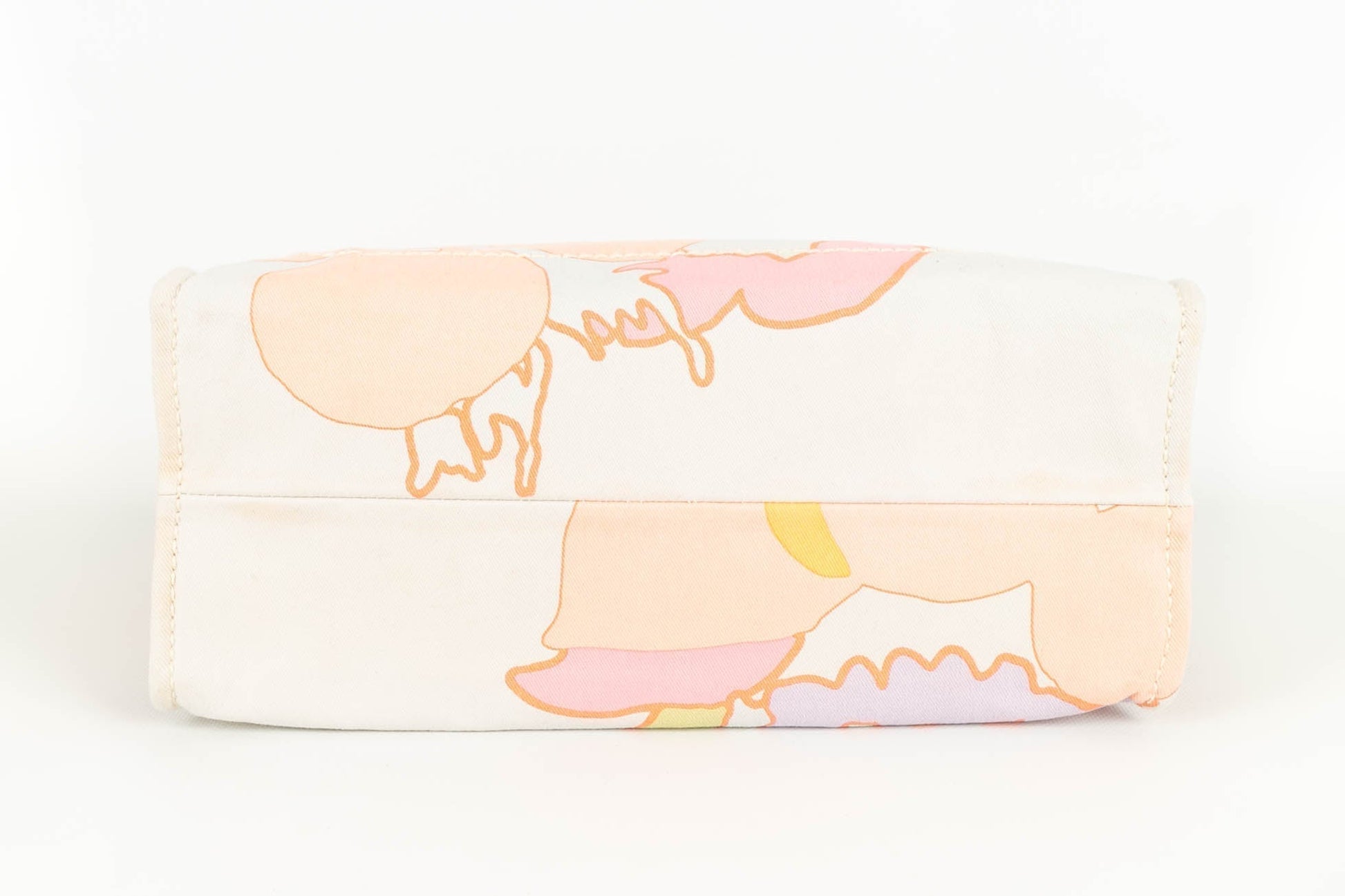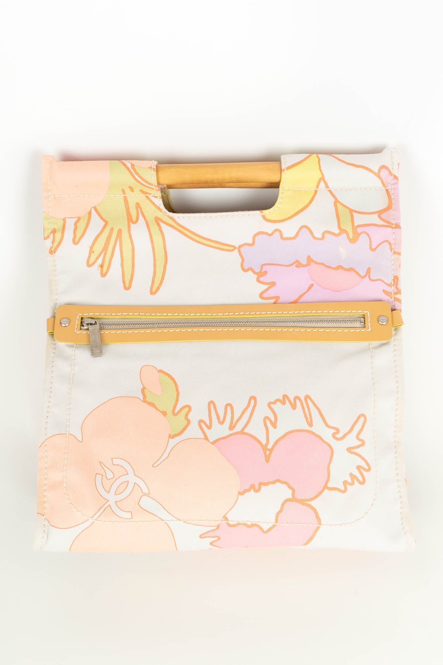 CHANEL - (Made in Italy) Sac en toile multicolore, cuir et anses en bois. Il est accompagné d'un foulard en étamine de coton. Numéro de série et carte d'ité présents. Collection 2003/2004.