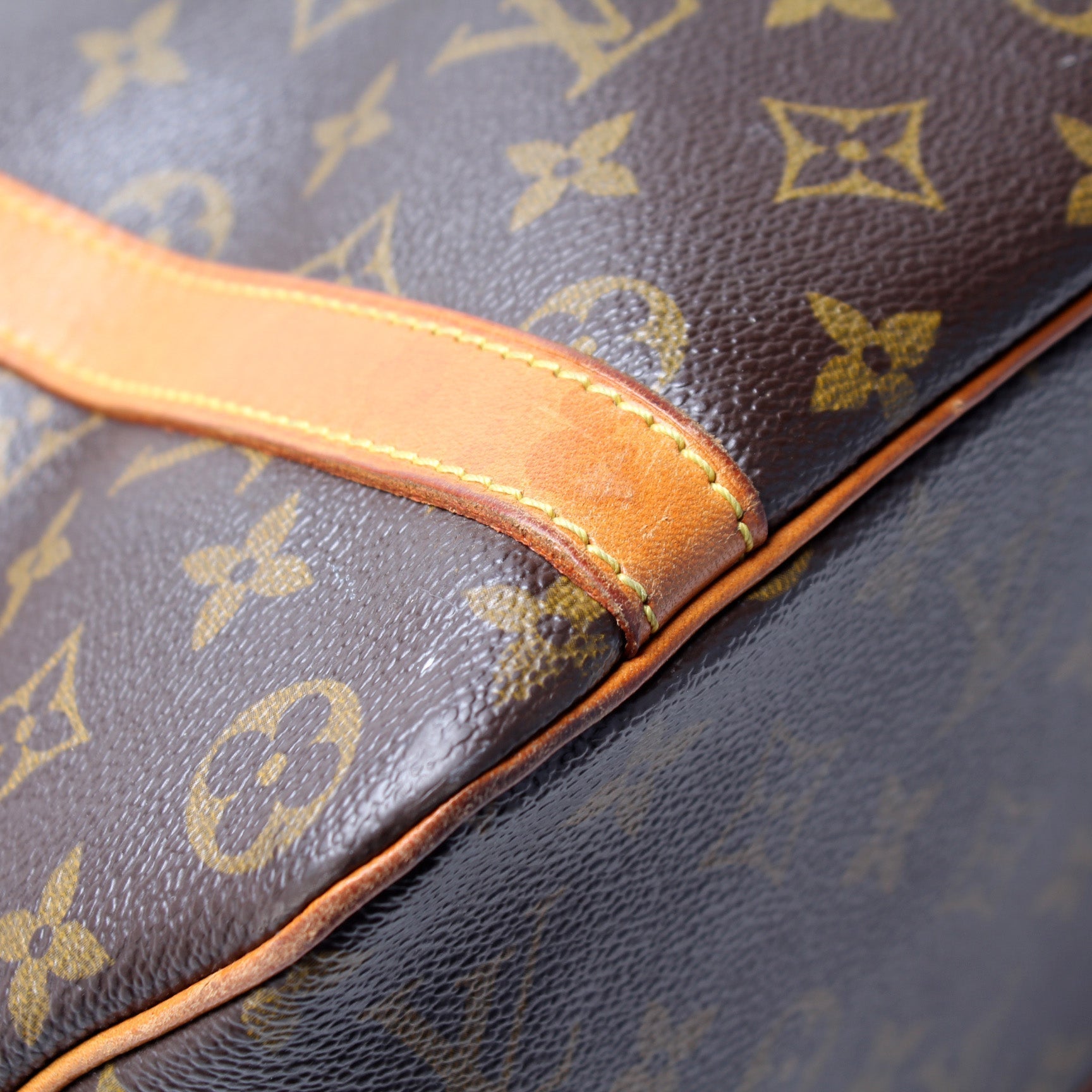 Exterior: The exterior Monogram coated canvas is free of any rips or cracks. The corners and leather details show signs of wear and discoloration.