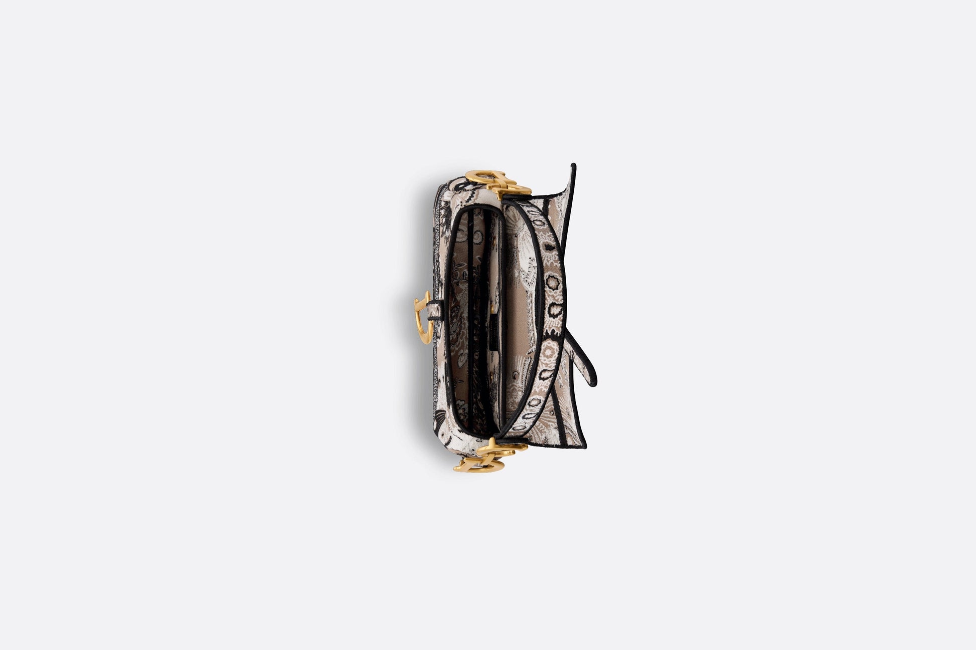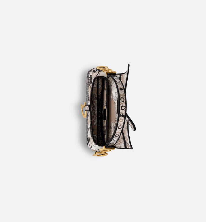 Maria Grazia Chiuri brings a fresh update to the iconic Saddle bag. Fully embroidered with a beige multicolor Butterfly Bandana motif, combining the butterfly and the timeless Bandana pattern in a graphic style, it is enhanced by the Christian Dior Paris signature on the front. The legendary style has a Saddle flap with a D stirrup clasp on a magnetic strap with pulls, as well as an antique gold-finish metal CD signature on each side of the handle. The bag can be carried by hand or worn over the shoulder and may be customized with different shoulder straps.