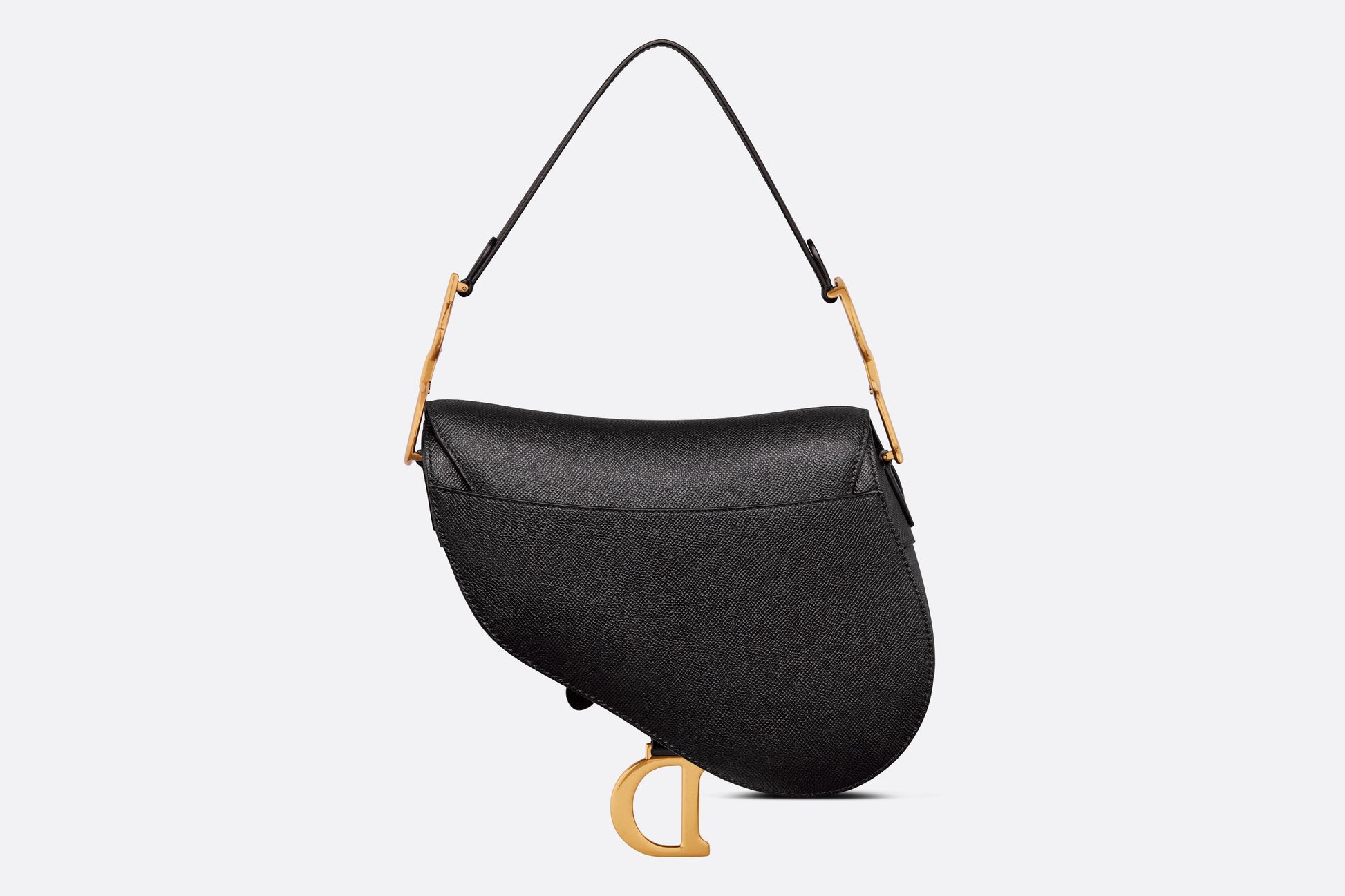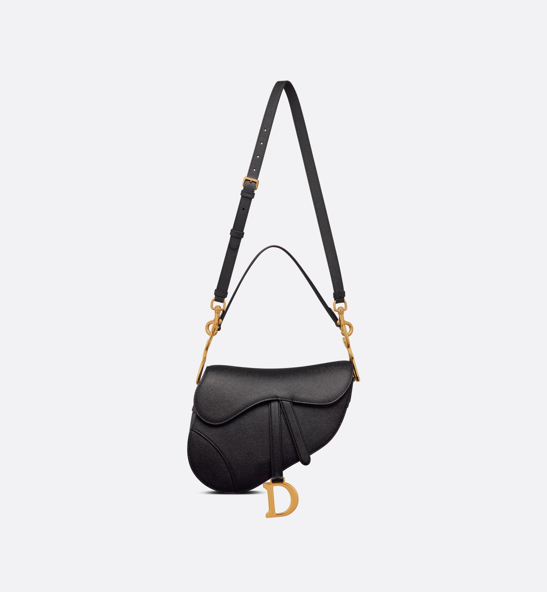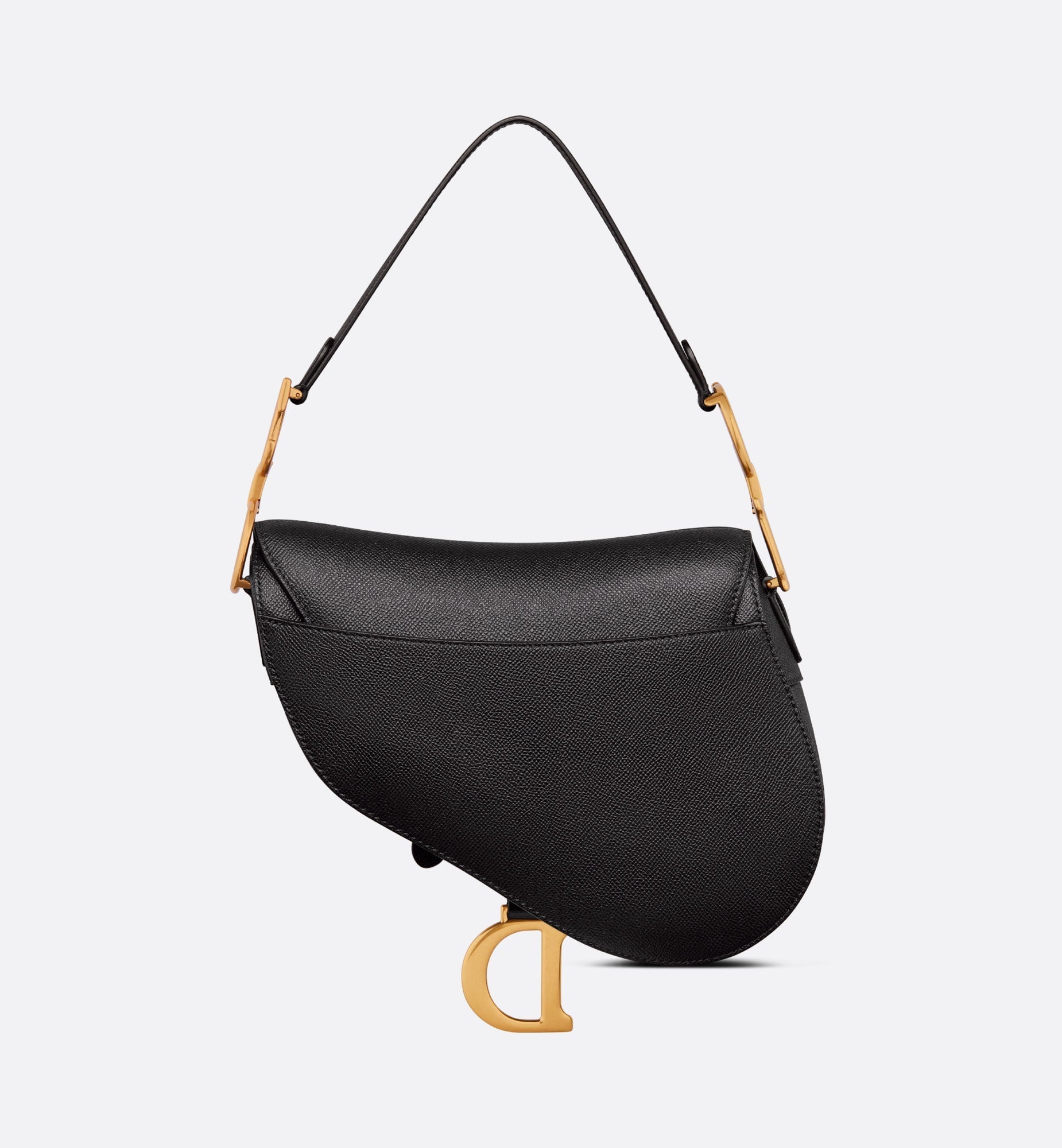 Maria Grazia Chiuri brings a fresh update to the iconic Saddle bag. Crafted in black grained calfskin, the legendary design features a Saddle flap with a magnetic 'D' stirrup clasp, as well as an antique gold-finish metal 'CD' signature on either side of the strap. Featuring a thin, adjustable and removable shoulder strap, the Saddle bag may be carried by hand, worn over the shoulder or crossbody.
