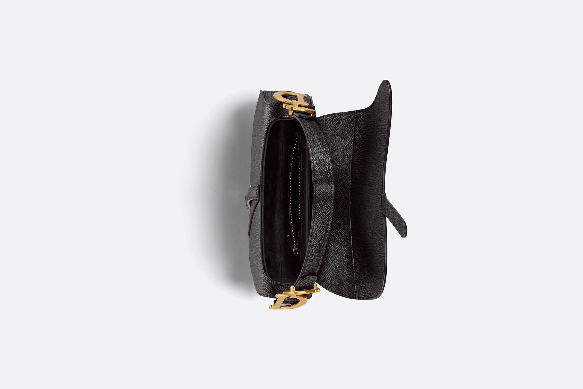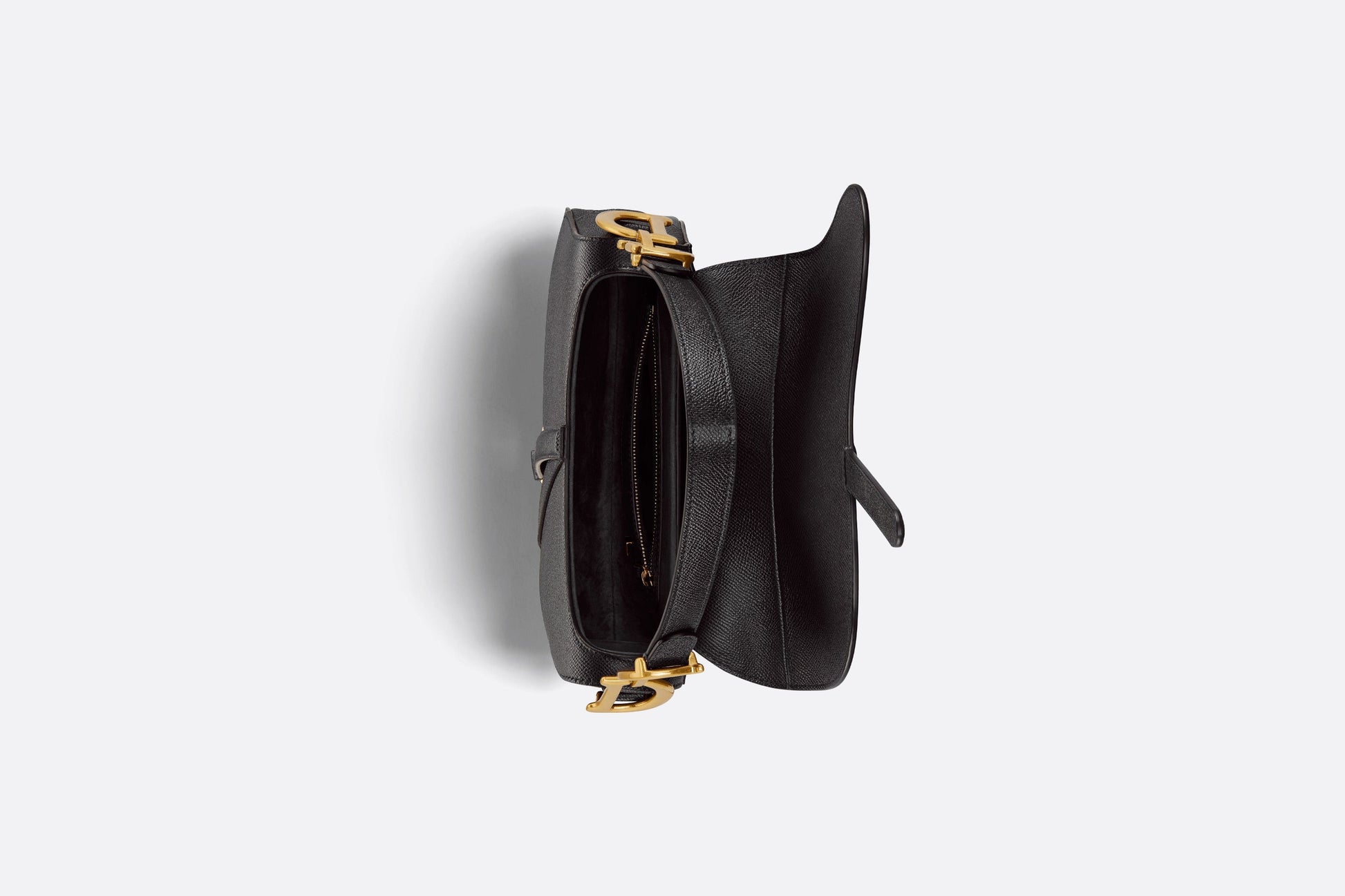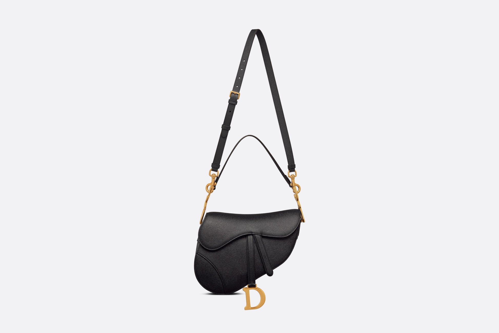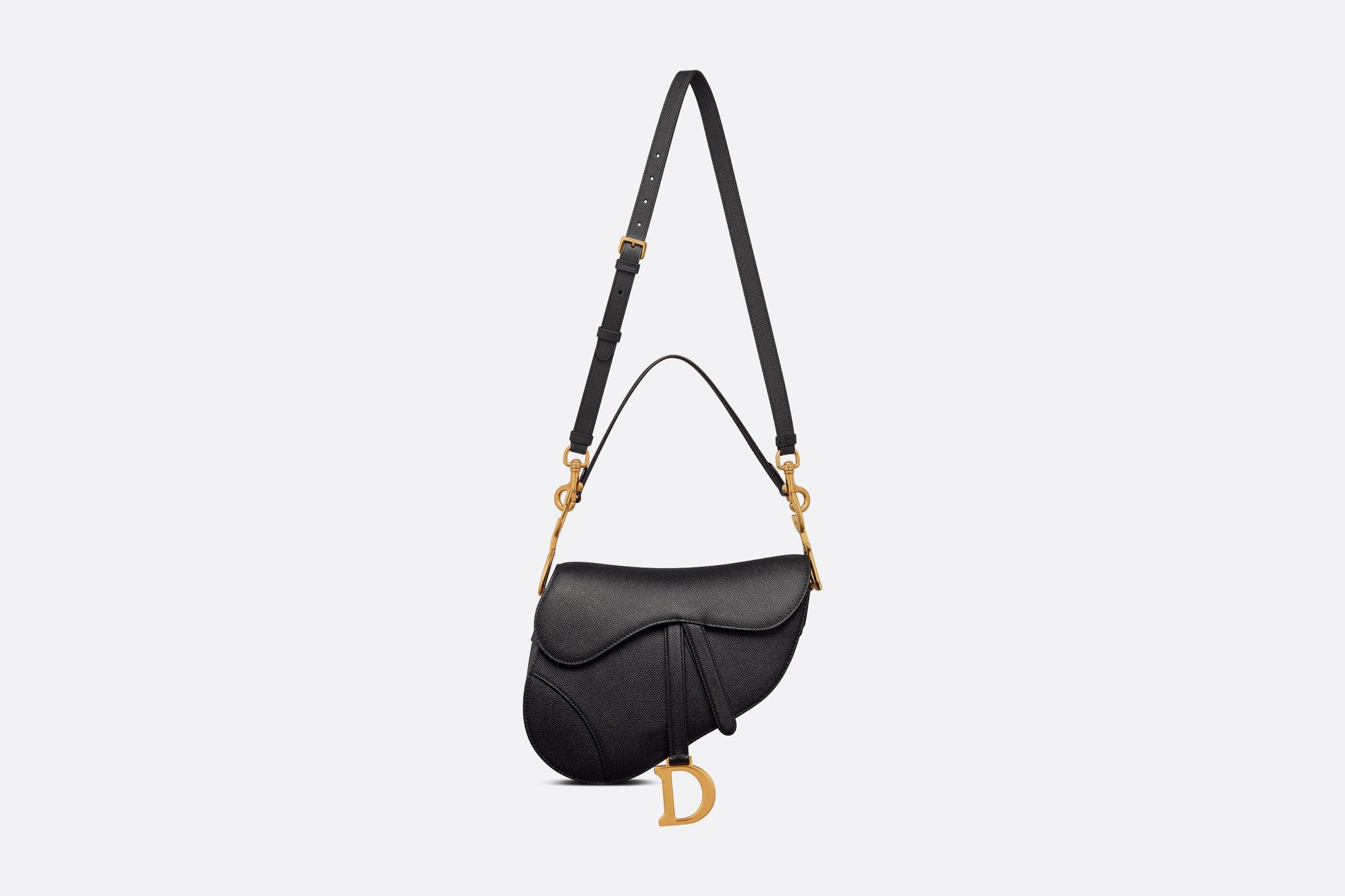 Maria Grazia Chiuri brings a fresh update to the iconic Saddle bag. Crafted in black grained calfskin, the legendary design features a Saddle flap with a magnetic 'D' stirrup clasp, as well as an antique gold-finish metal 'CD' signature on either side of the strap. Featuring a thin, adjustable and removable shoulder strap, the Saddle bag may be carried by hand, worn over the shoulder or crossbody.