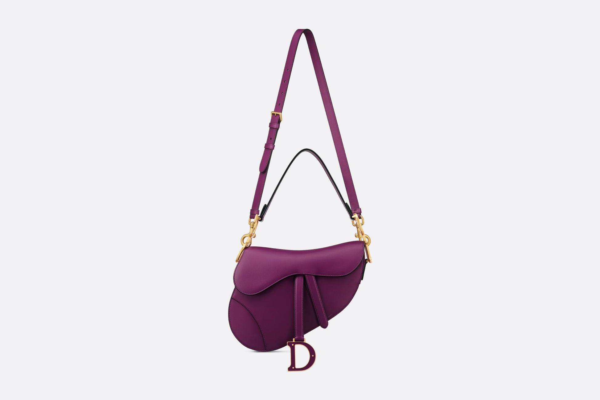 Maria Grazia Chiuri brings a fresh update to the iconic Saddle bag. Crafted in mulberry ultra-smooth calfskin, the legendary design features a Saddle flap with a D stirrup clasp on a magnetic pull, as well as an antique gold-finish metal CD signature adorned with tonal leather on either side of the strap. Equipped with a thin, adjustable and removable shoulder strap, the Saddle bag may be carried by hand, worn over the shoulder or crossbody.
