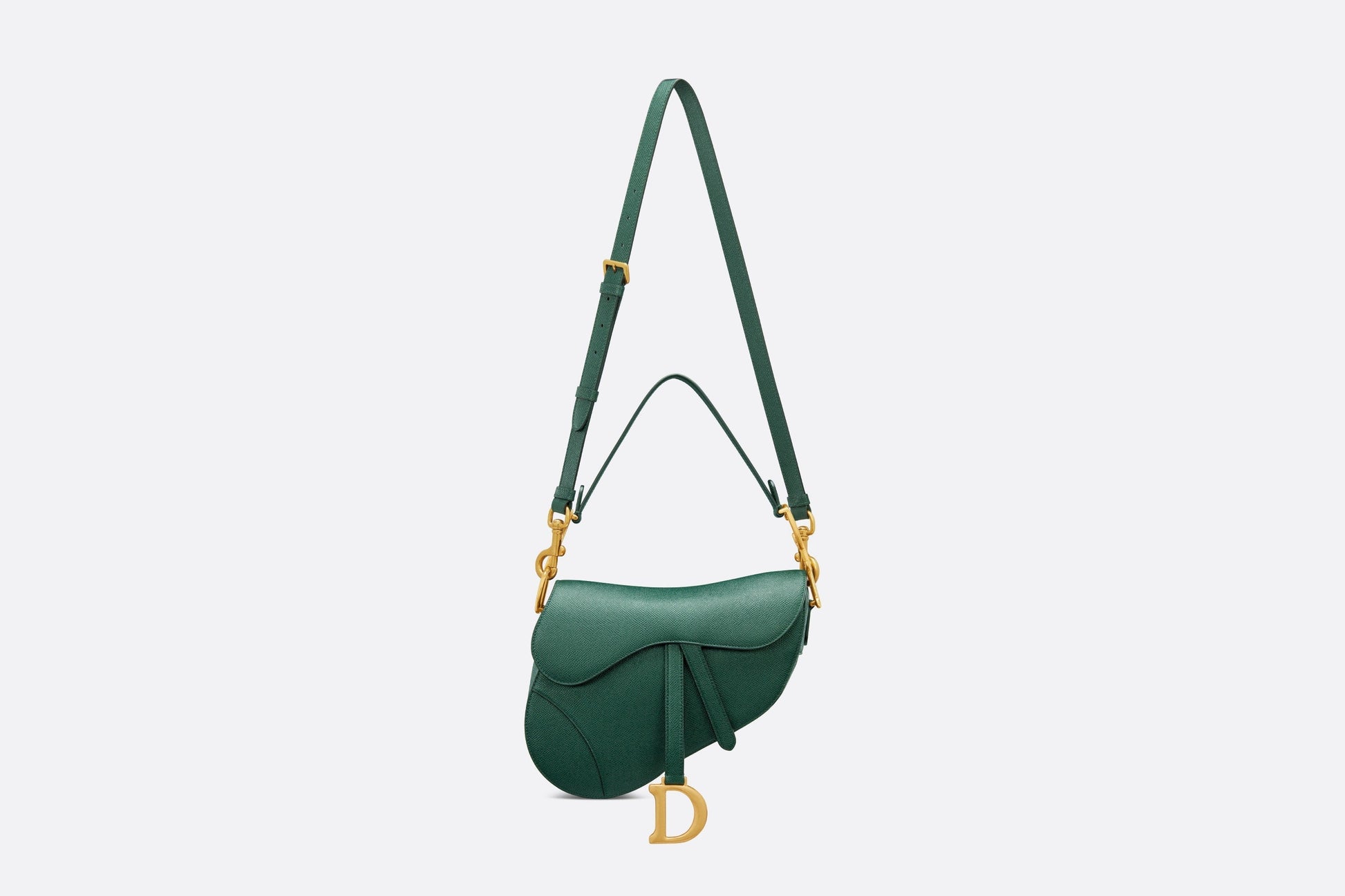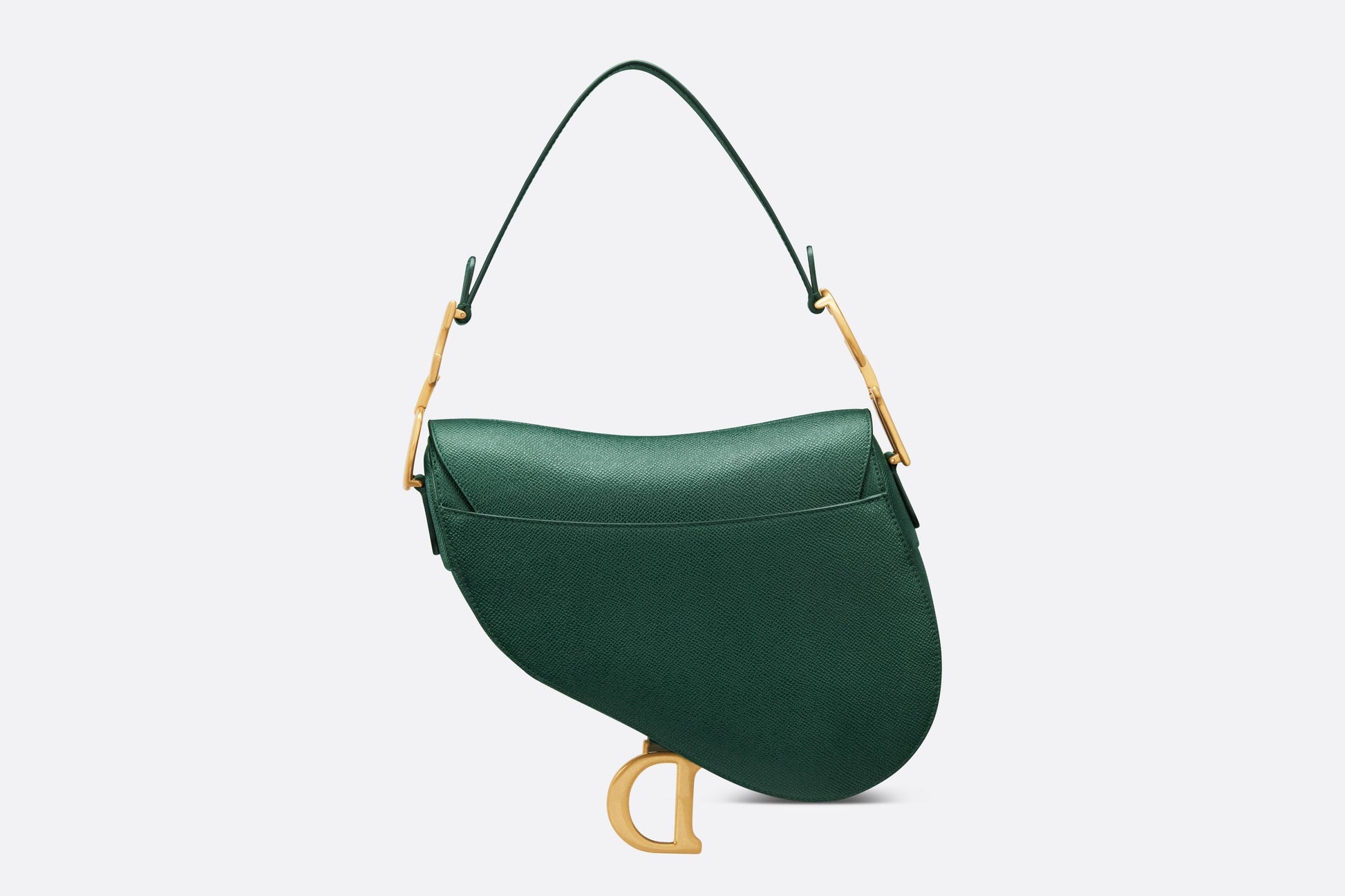 Maria Grazia Chiuri brings a fresh update to the iconic Saddle bag. Crafted in pine green grained calfskin, the legendary design features a Saddle flap with a magnetic D stirrup clasp with pulls, as well as an antique gold-finish metal CD signature on either side of the strap. Equipped with a thin, adjustable and removable shoulder strap, the Saddle bag may be carried by hand, worn over the shoulder or crossbody.