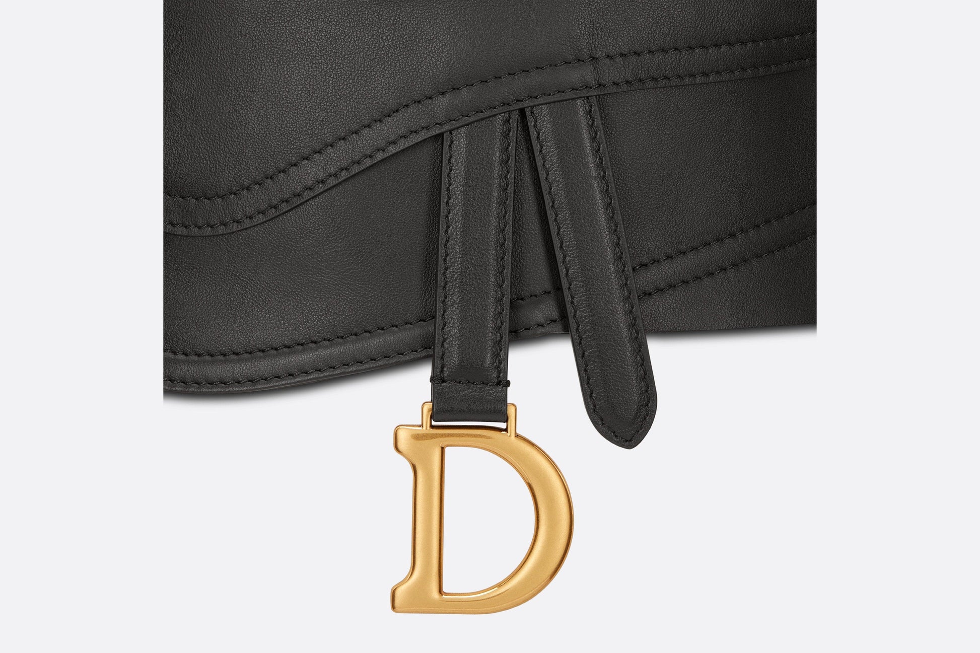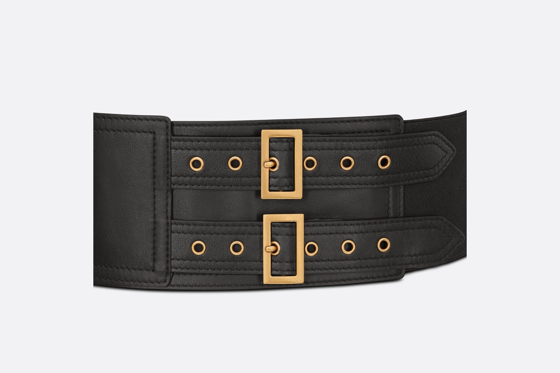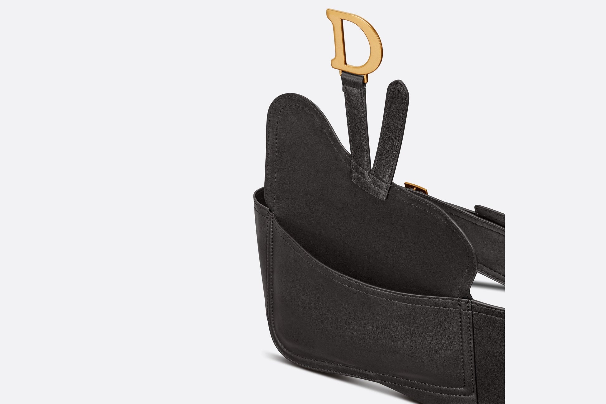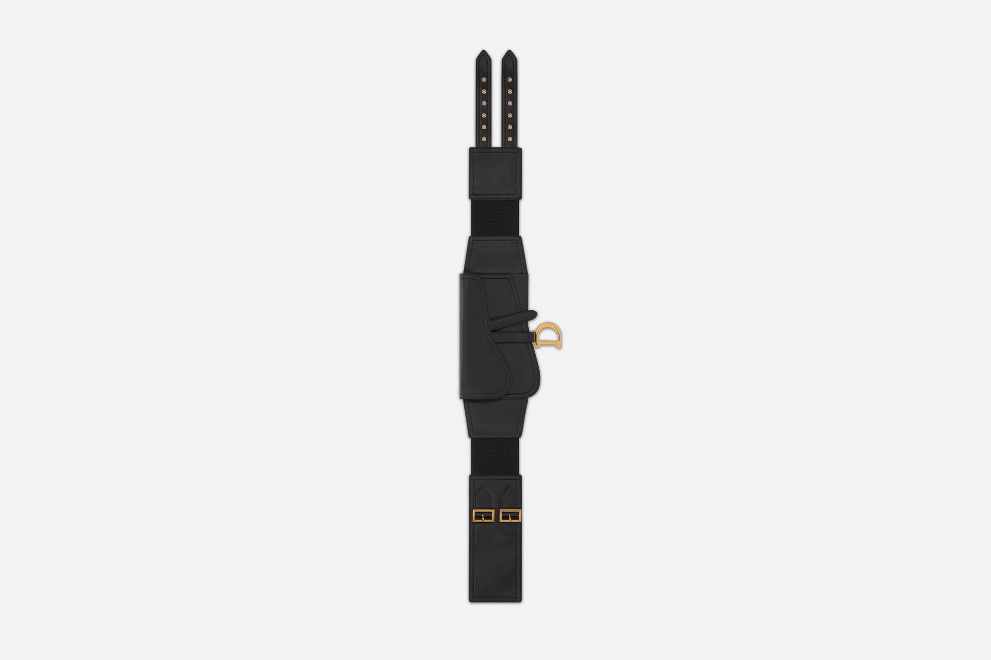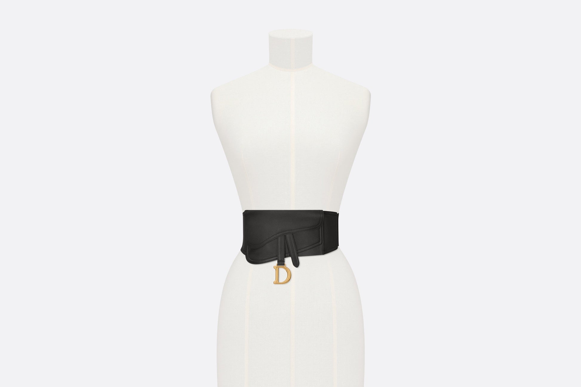 The Saddle belt honors the namesake line's hallmark codes. Crafted in black smooth calfskin, the design is embellished with a Saddle flap pocket and shiny gold-finish metal 'D' stirrup. The wide belt will embellish a skirt, dress or Bar Jacket.
