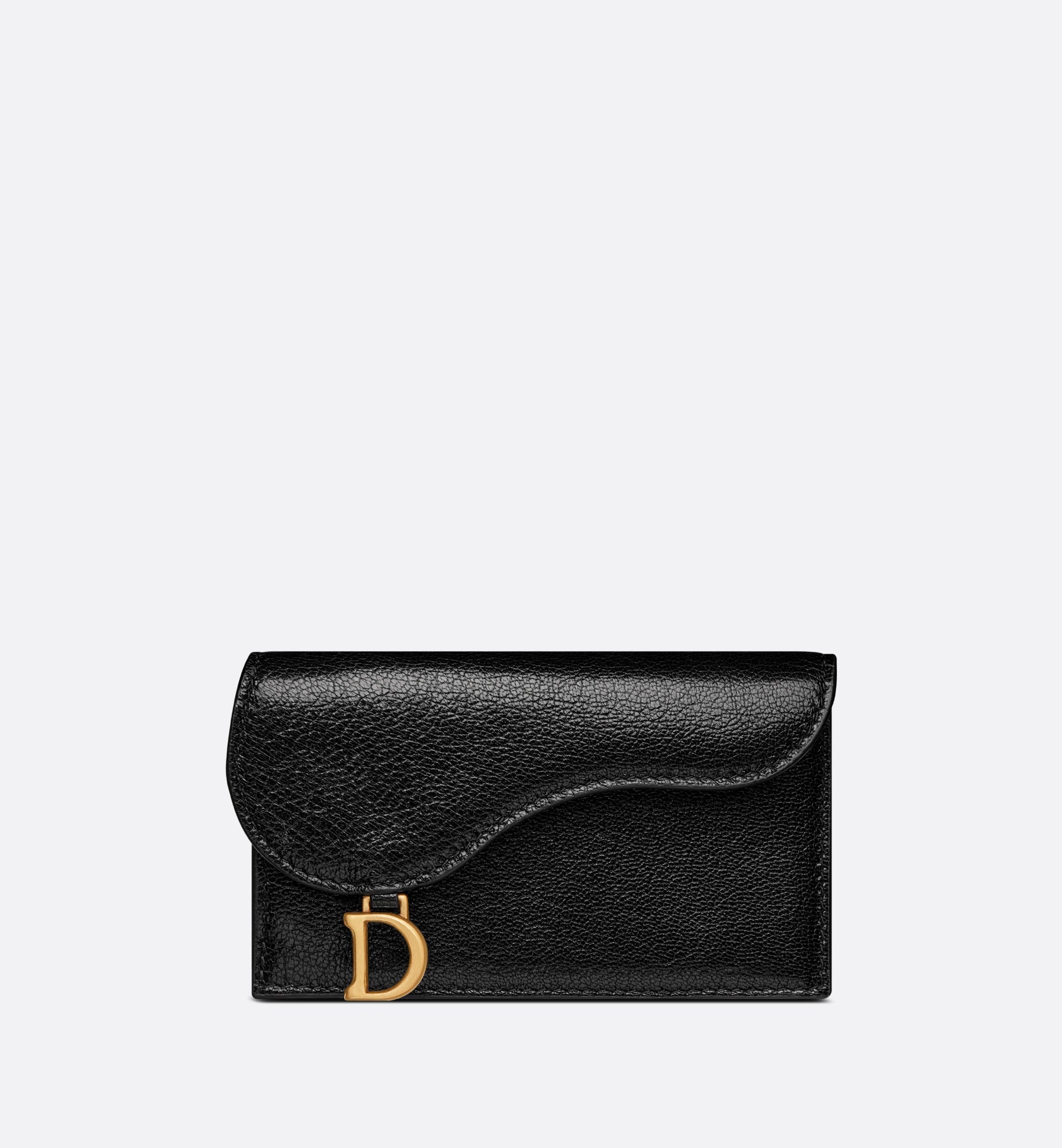 The Saddle flap zipped card holder is a compact and practical alternative to the traditional wallet. Crafted in black goatskin, it can hold all the daily essentials. The small and easy-to-use companion may be paired with the entire Saddle line.