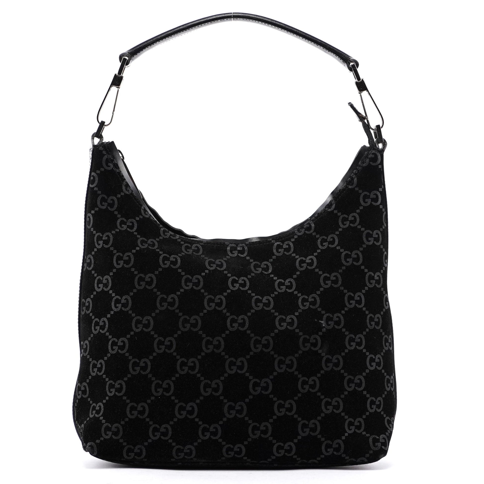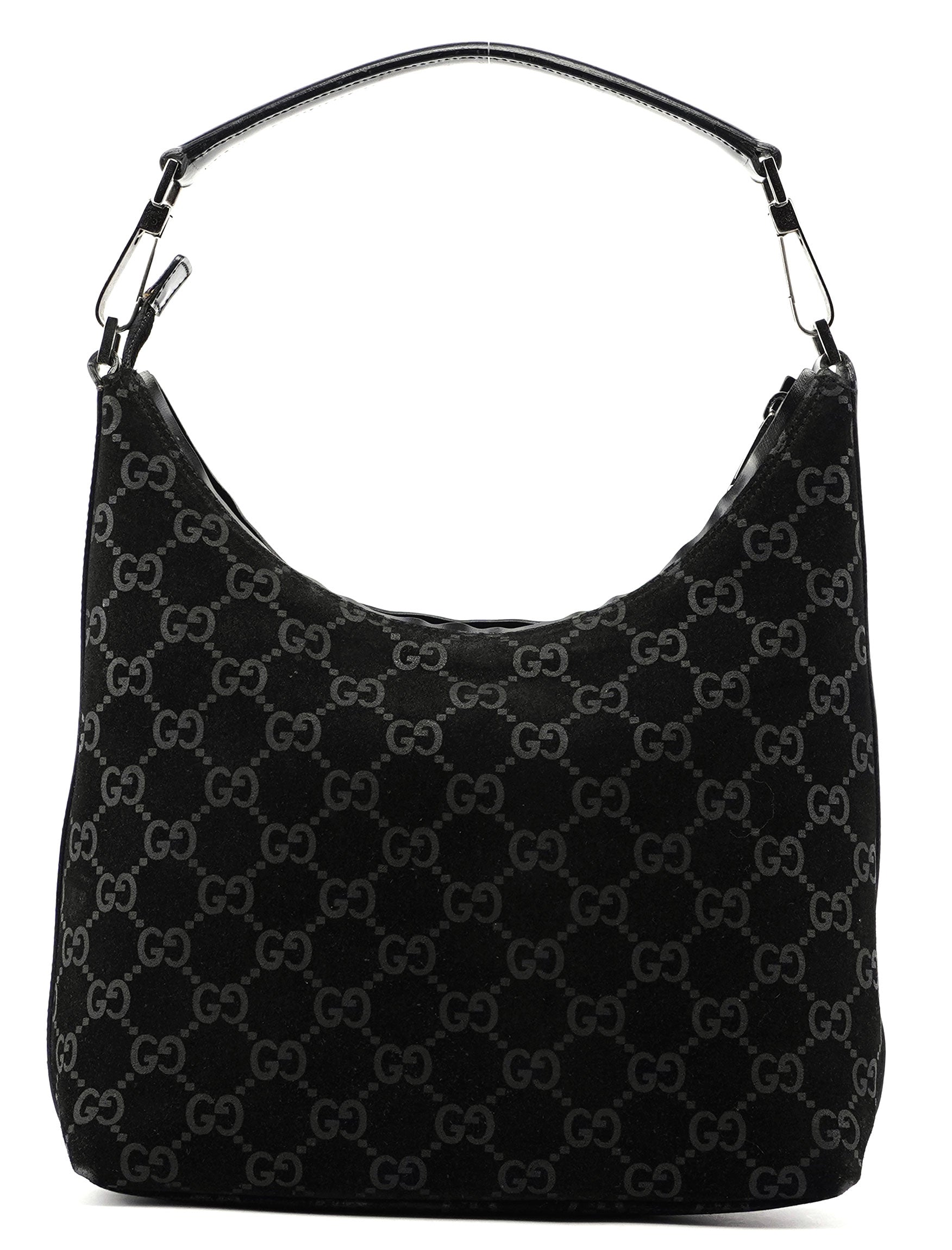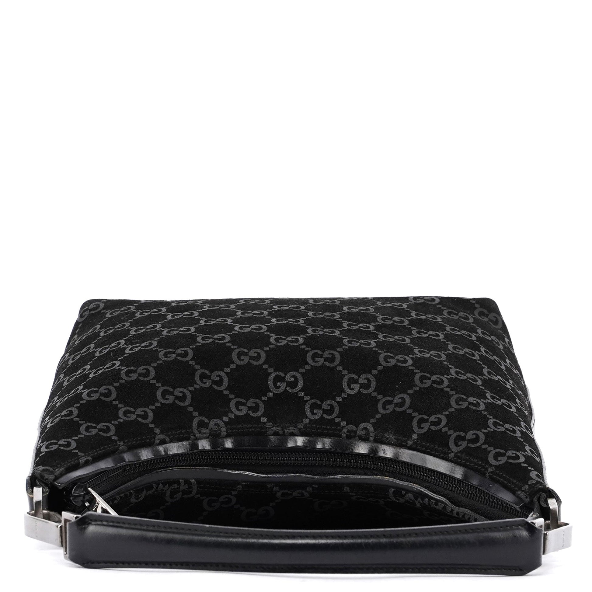 Designed by Tom Ford for the 1997 collection, the Gucci GG shoulder bag epitomizes sophistication. Its black GG monogram suede is complemented by silver-tone hardware with Gucci logo engraving and calfskin leather trim. The zipper closure opens to a satin-lined interior, featuring a convenient zipper pocket.