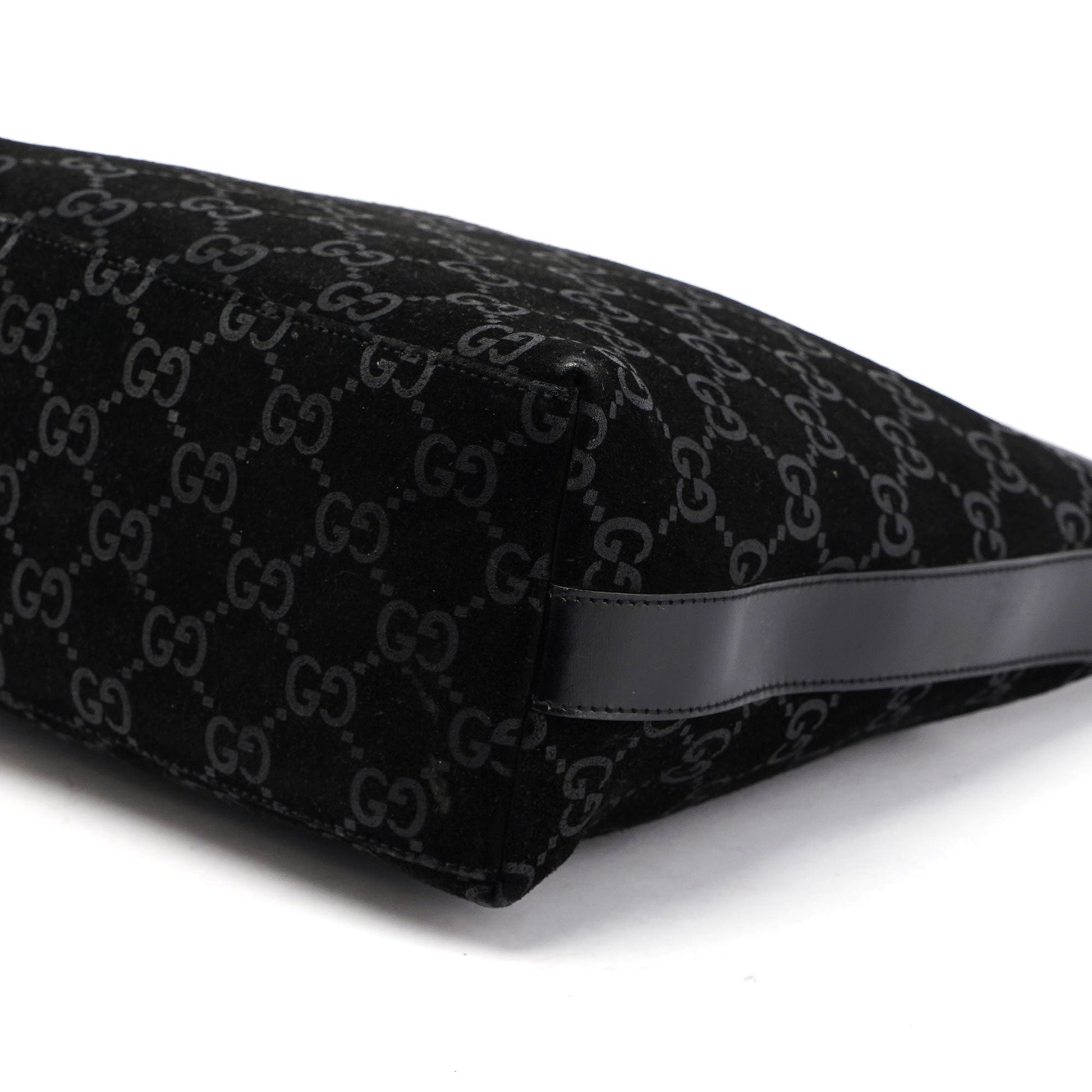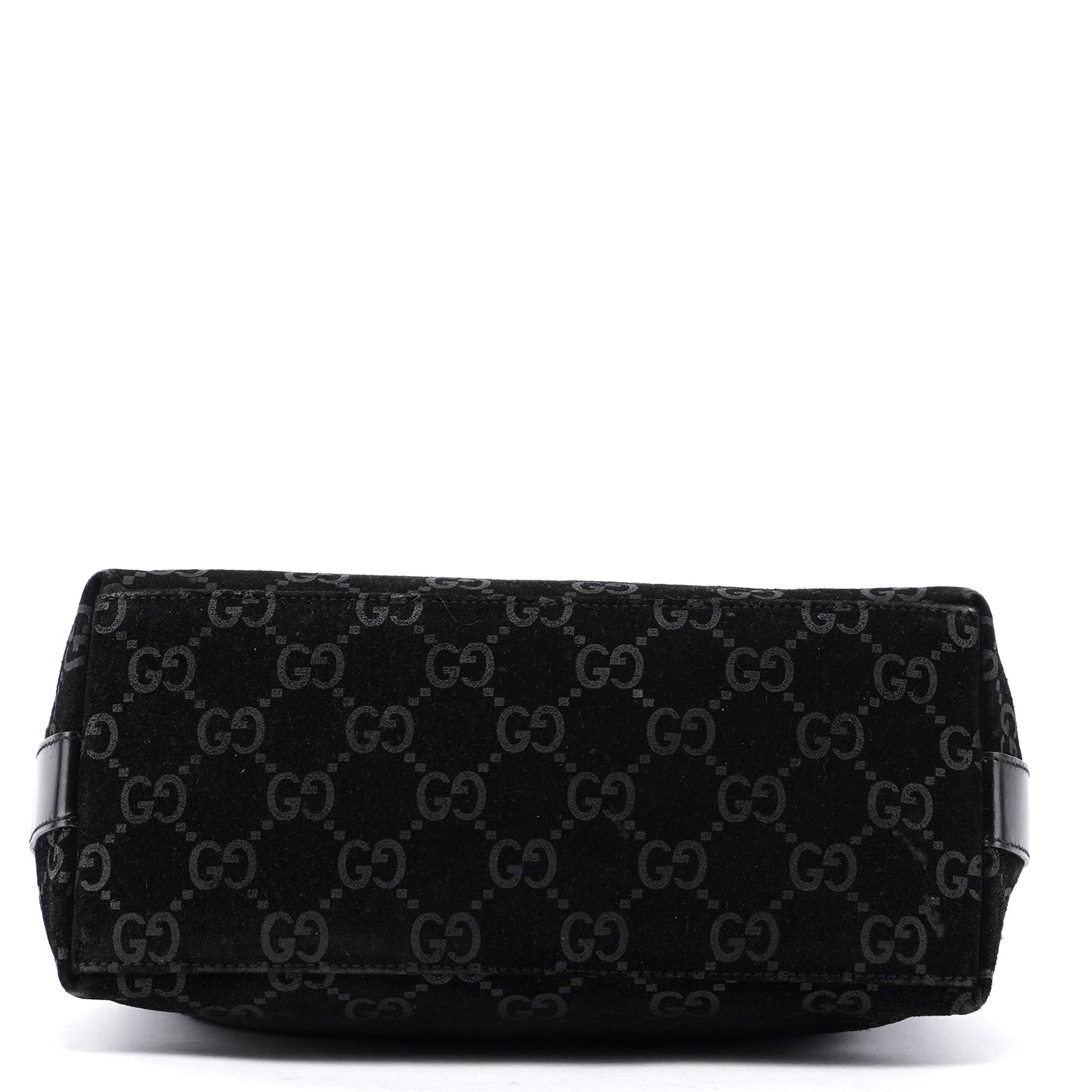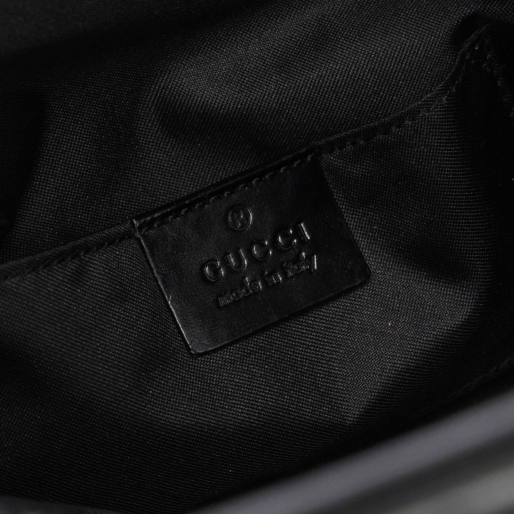 Designed by Tom Ford for the 1997 collection, the Gucci GG shoulder bag epitomizes sophistication. Its black GG monogram suede is complemented by silver-tone hardware with Gucci logo engraving and calfskin leather trim. The zipper closure opens to a satin-lined interior, featuring a convenient zipper pocket.