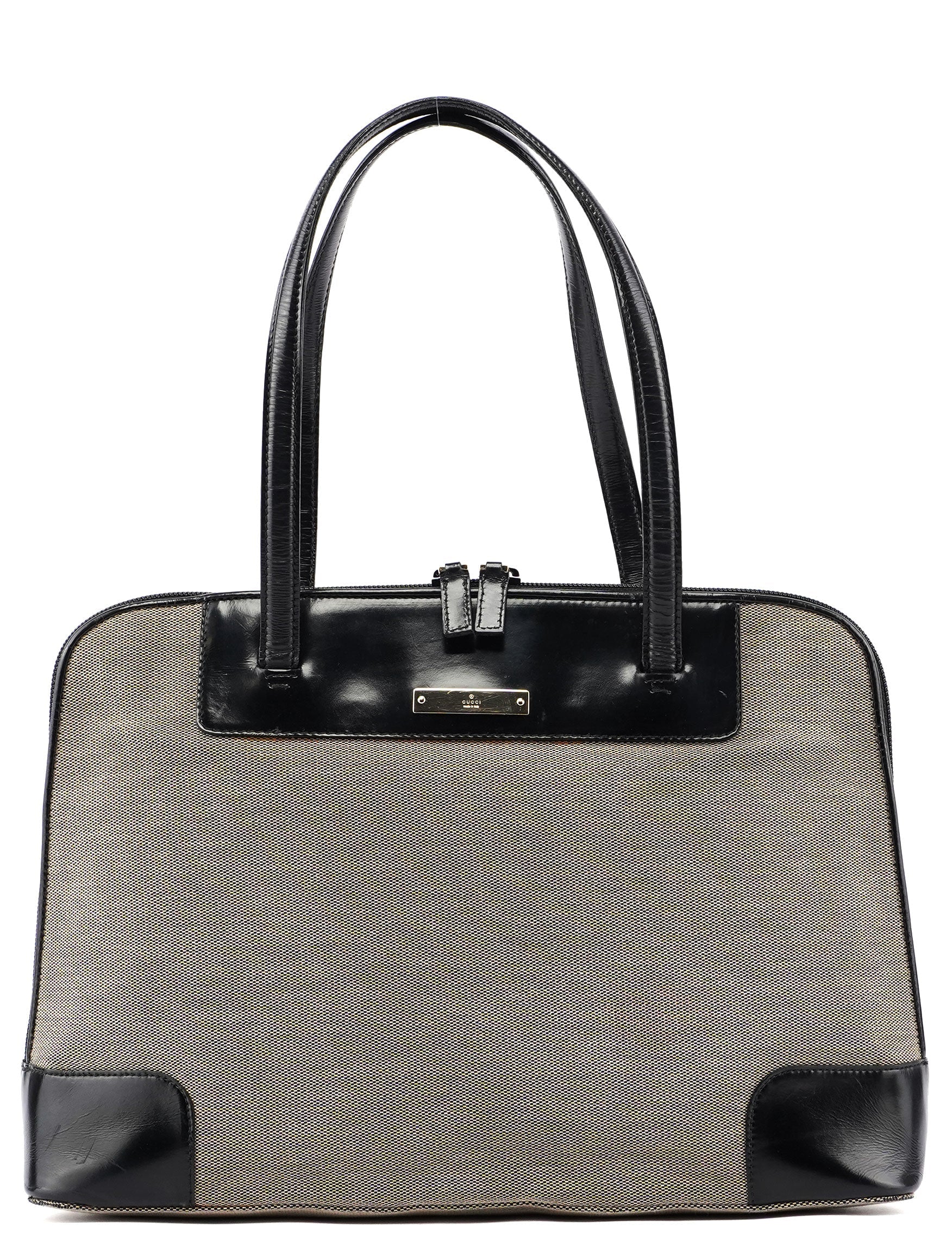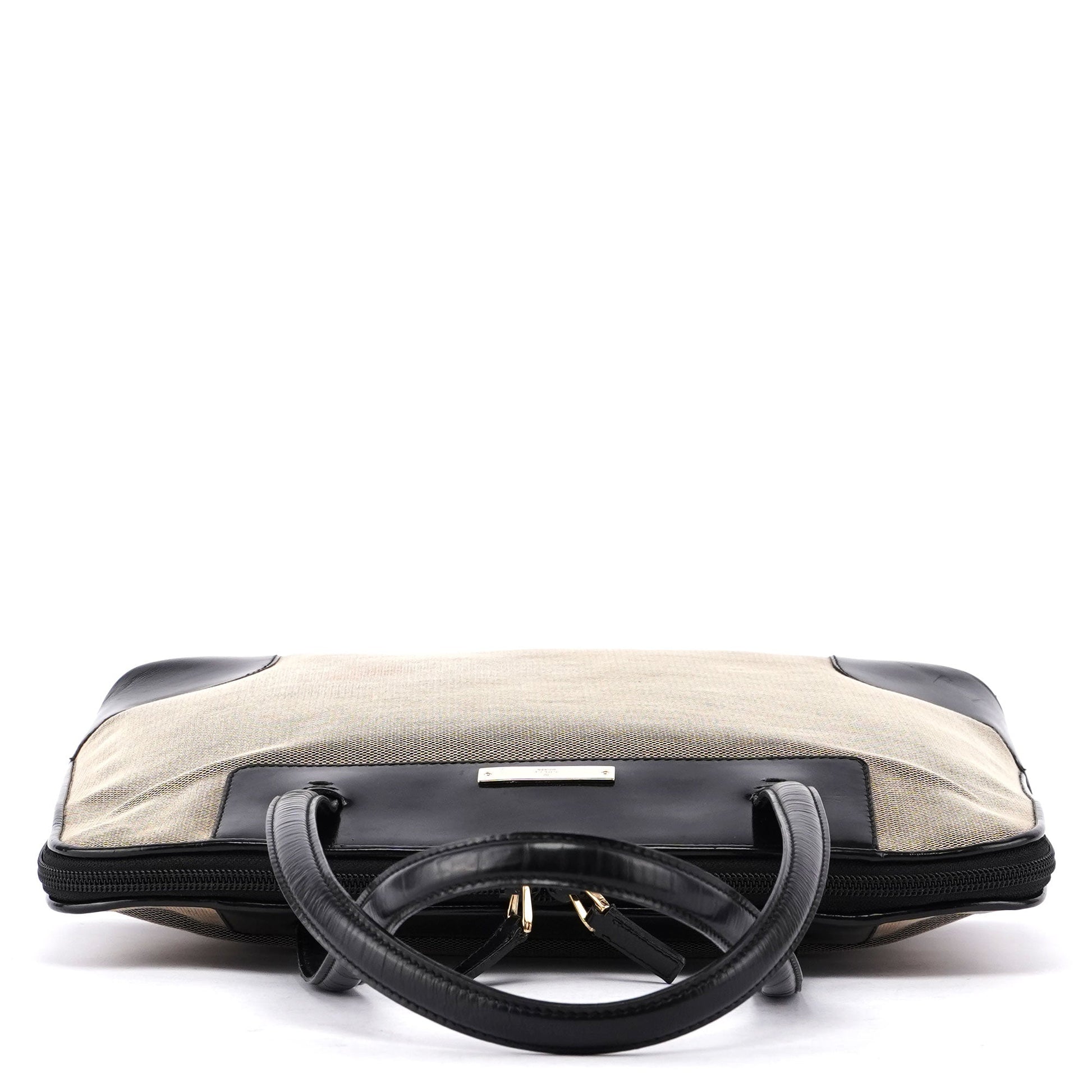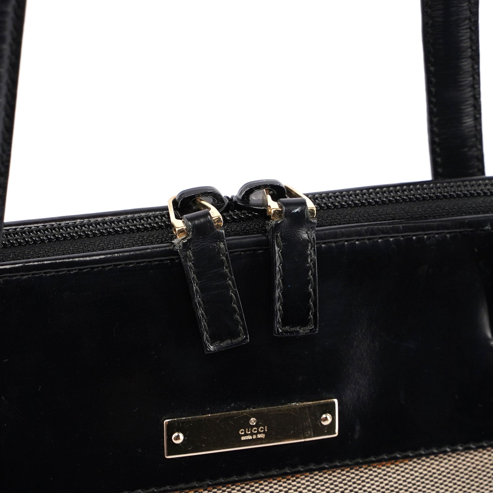 Designed by Tom Ford in the late 1990s, this Gucci tote bag combines beige canvas with black patent leather for a timeless look. Accented with gold-tone hardware, it features a convenient zipper closure and a satin-lined interior with a zipper pocket for organization. The iconic Gucci logo plate adorns the front, adding a touch of luxury.
