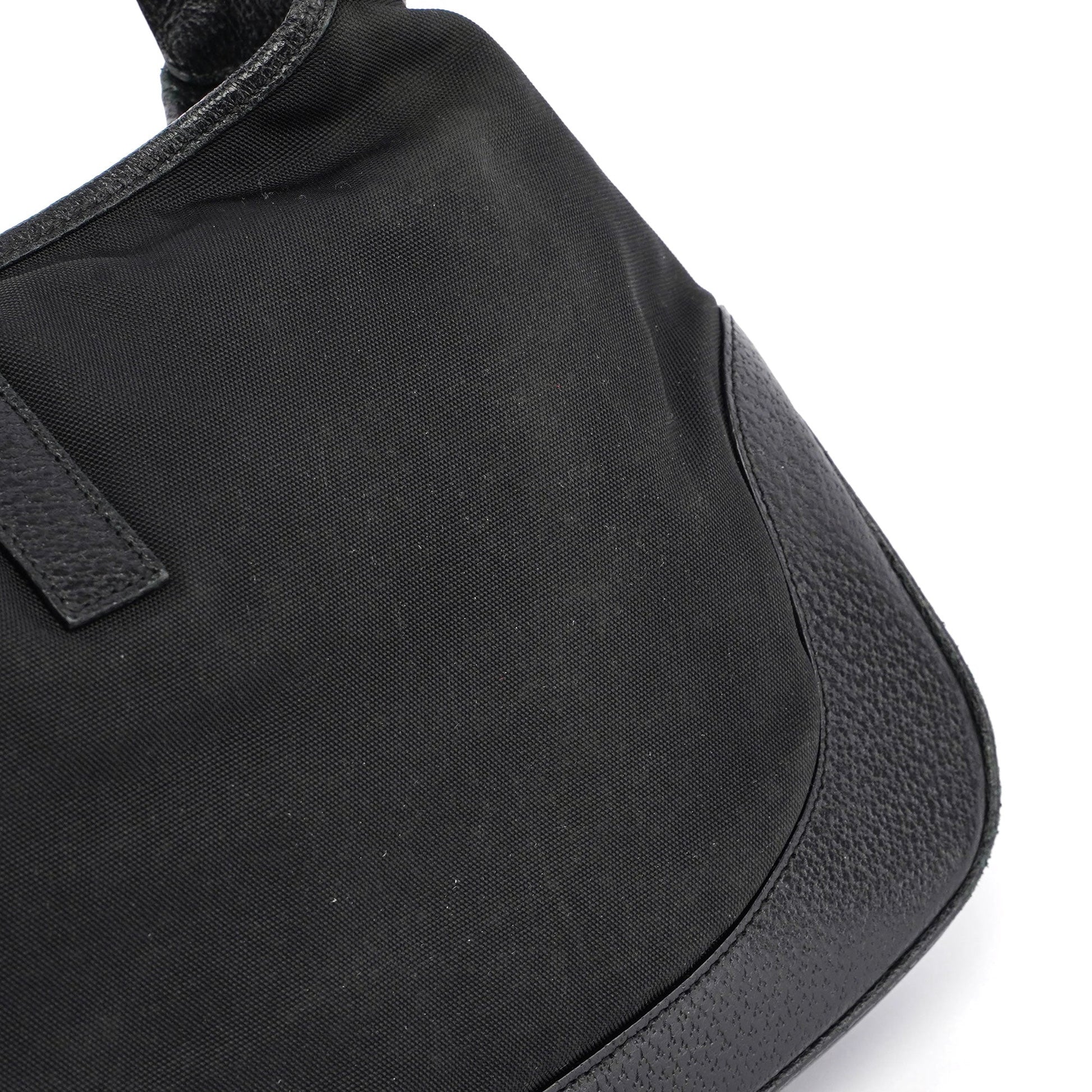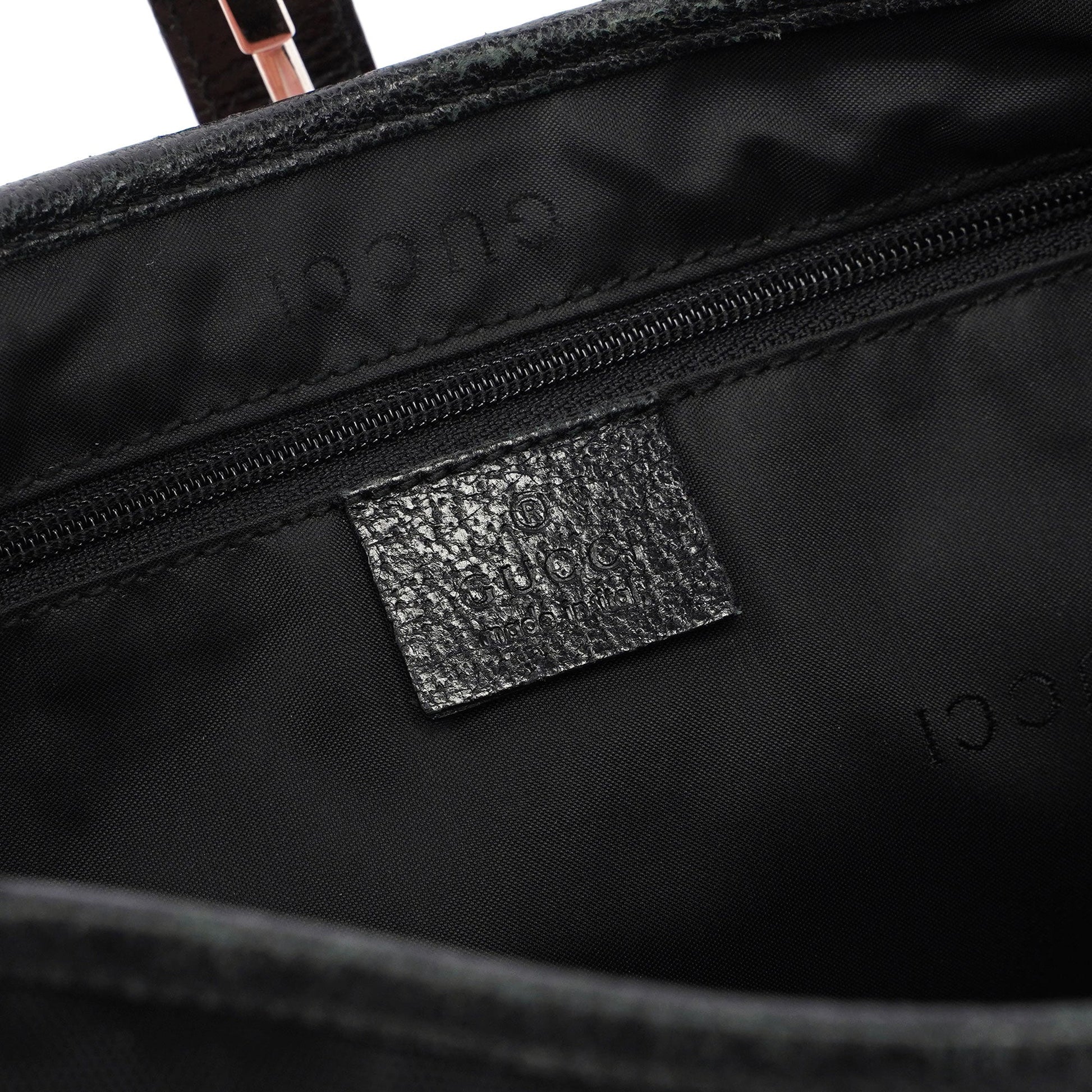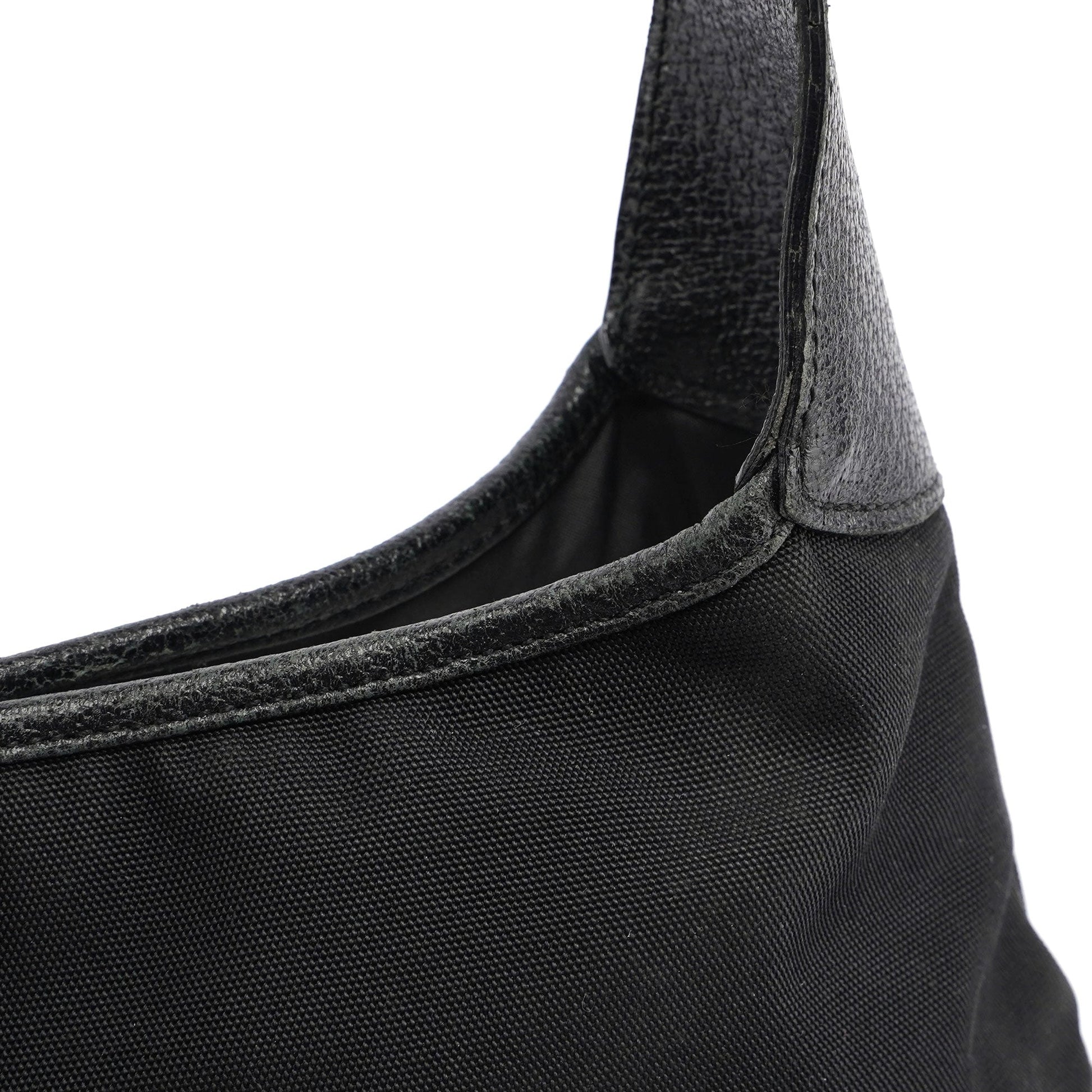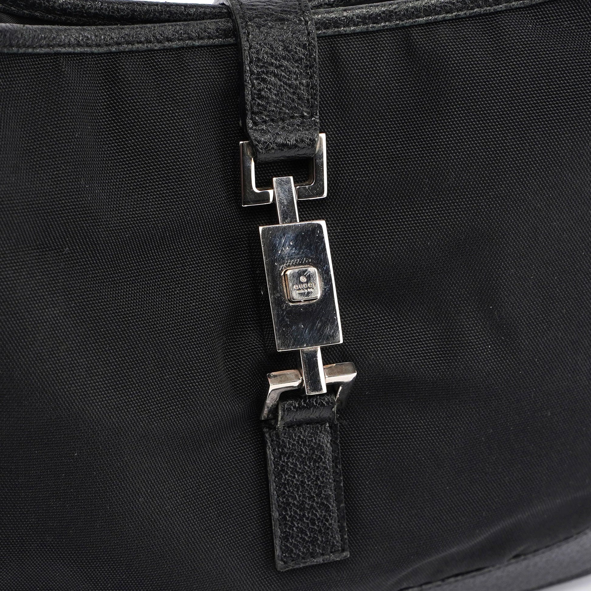 Designed by Tom Ford in the late 1990s, this Gucci Jackie bag is handcrafted in black cotton canvas with black leather trim, accented by silver-tone hardware. It features a black leather handle with Gucci logo engraving and a classic silver-tone Jackie style closure. The interior, lined with square GG monogram satin and including an interior zipper pocket, marries functional design with Gucci's timeless aesthetic.
