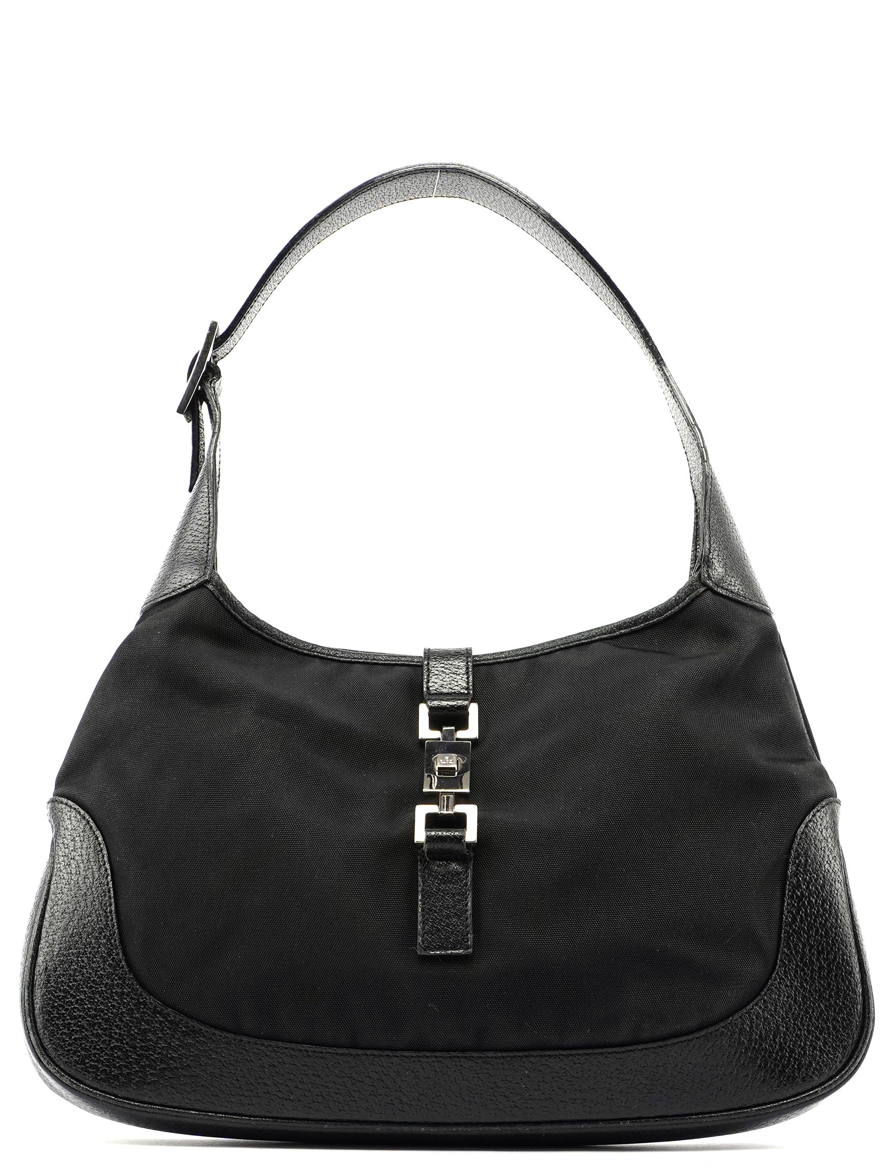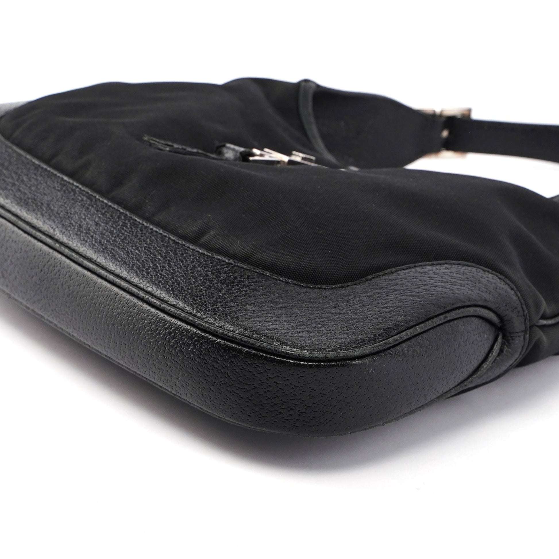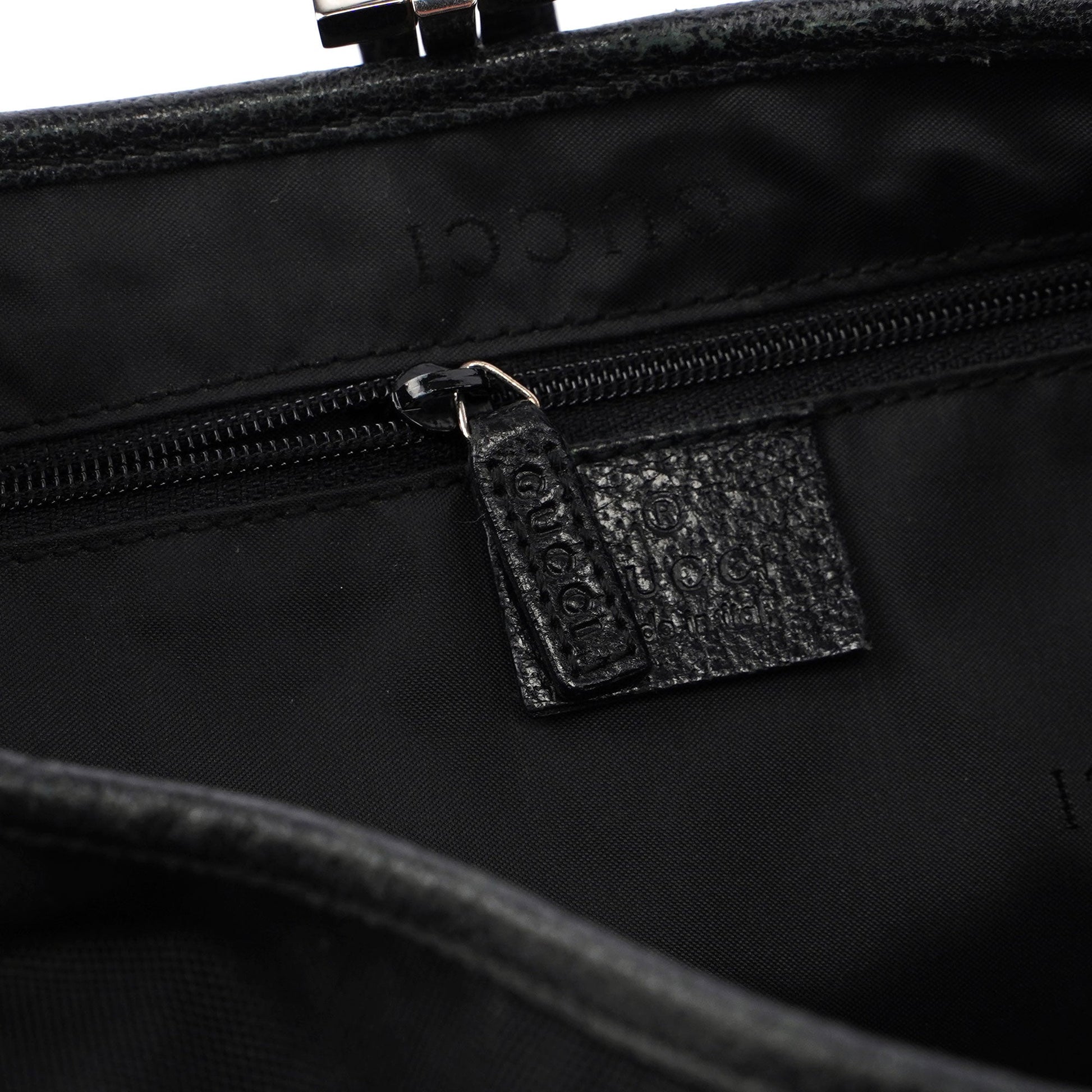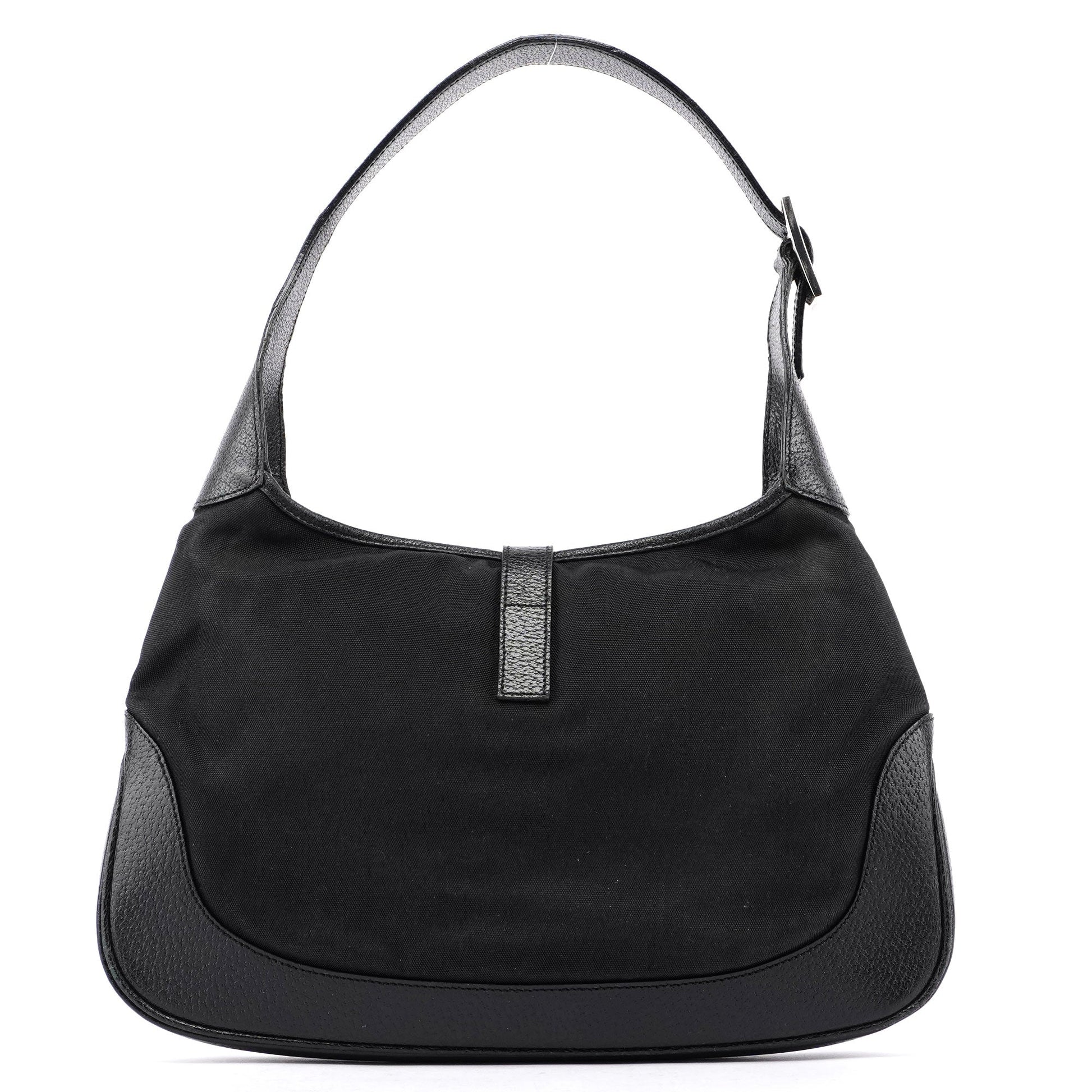 Designed by Tom Ford in the late 1990s, this Gucci Jackie bag is handcrafted in black cotton canvas with black leather trim, accented by silver-tone hardware. It features a black leather handle with Gucci logo engraving and a classic silver-tone Jackie style closure. The interior, lined with square GG monogram satin and including an interior zipper pocket, marries functional design with Gucci's timeless aesthetic.