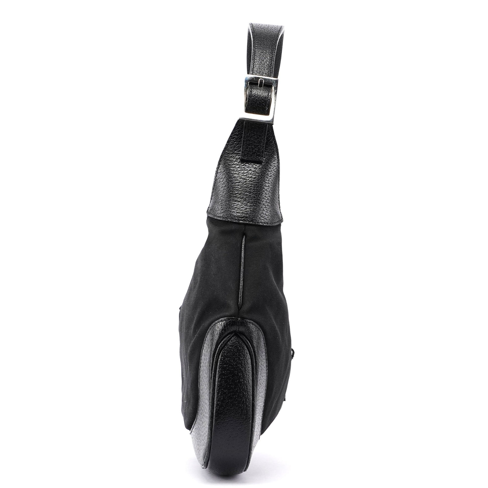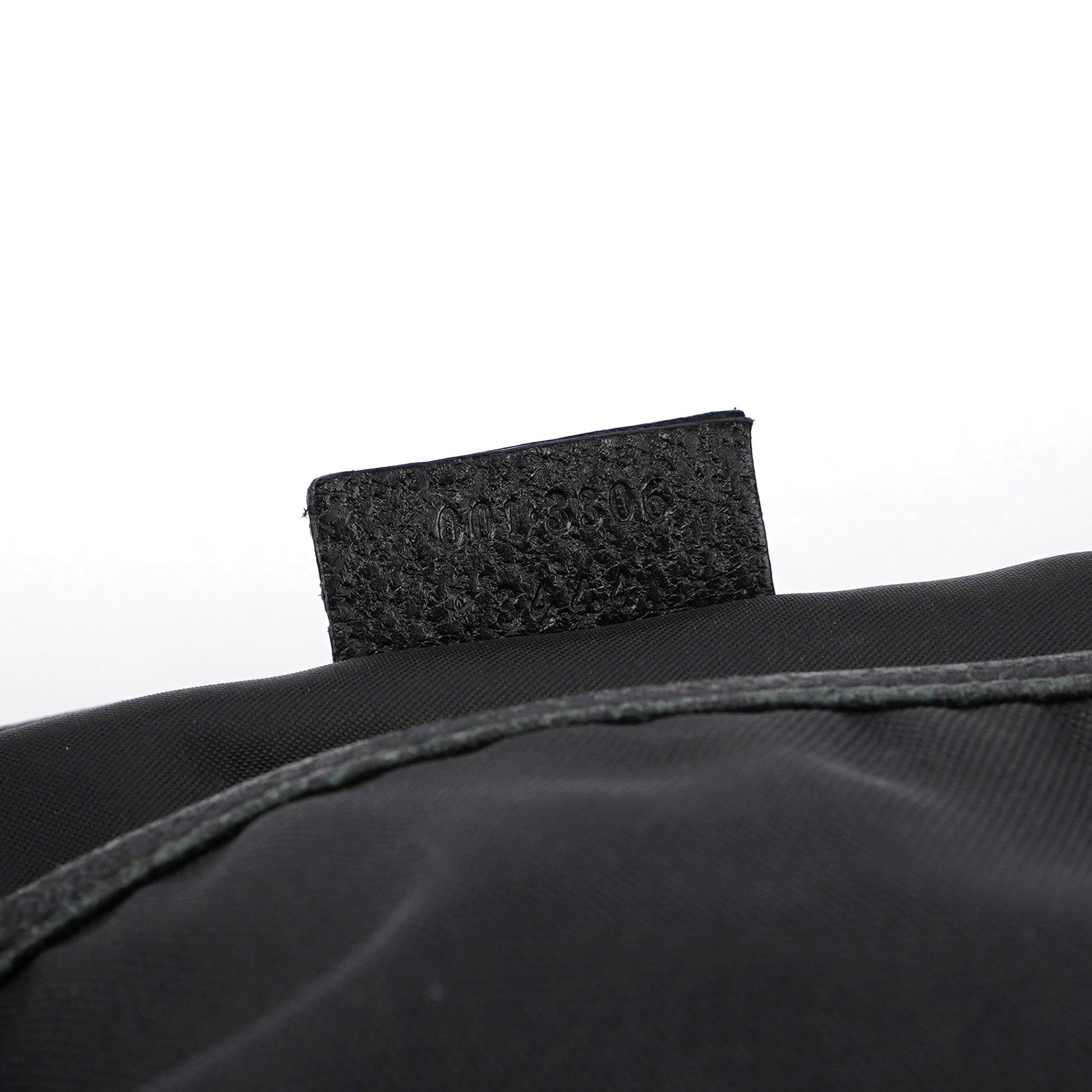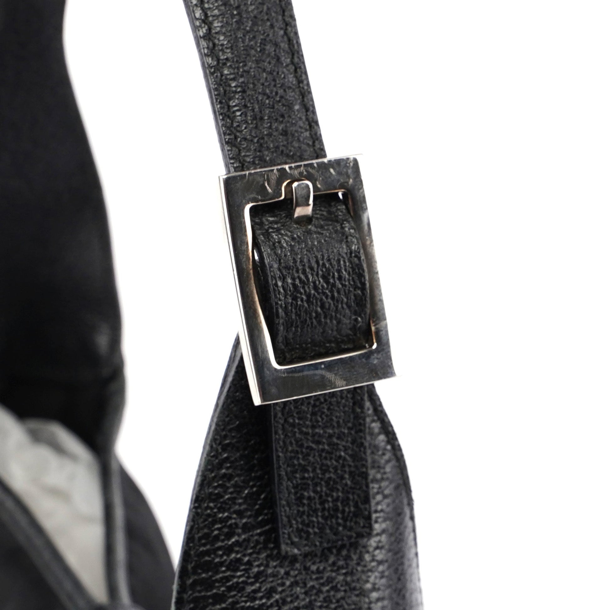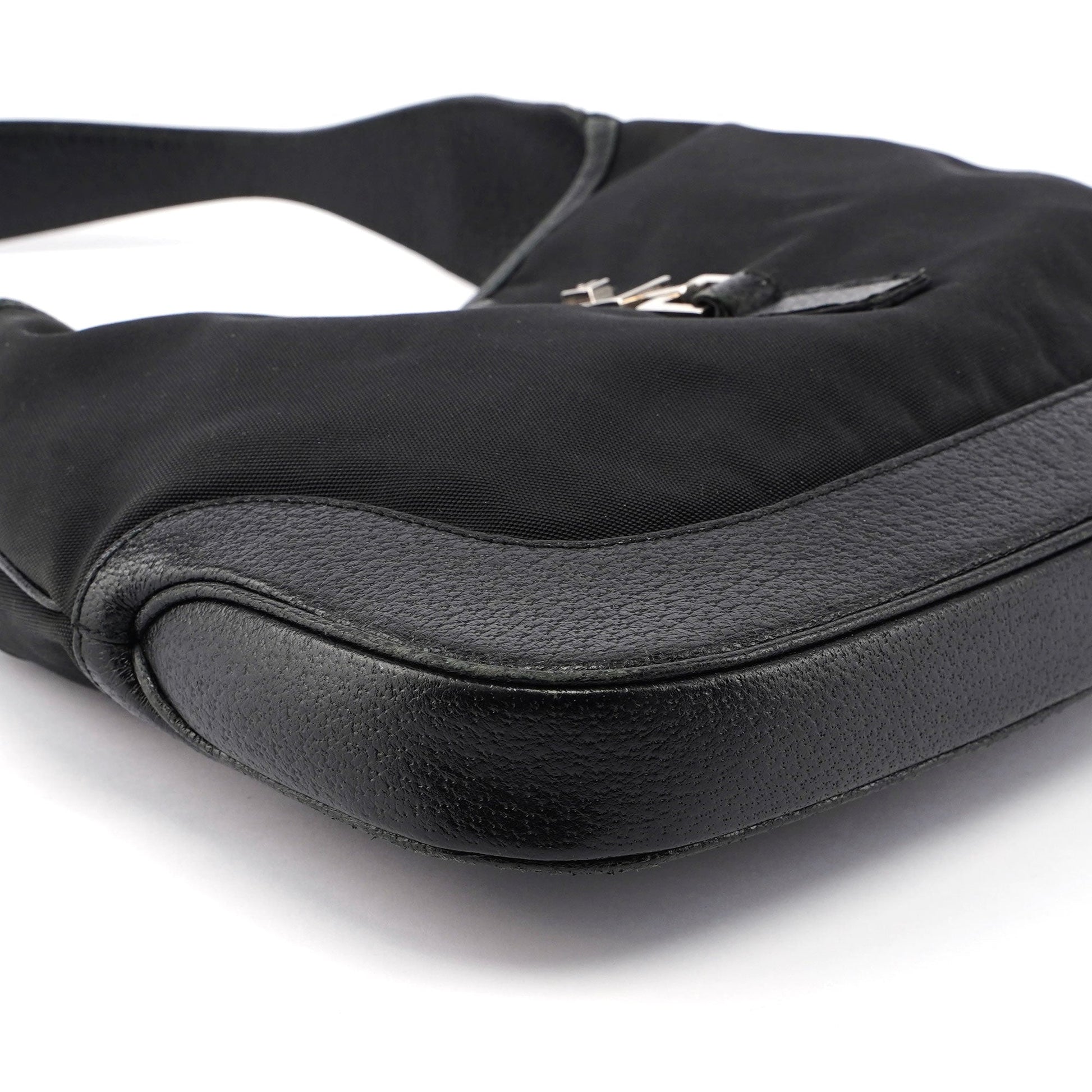 Designed by Tom Ford in the late 1990s, this Gucci Jackie bag is handcrafted in black cotton canvas with black leather trim, accented by silver-tone hardware. It features a black leather handle with Gucci logo engraving and a classic silver-tone Jackie style closure. The interior, lined with square GG monogram satin and including an interior zipper pocket, marries functional design with Gucci's timeless aesthetic.