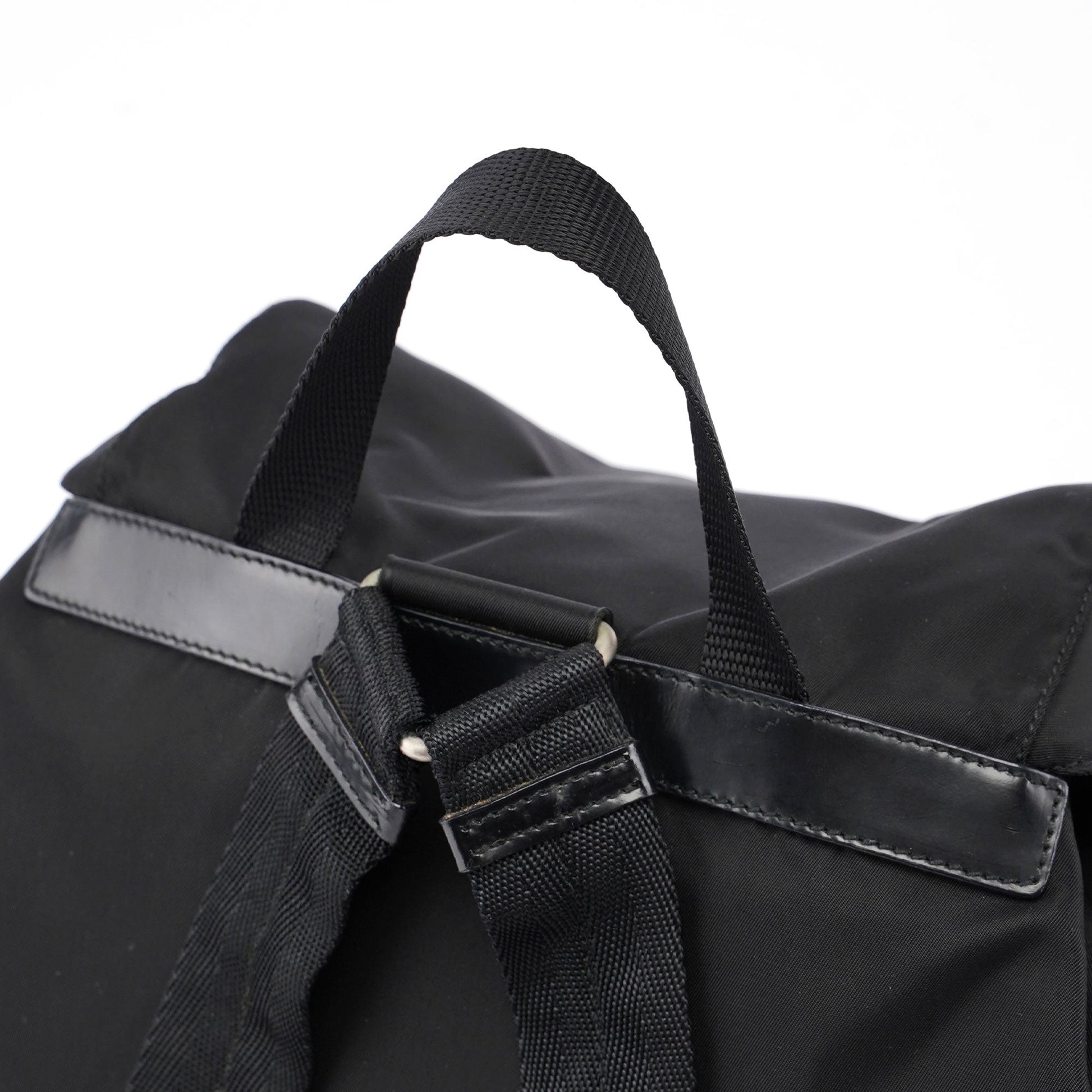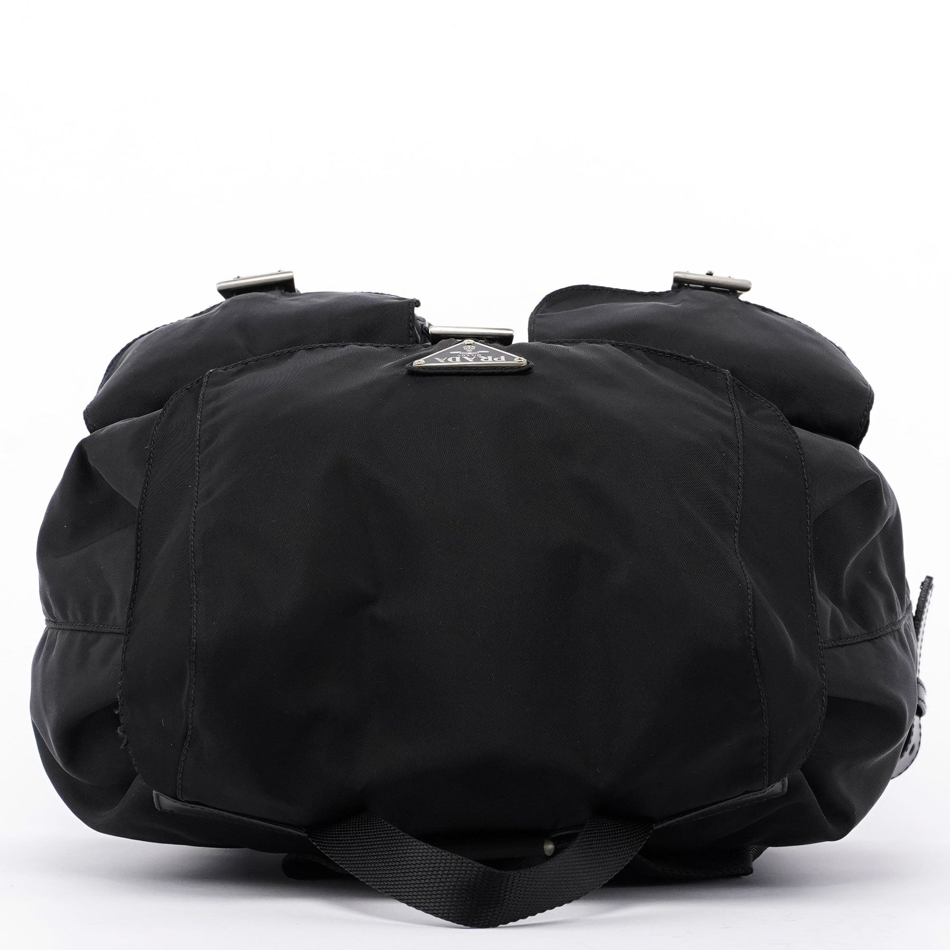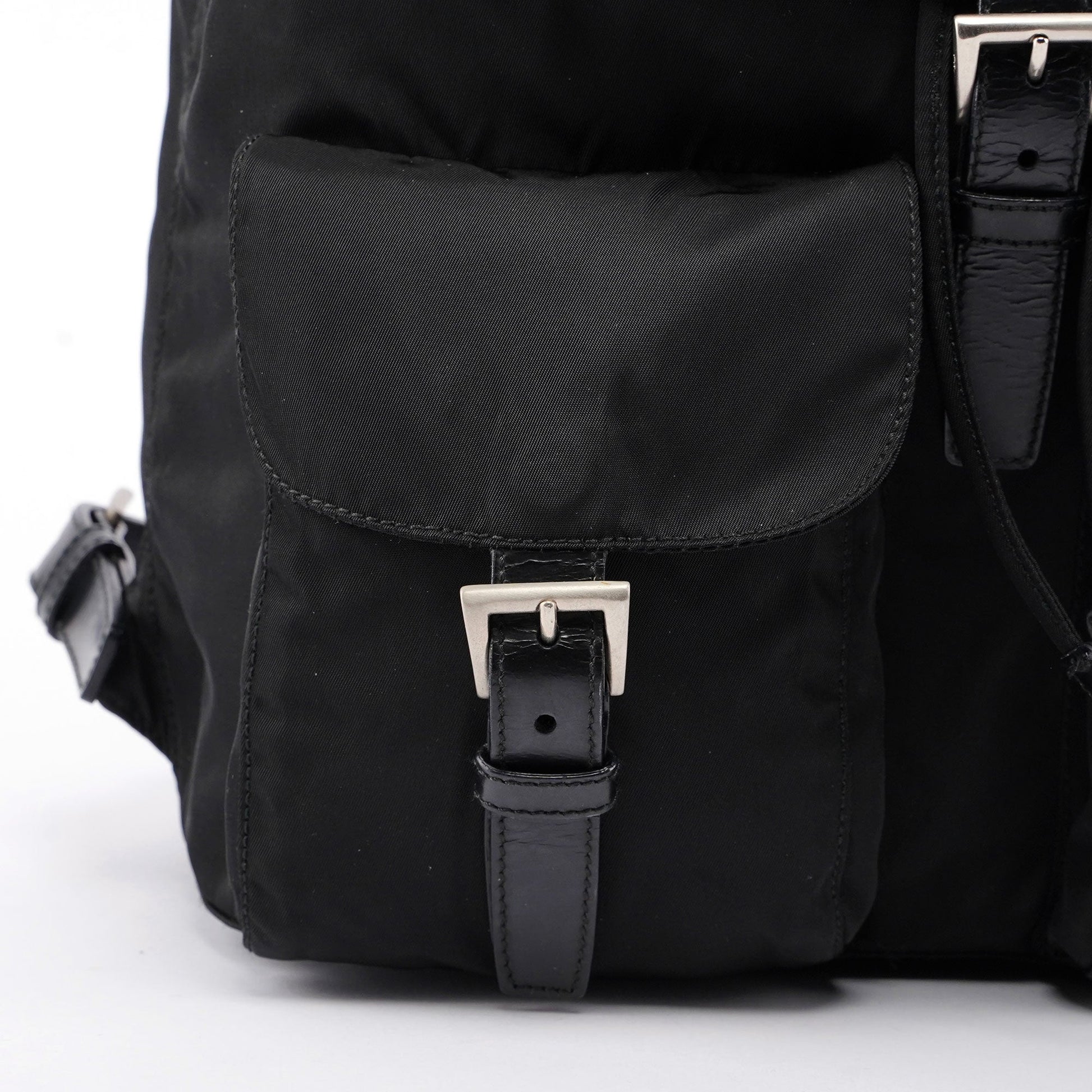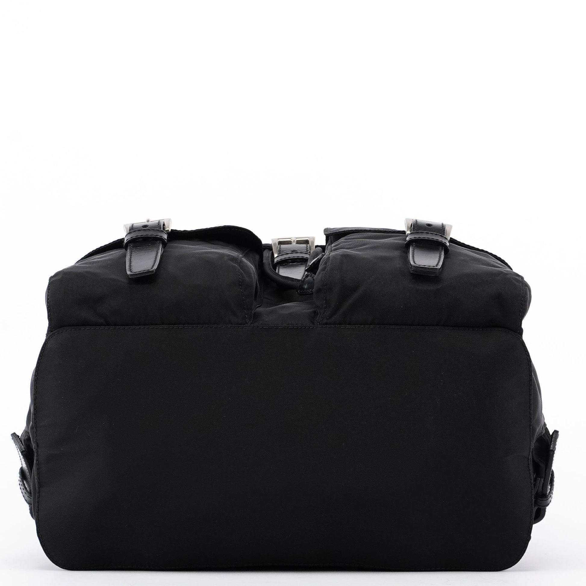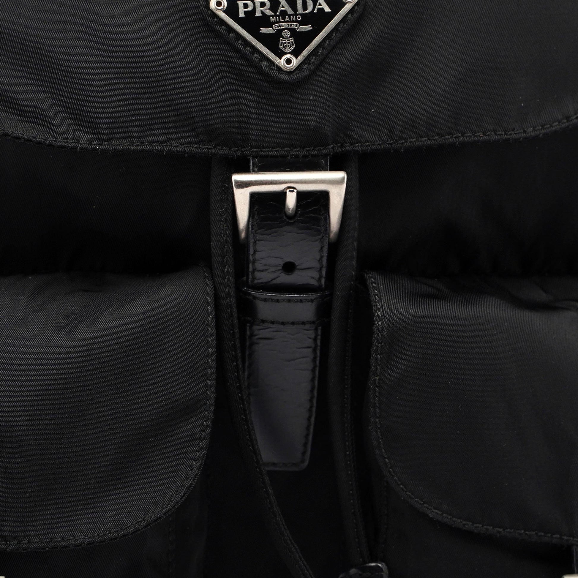 This Prada Tessuto Vela nylon backpack features sleek silver-tone hardware and black leather trim, offering a modern and durable design. It includes two front pockets and adjustable straps for comfort and versatility, secured with a belt closure. The spacious interior compartment is lined with satin and includes an interior zipper pocket for organization. A Prada triangle logo on the front flap adds a signature touch to this functional and stylish accessory.