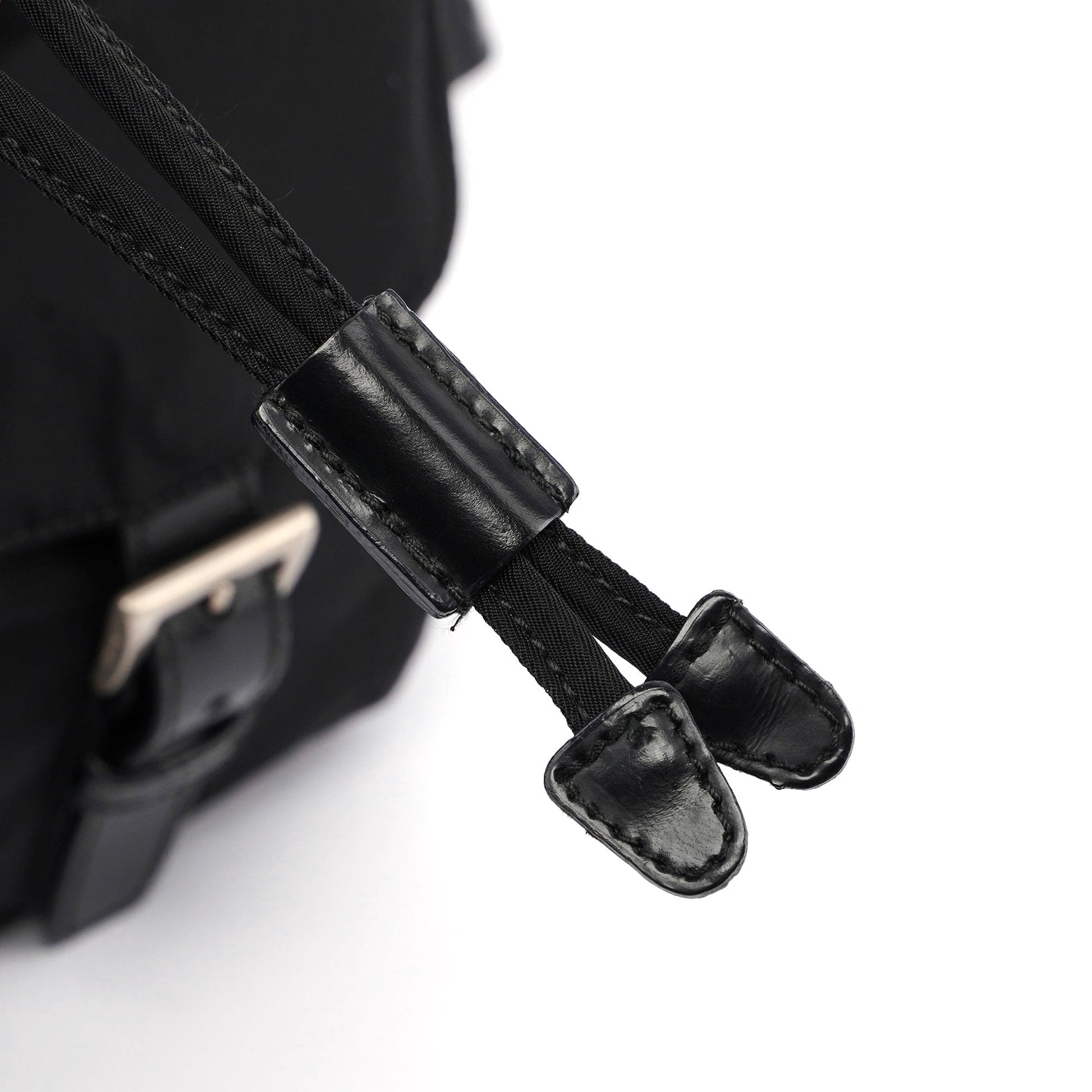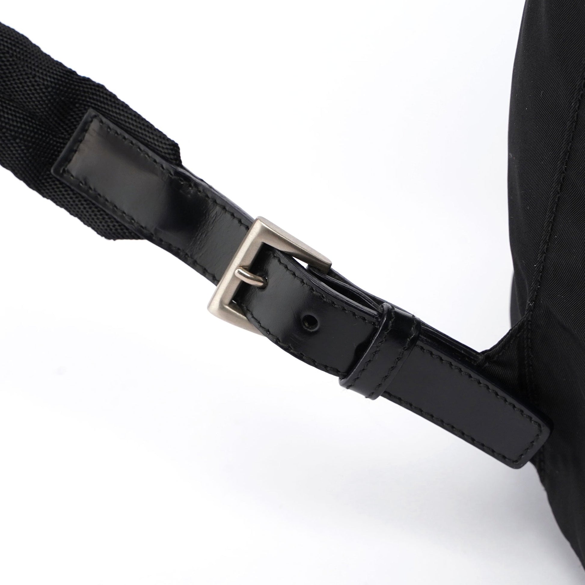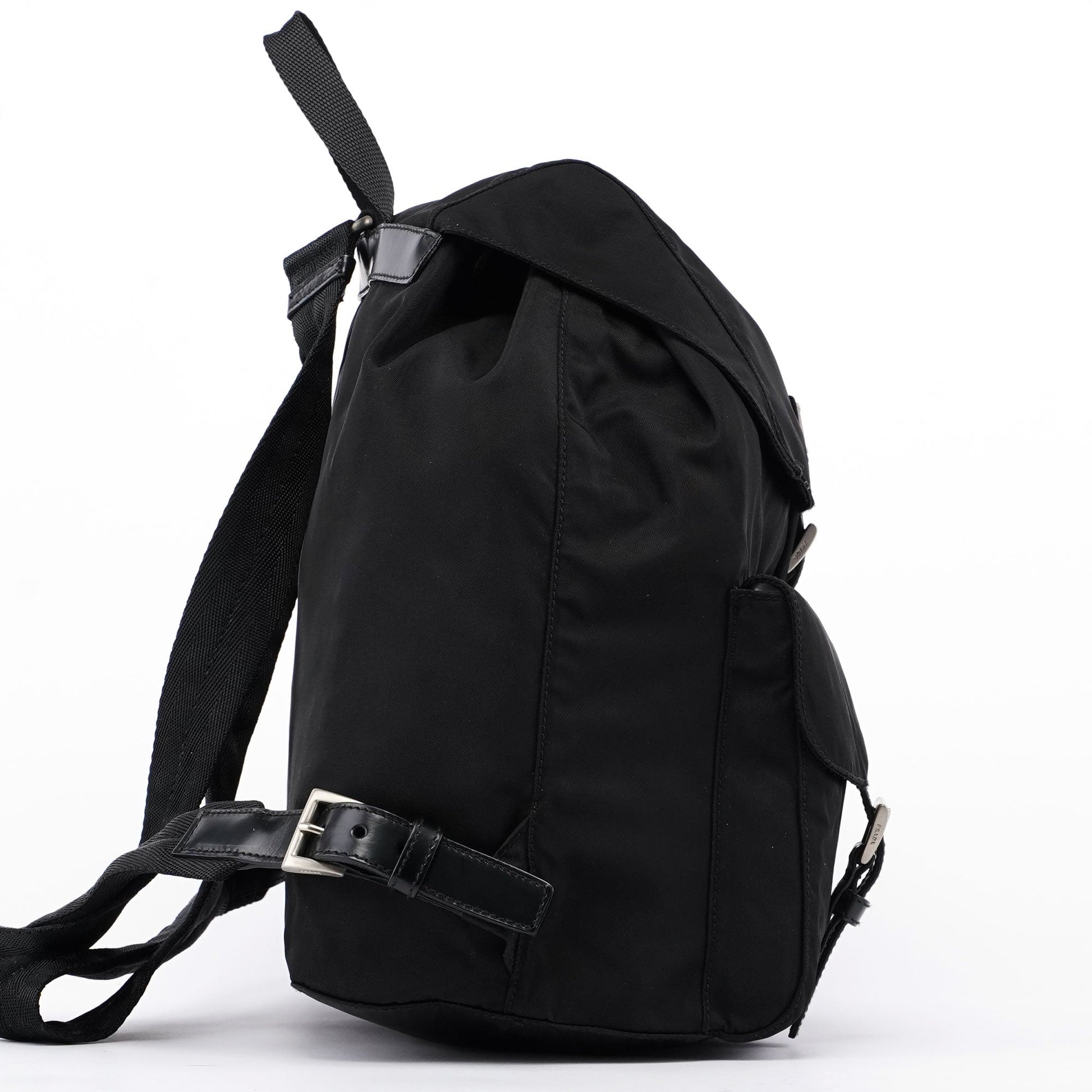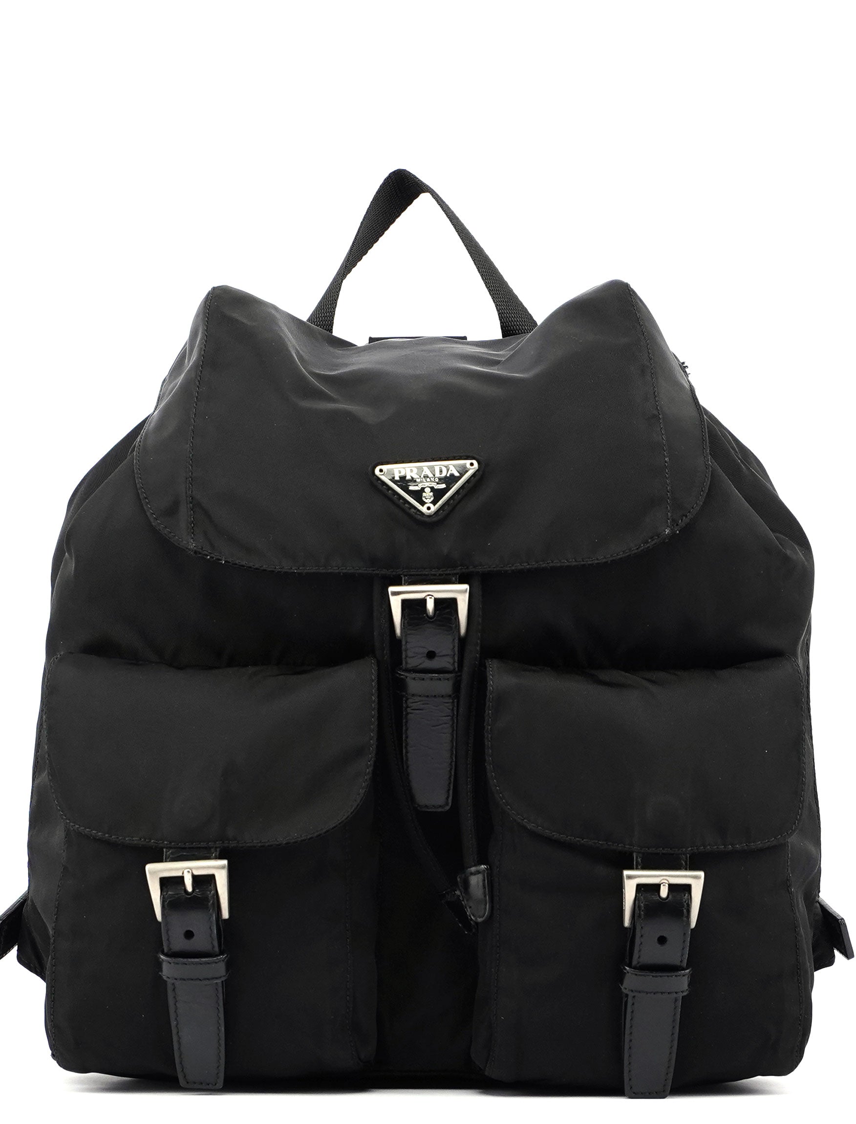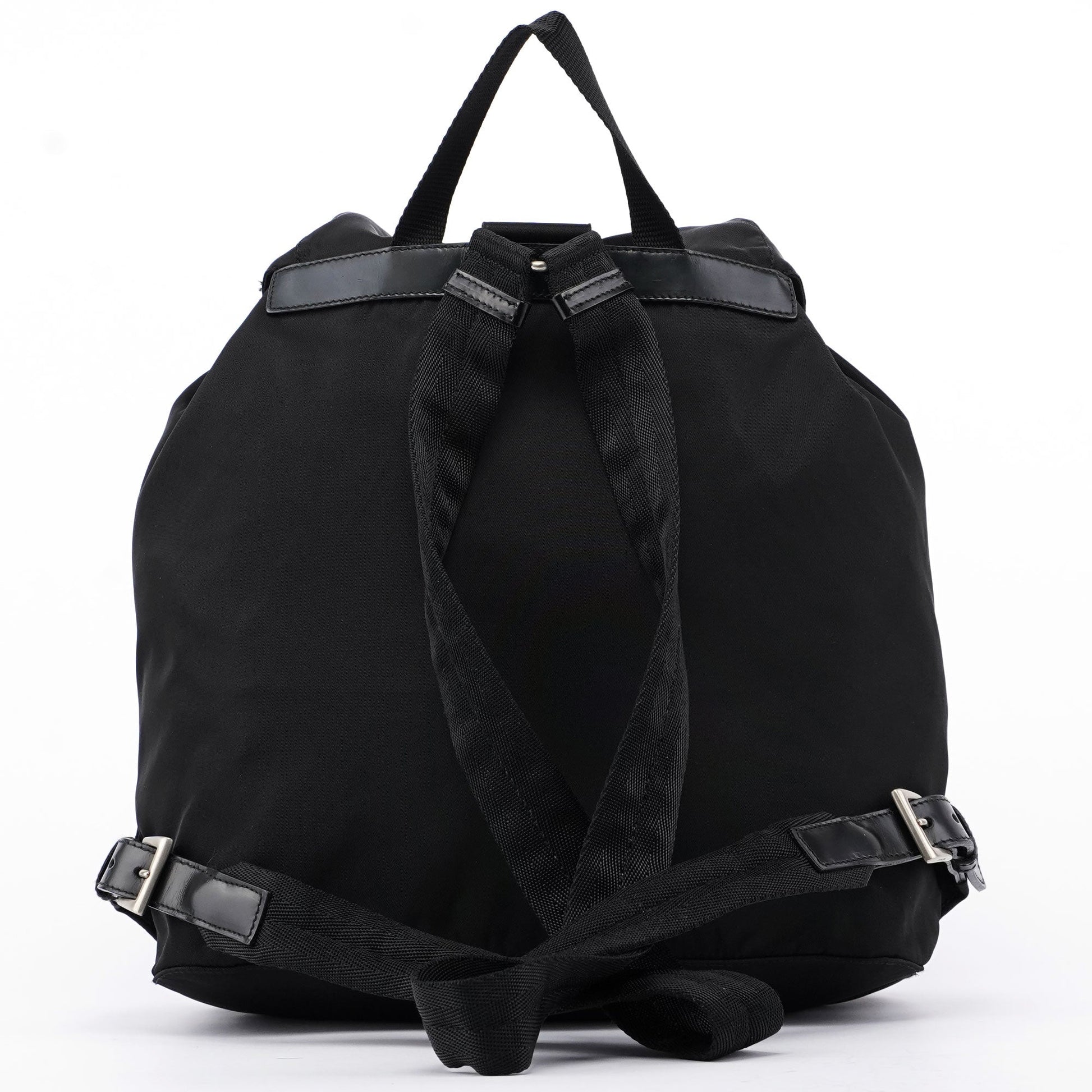 This Prada Tessuto Vela nylon backpack features sleek silver-tone hardware and black leather trim, offering a modern and durable design. It includes two front pockets and adjustable straps for comfort and versatility, secured with a belt closure. The spacious interior compartment is lined with satin and includes an interior zipper pocket for organization. A Prada triangle logo on the front flap adds a signature touch to this functional and stylish accessory.