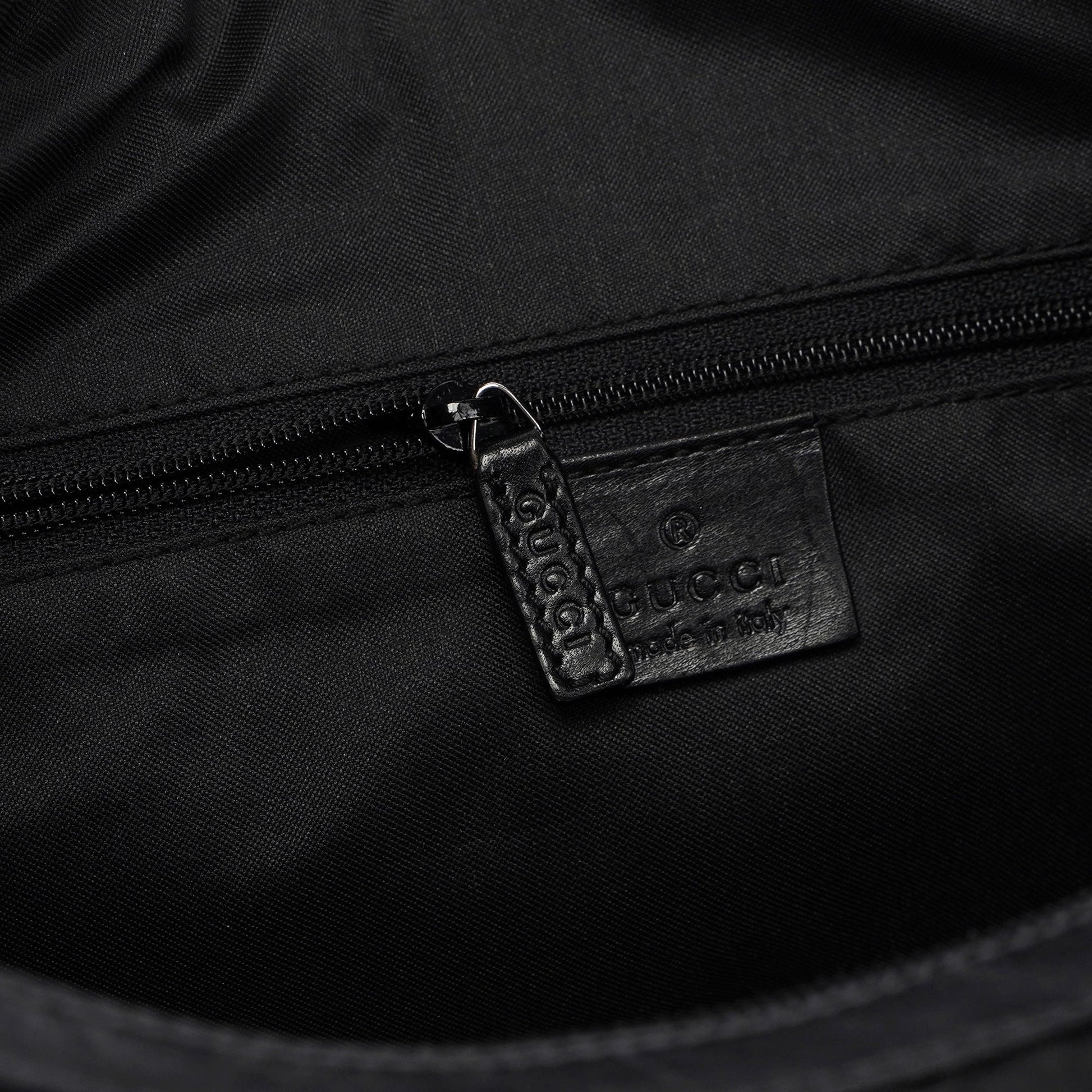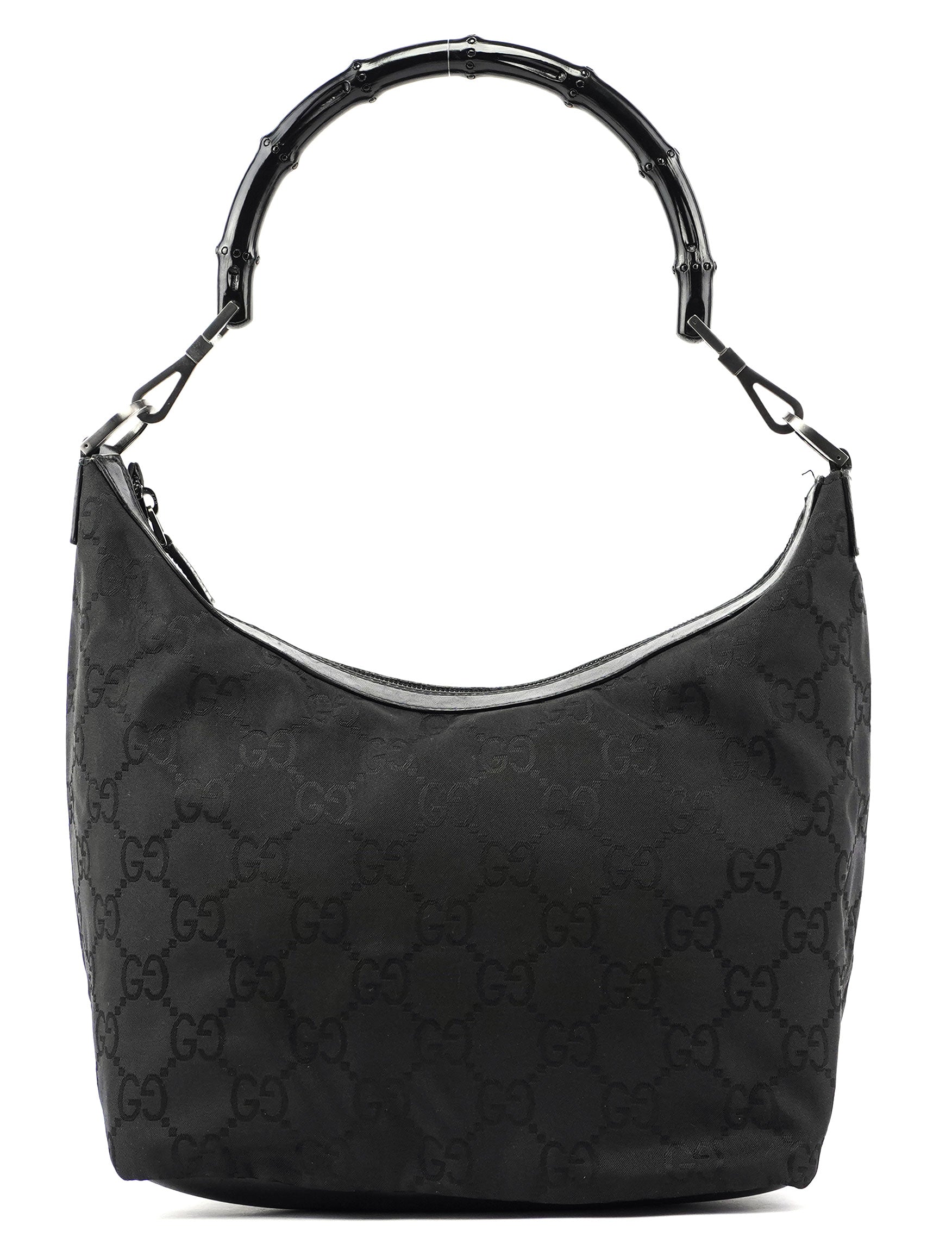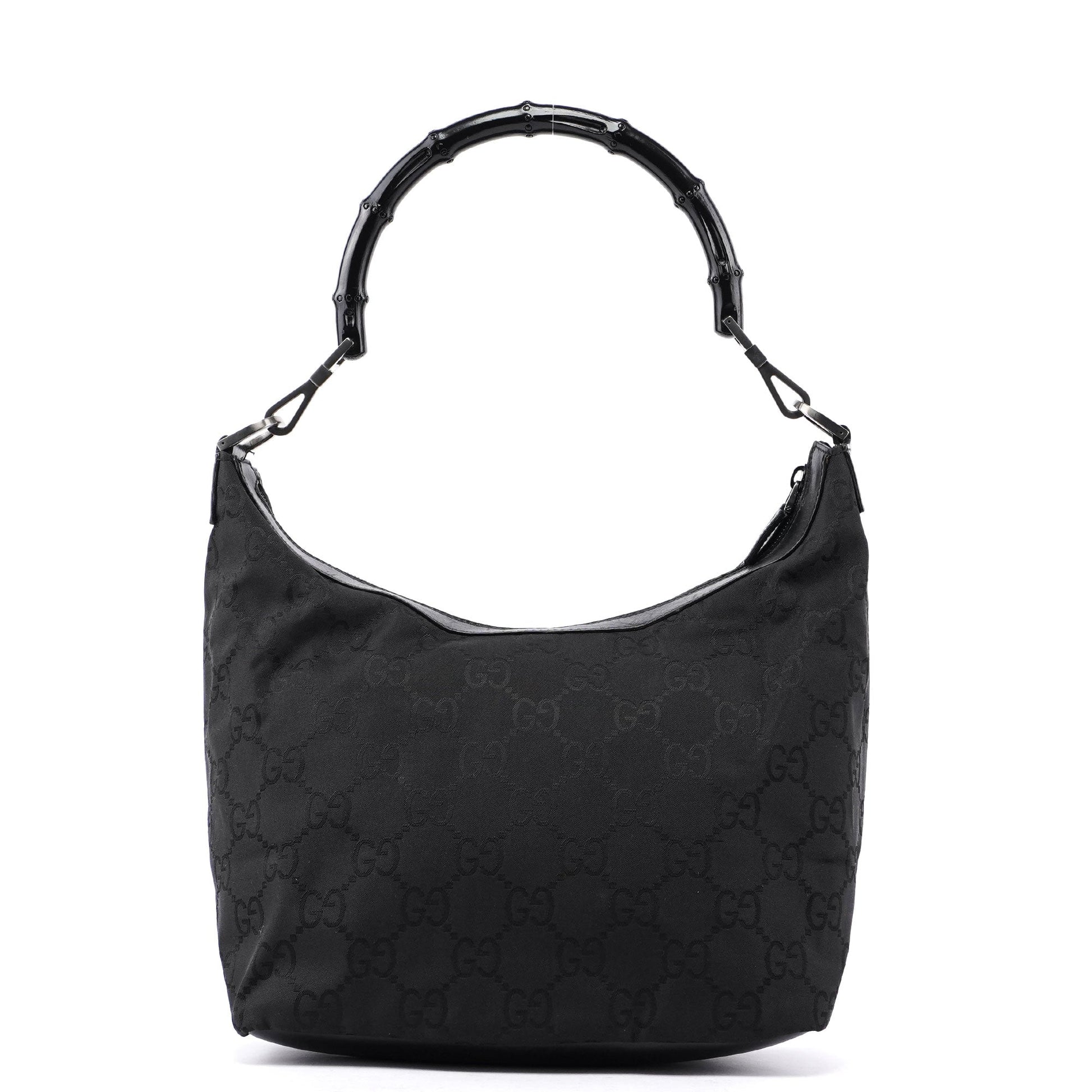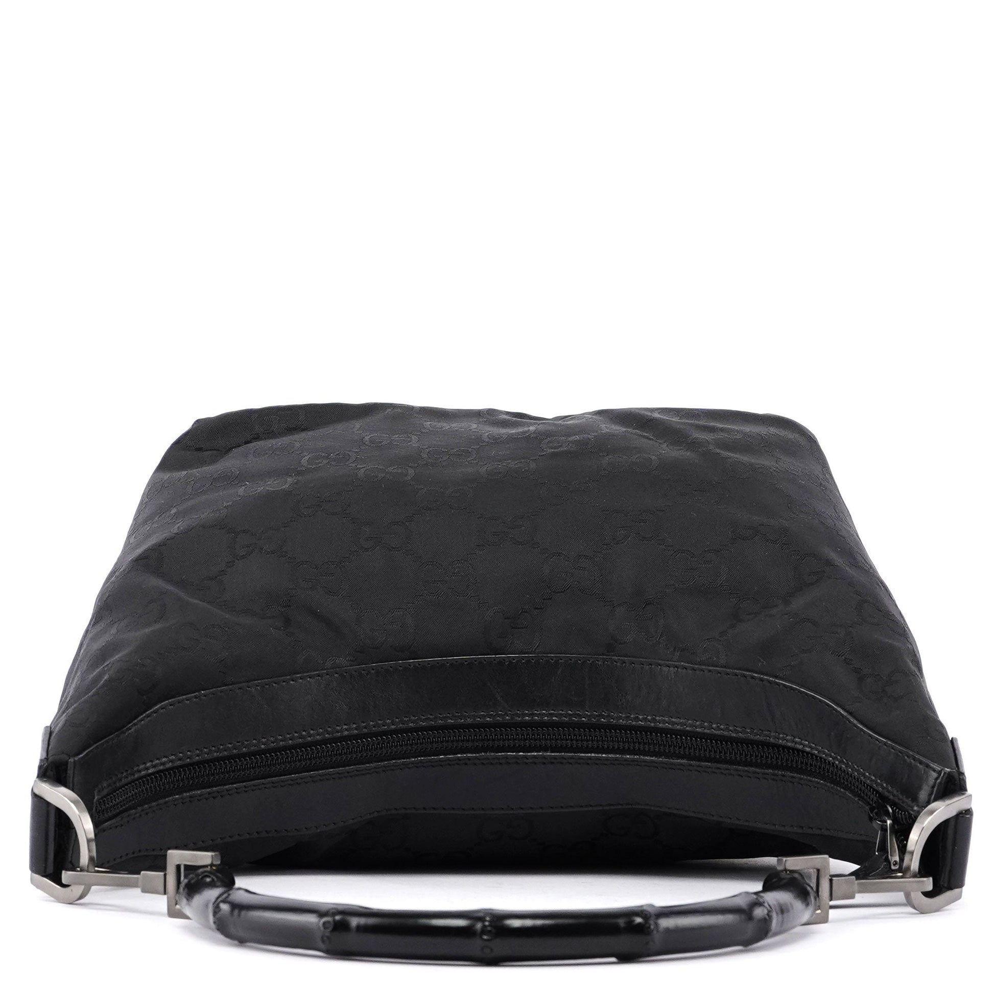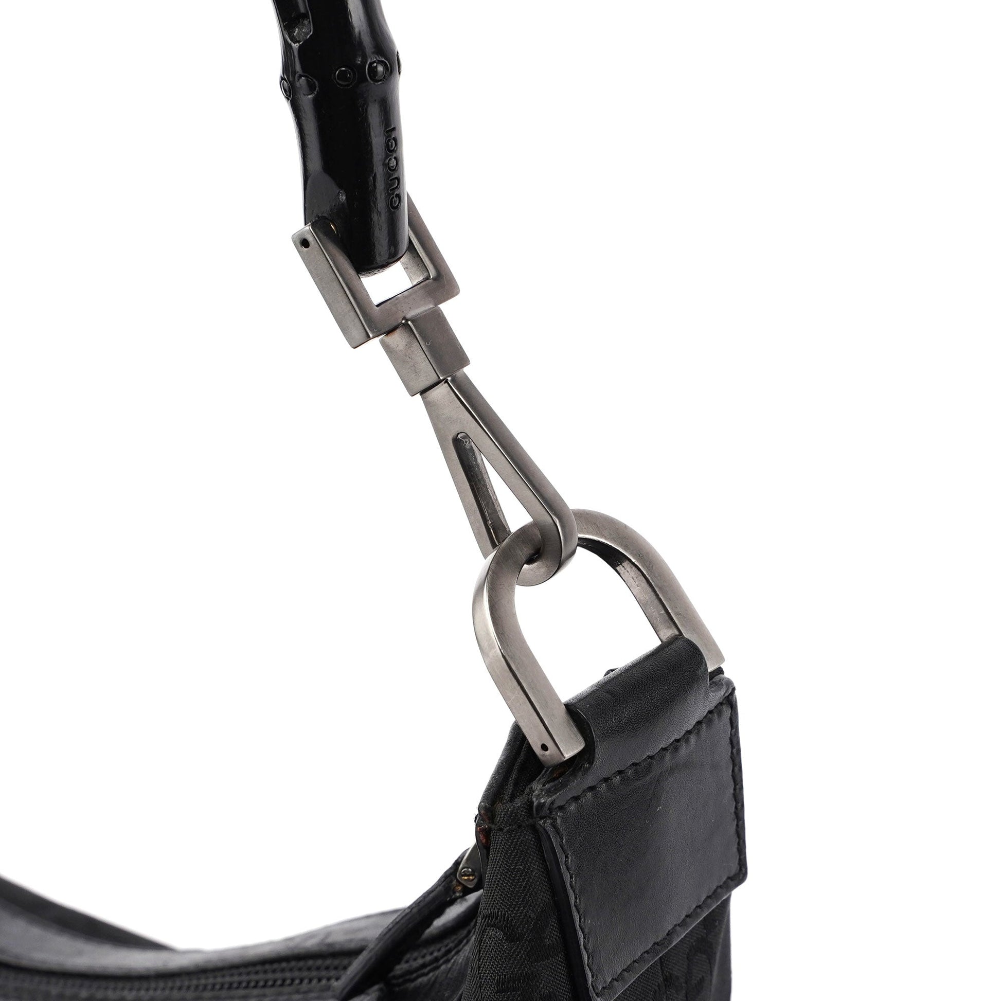 This Gucci Bamboo shoulder bag, a timeless classic designed in the late 1990s by Tom Ford. The iconic bamboo handle adds a touch of sophistication to the bag, while the black GG monogram canvas, anthracite hardware, and tonal leather trim create a stunning visual contrast. The bag's spacious zipper-closed compartment is lined with satin and includes an interior zipper pocket.