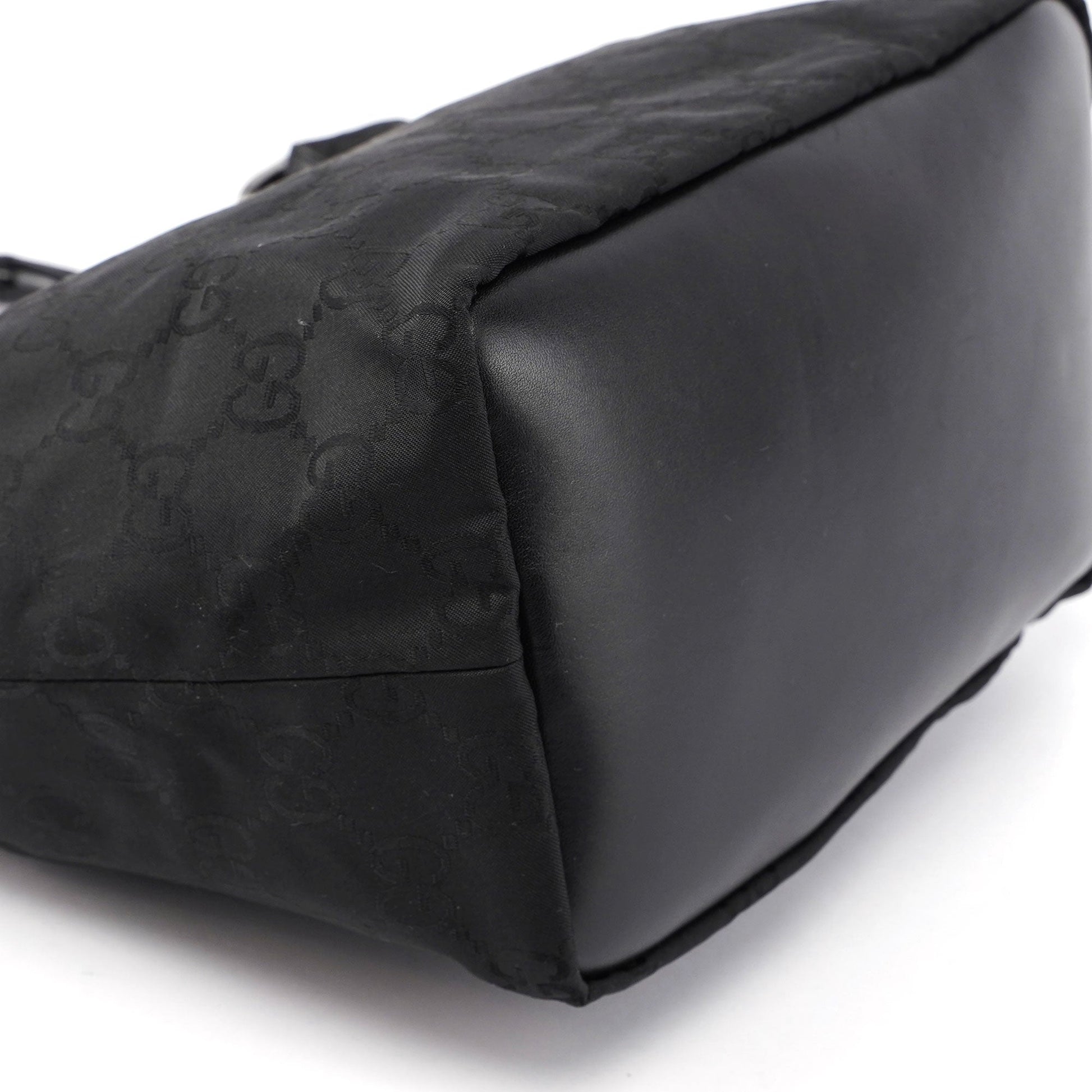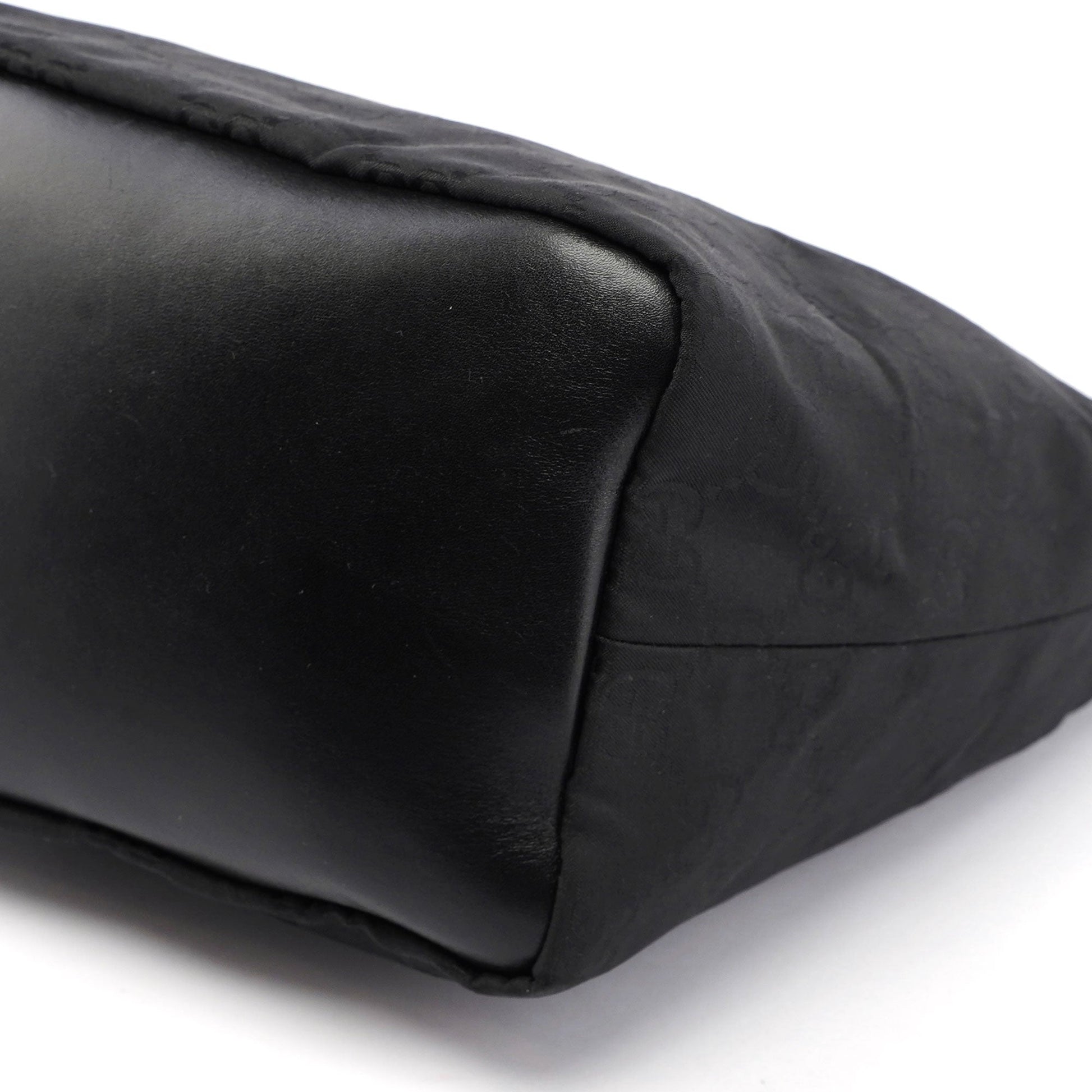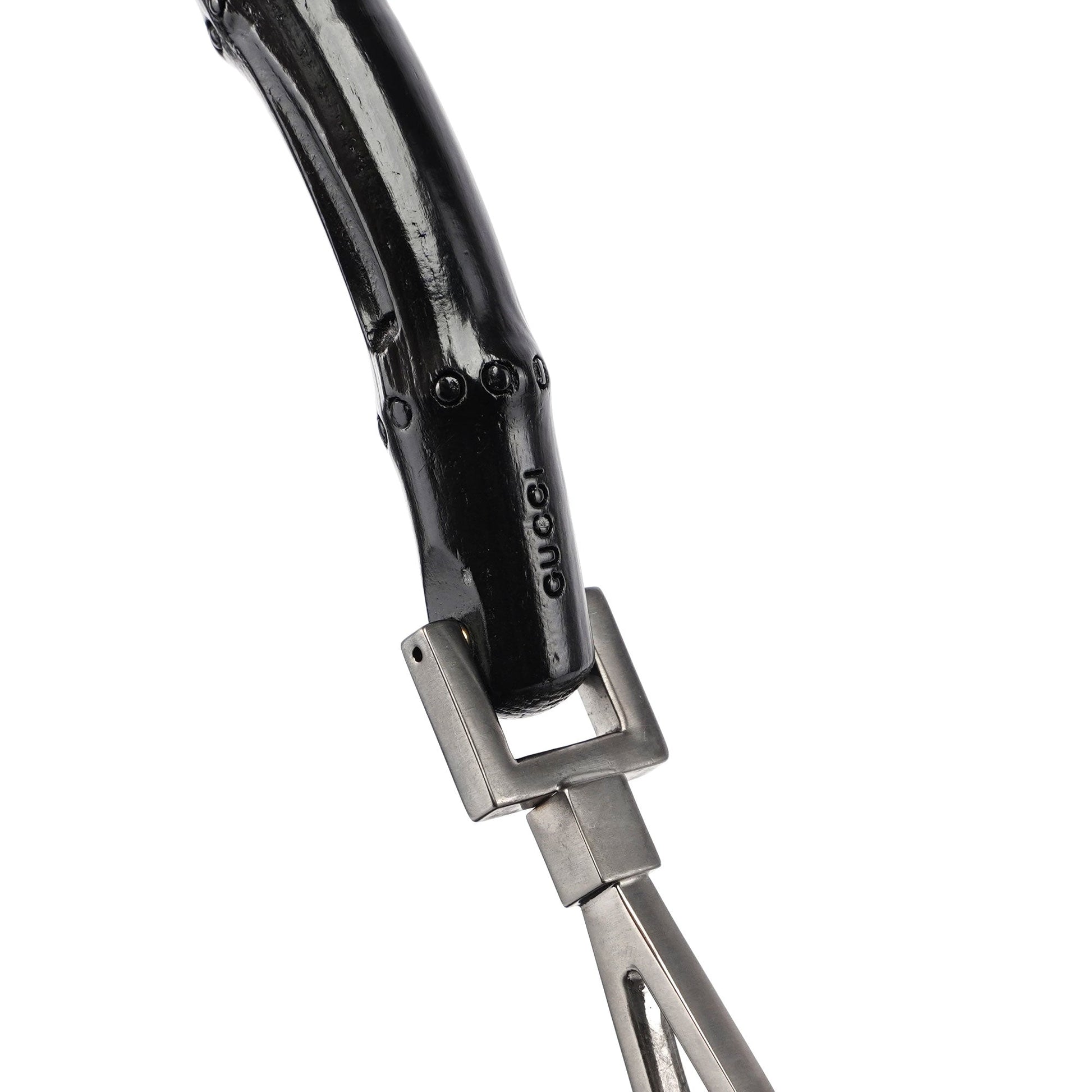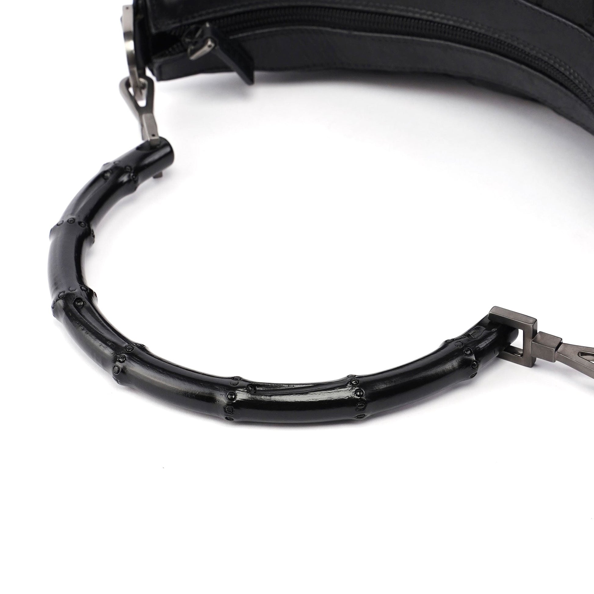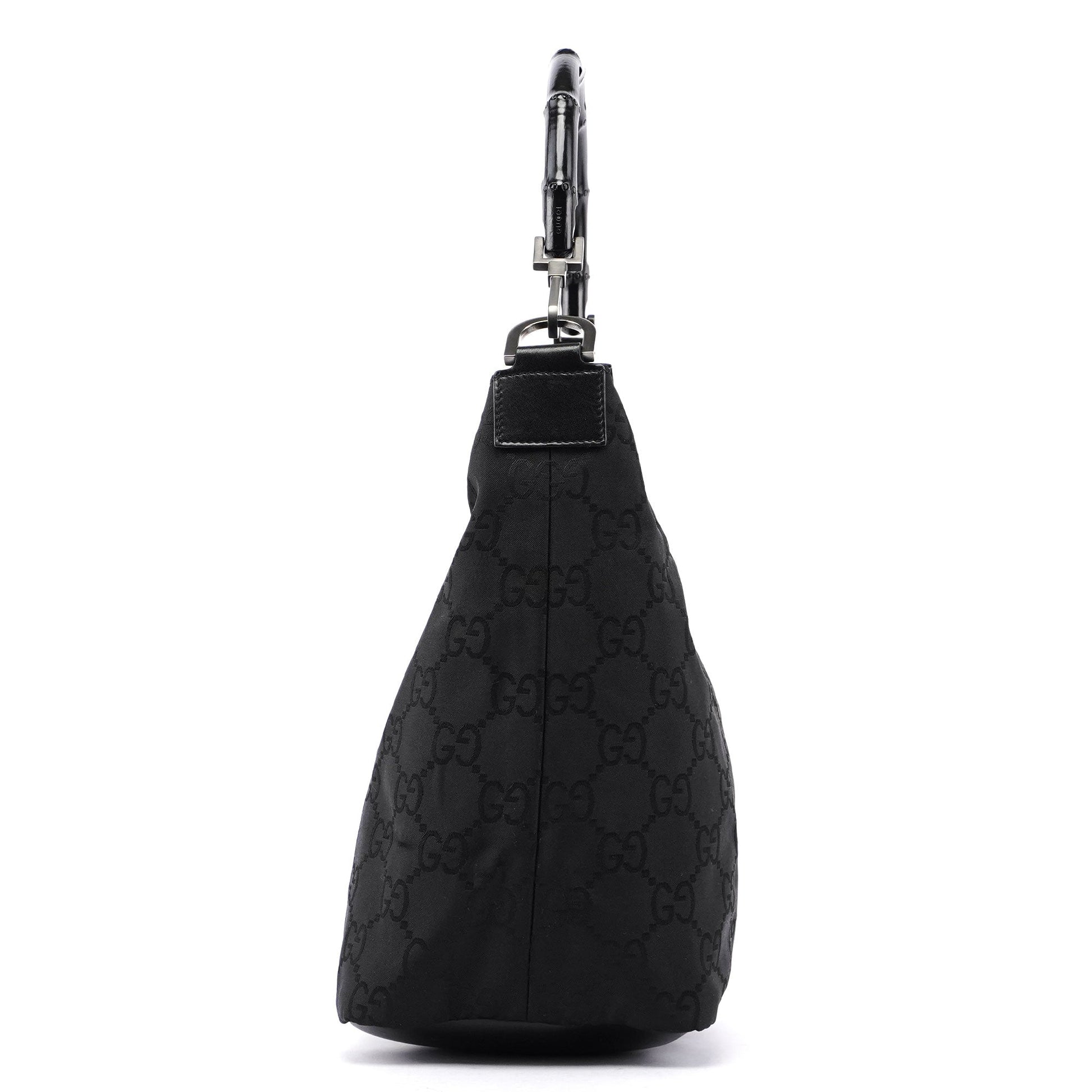 This Gucci Bamboo shoulder bag, a timeless classic designed in the late 1990s by Tom Ford. The iconic bamboo handle adds a touch of sophistication to the bag, while the black GG monogram canvas, anthracite hardware, and tonal leather trim create a stunning visual contrast. The bag's spacious zipper-closed compartment is lined with satin and includes an interior zipper pocket.