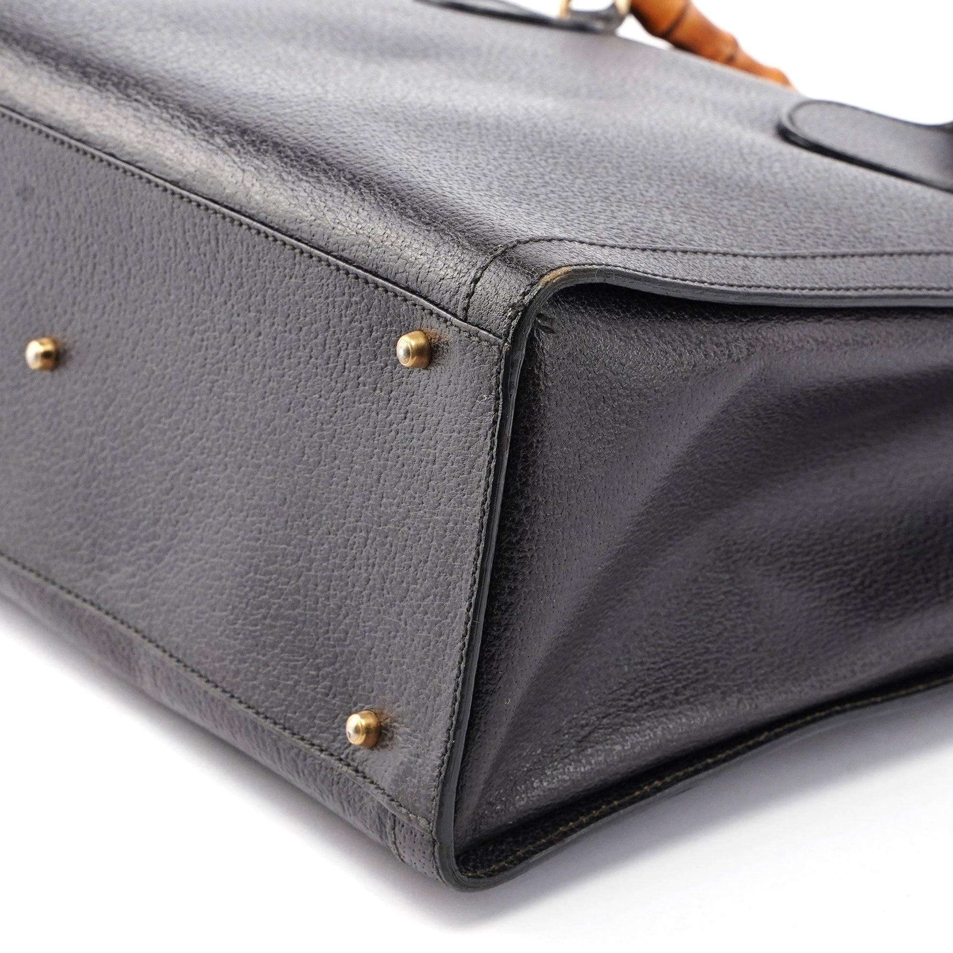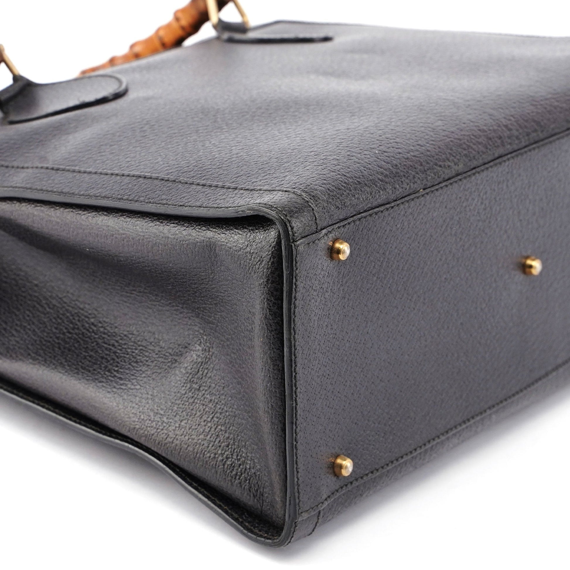 Designed by Tom Ford in 1996, the Gucci Bamboo tote boasts elegance and style. Handcrafted from black textured leather with gold-tone hardware, it features a magnetic closure for easy access. The satin-lined interior includes a practical zipper pocket.