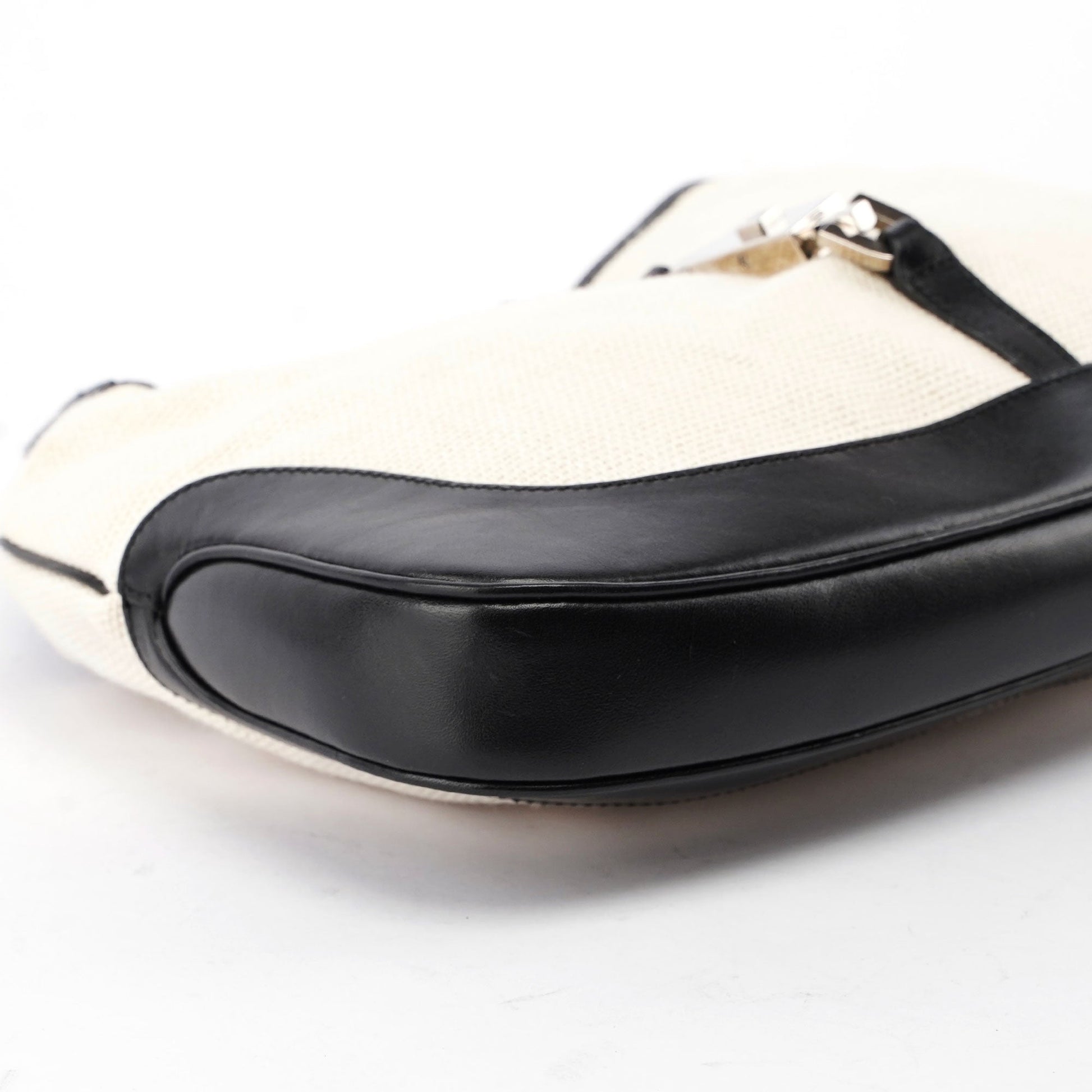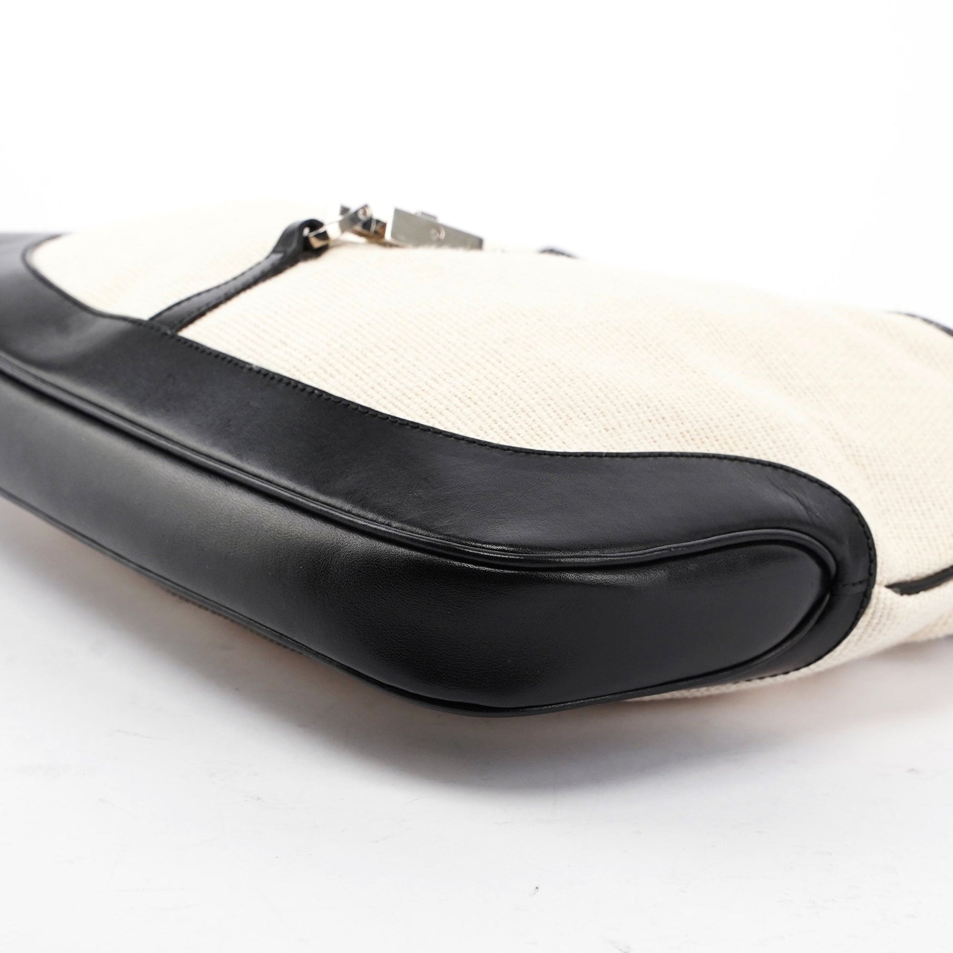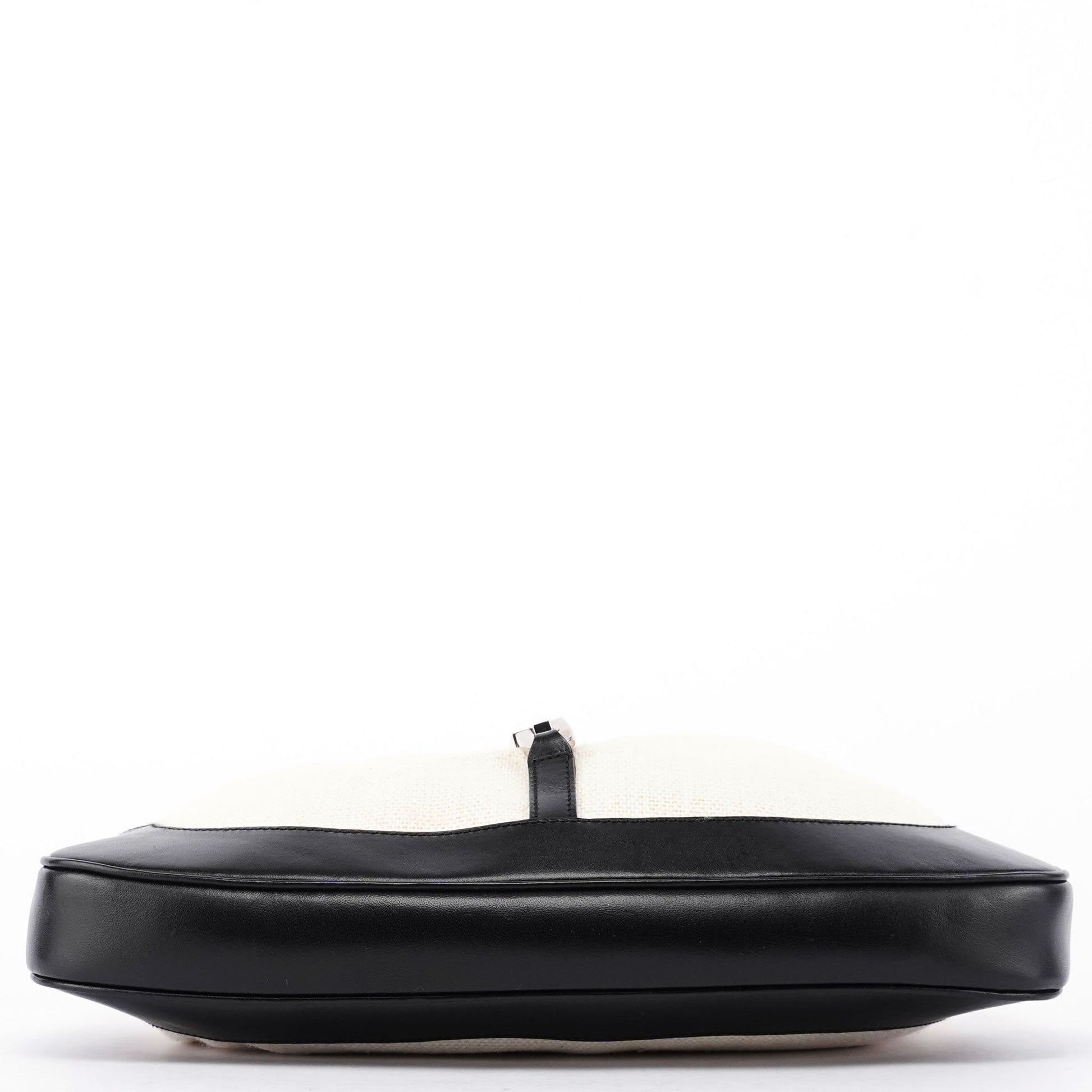Discover the Gucci Jackie Chain bag, designed by Tom Ford in the late 1990s, blending beige canvas and calfskin leather trim. Its classic silver-tone chain handle has an engraved Gucci logo and beautifully complements the classic Jackie clasp closure. The satin-lined interior adds a luxurious touch to this timeless piece.
