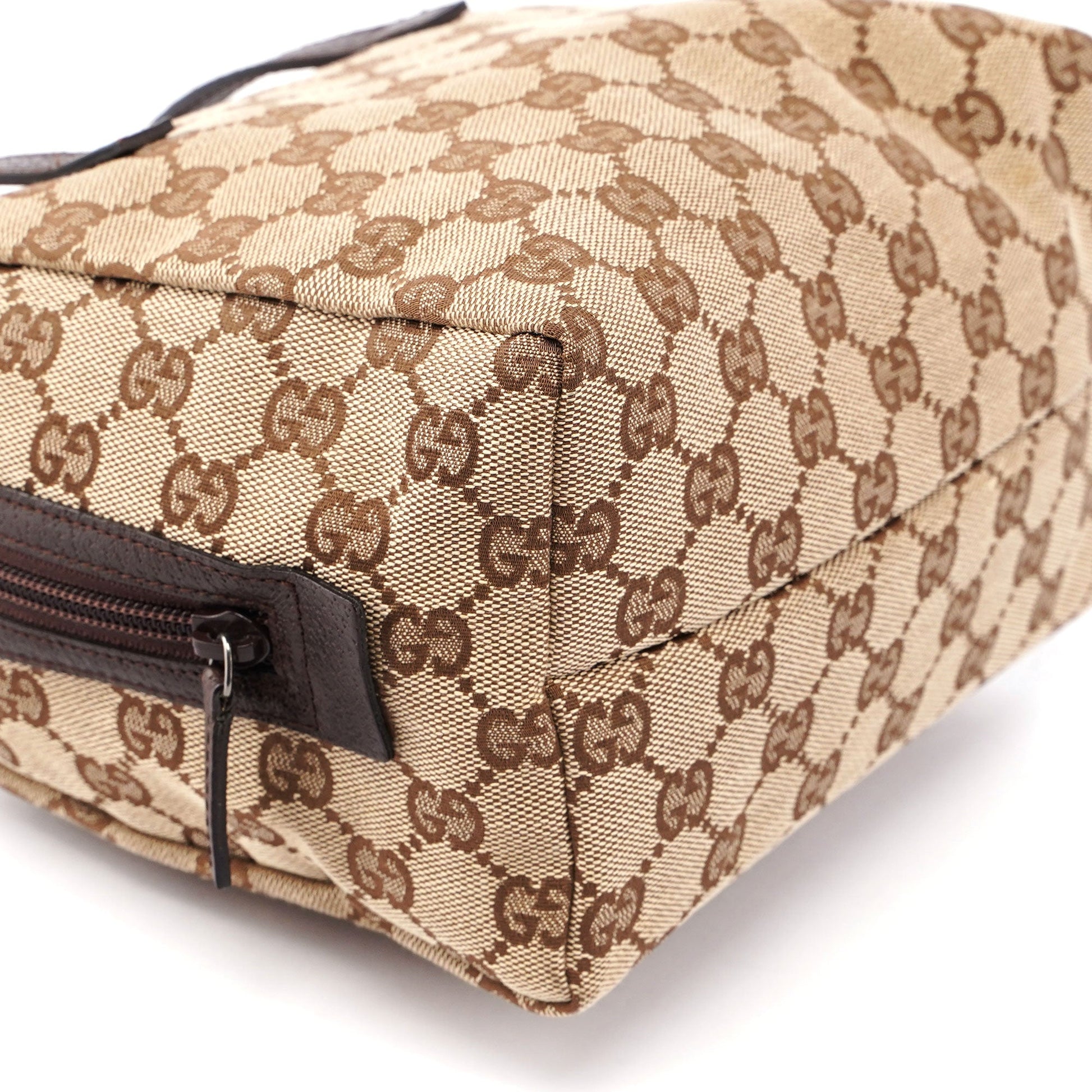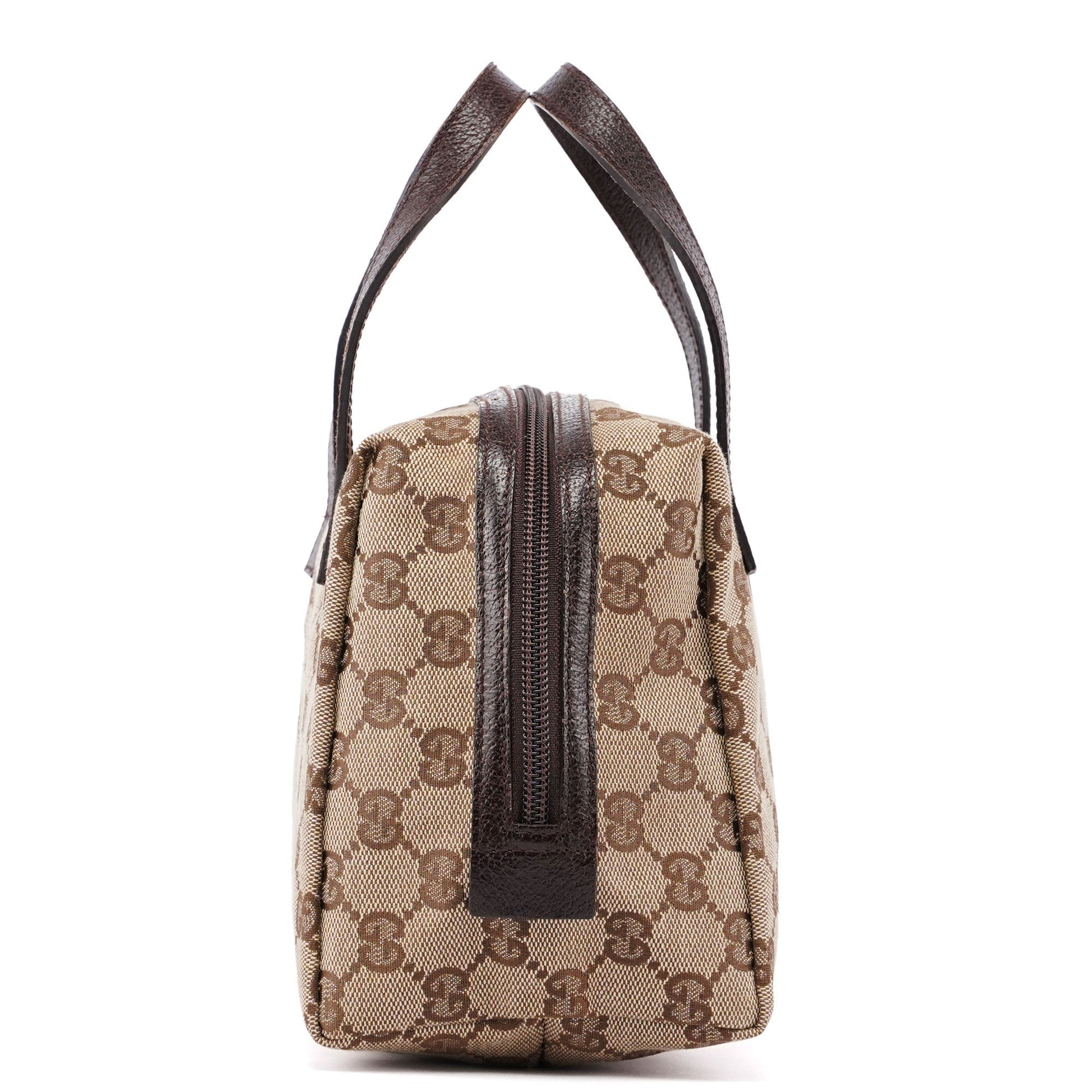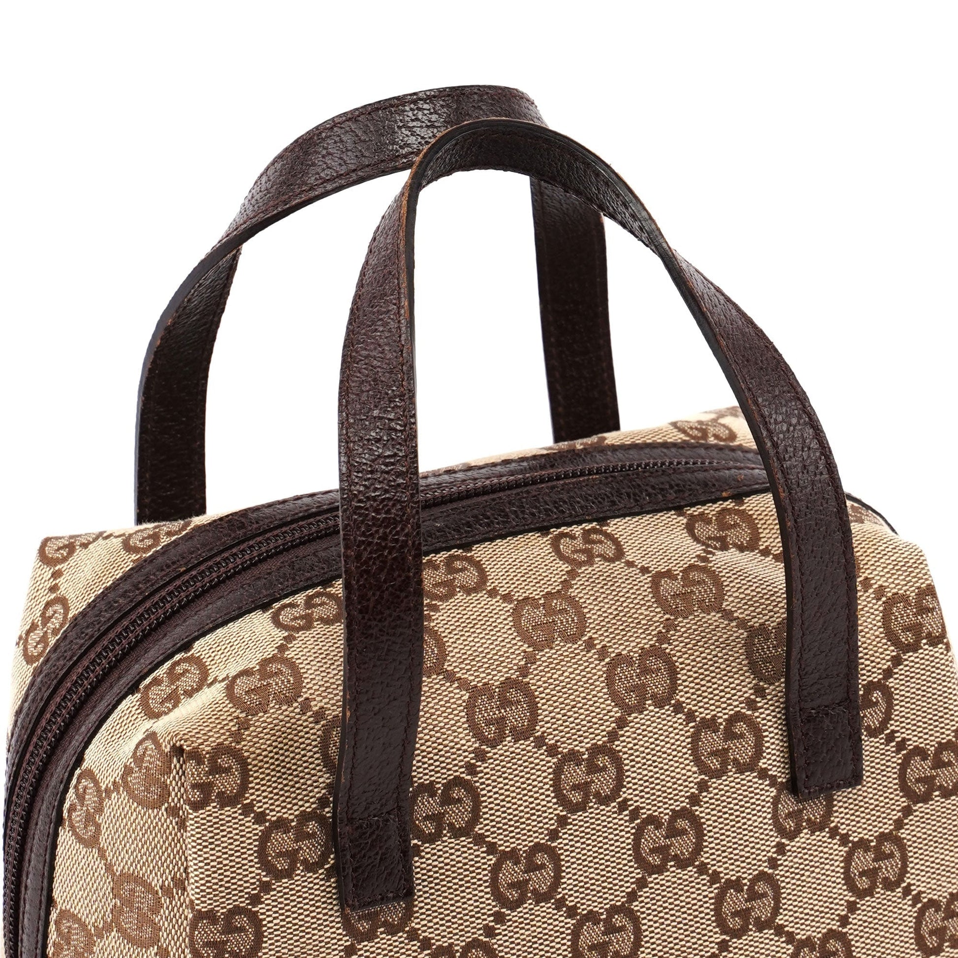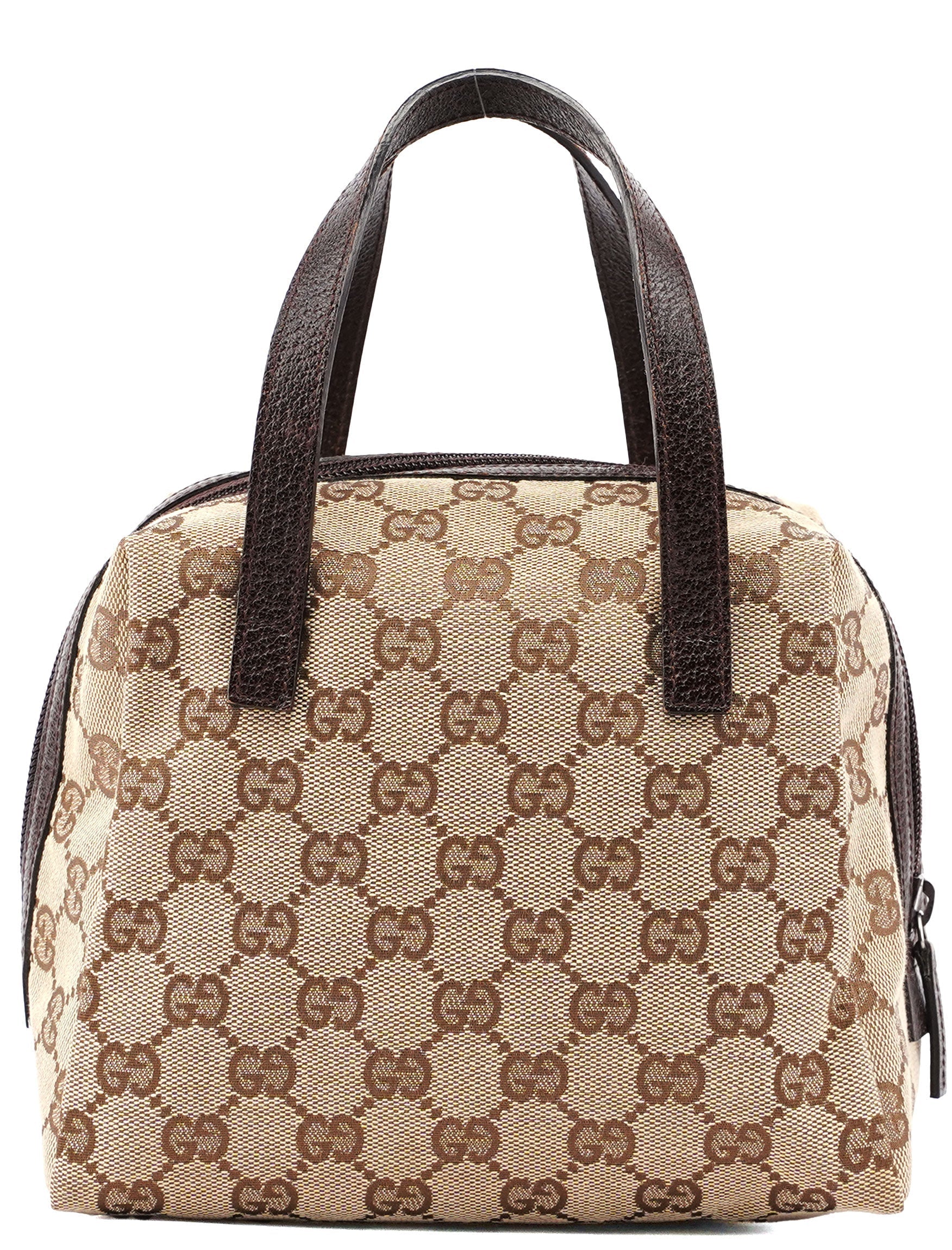 Designed by Tom Ford in the late 1990's, the Gucci GG Bowling bag exudes timeless elegance. Handcrafted from GG beige monogram canvas with brown leather trim, it features a secure zipper closure. Inside, the satin lining adds a luxurious touch.
