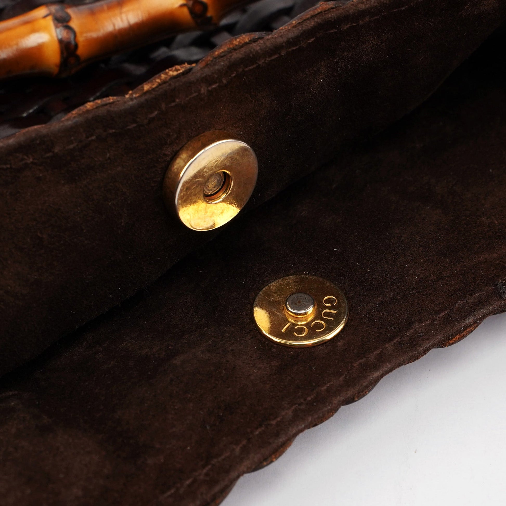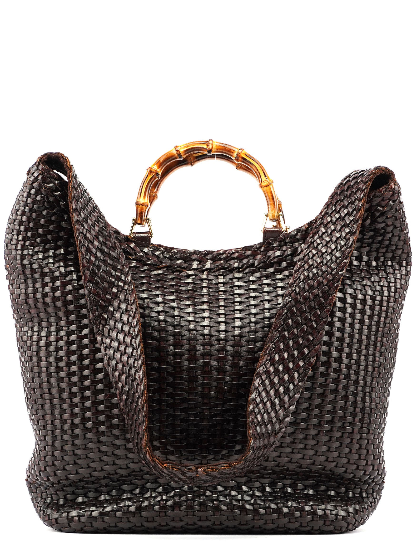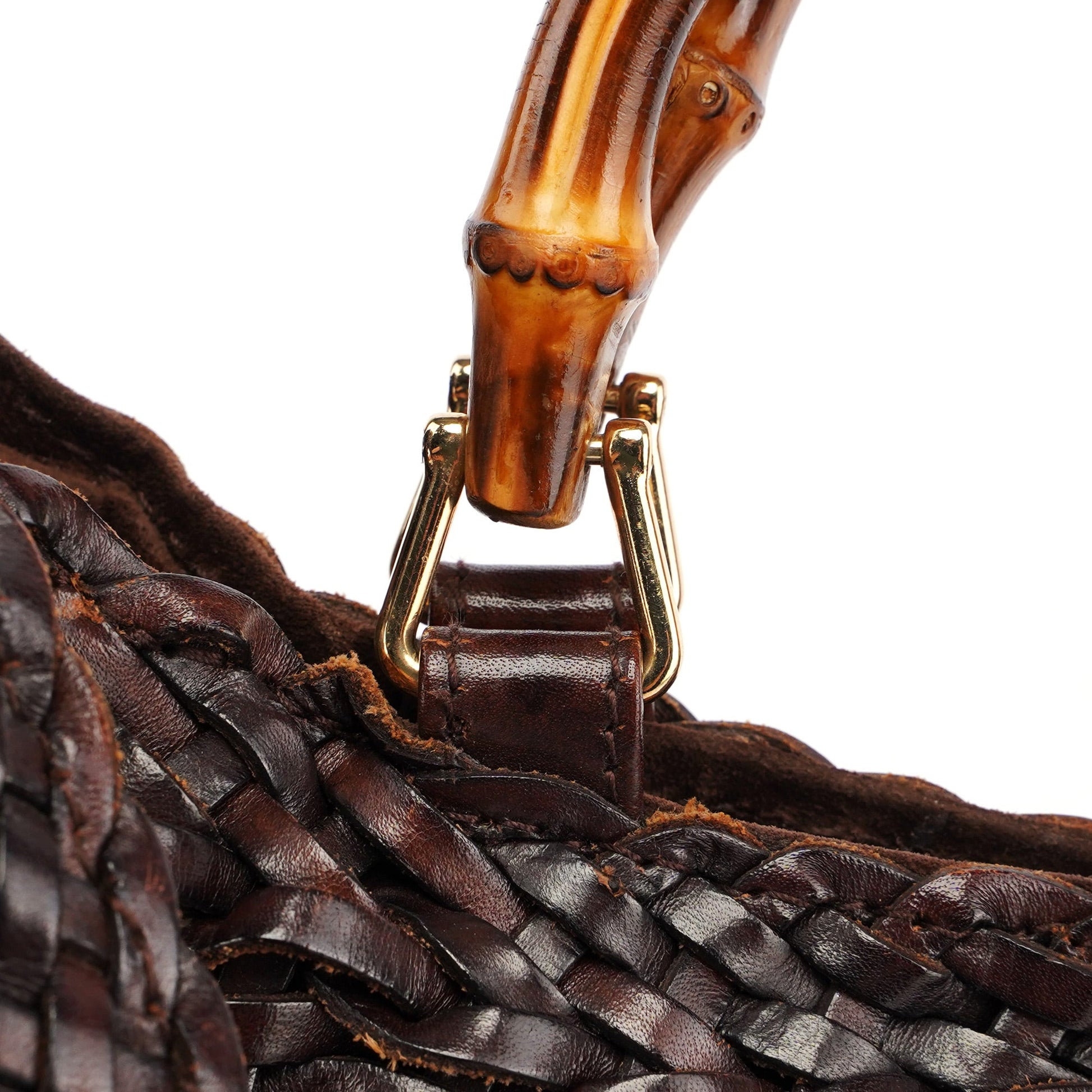 Designed by Tom Ford in 1996, this Bamboo 2-way bag is a testament to artisanal craftsmanship, handwoven in rich brown leather. It features two bamboo handles and gold-tone hardware, complemented by a magnetic closure. A leather shoulder strap offers versatile options. The interior, lined with suede, includes an interior zipper pocket.