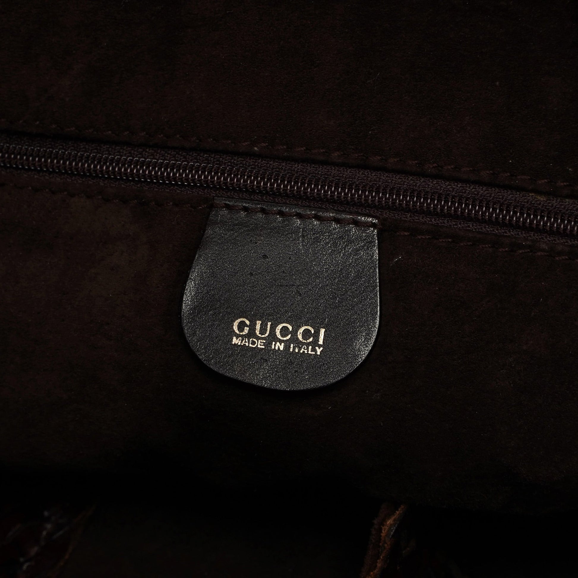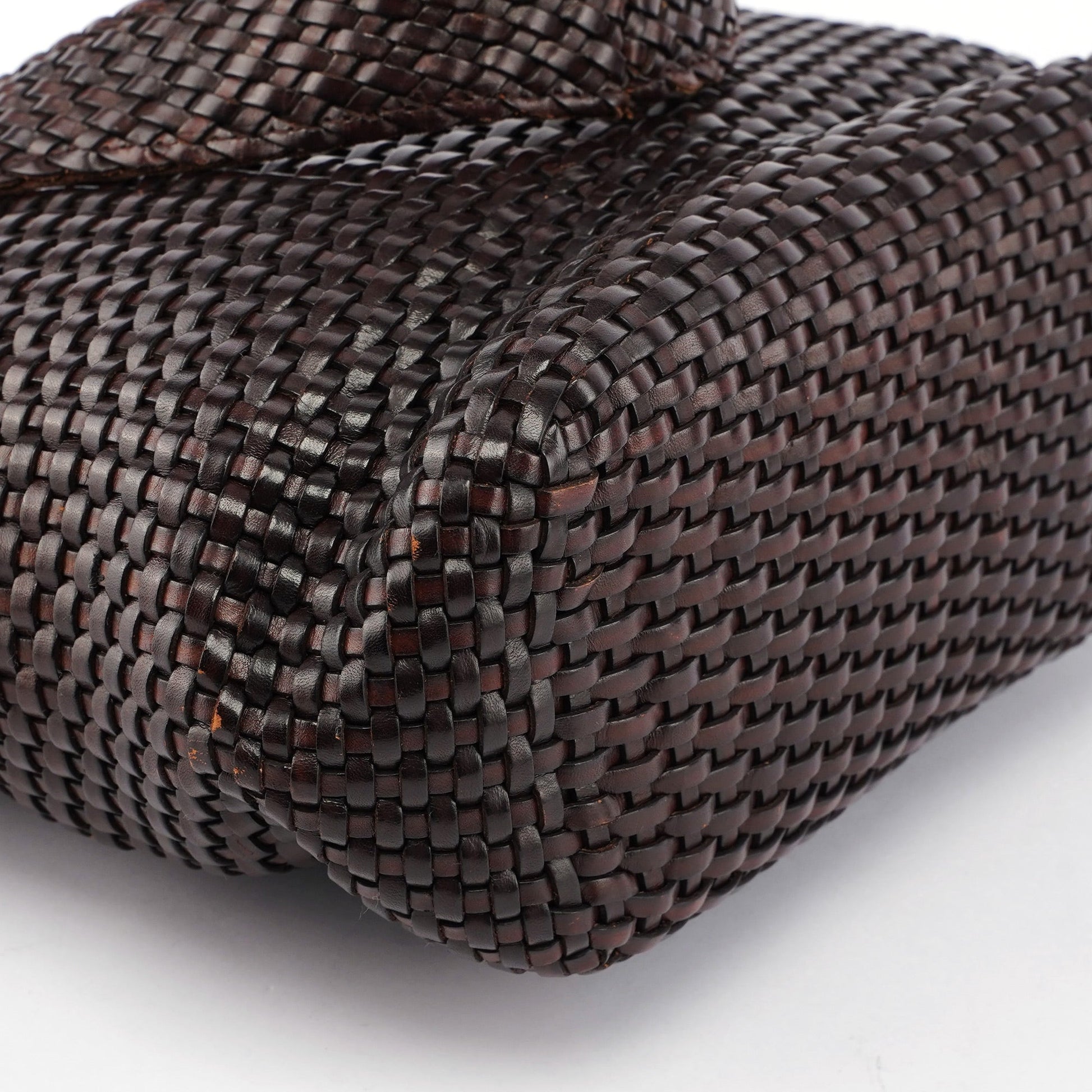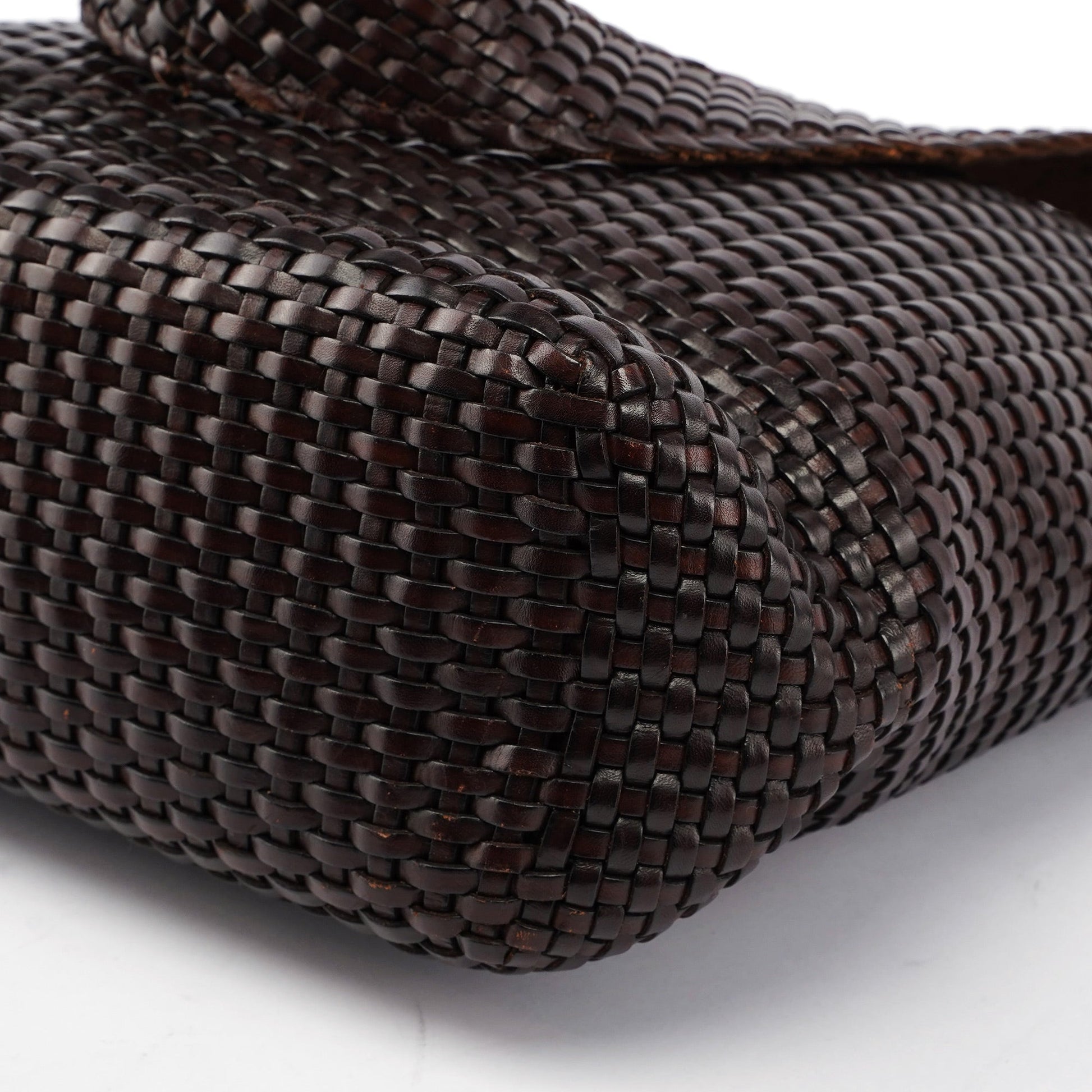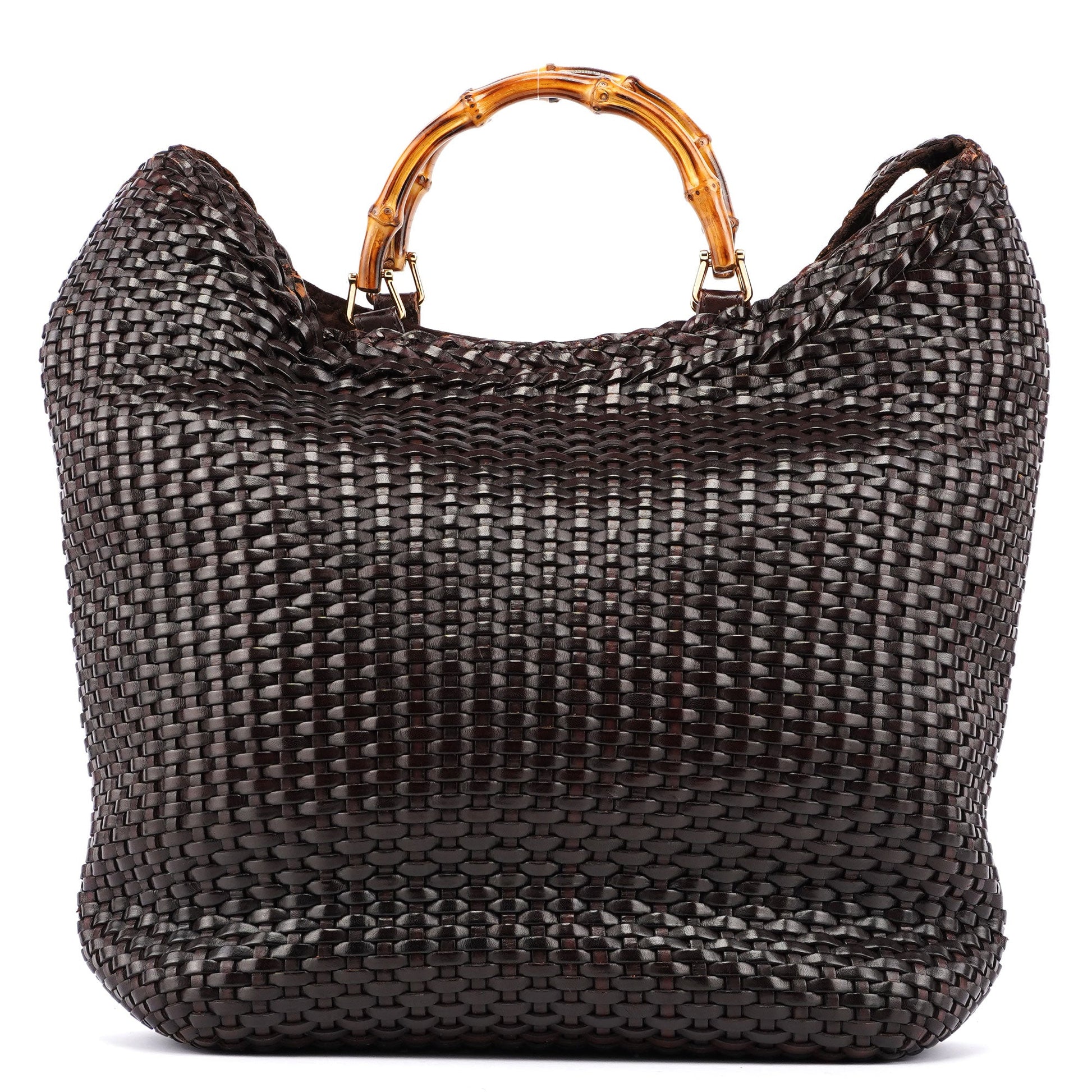 Designed by Tom Ford in 1996, this Bamboo 2-way bag is a testament to artisanal craftsmanship, handwoven in rich brown leather. It features two bamboo handles and gold-tone hardware, complemented by a magnetic closure. A leather shoulder strap offers versatile options. The interior, lined with suede, includes an interior zipper pocket.