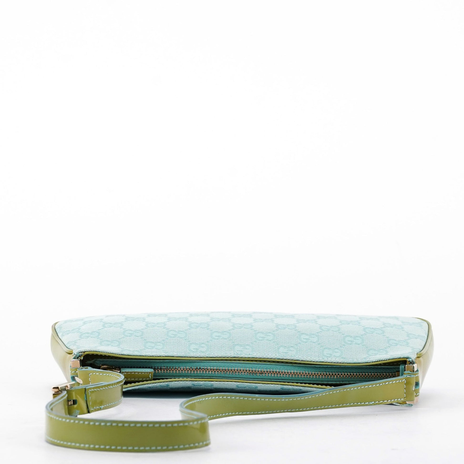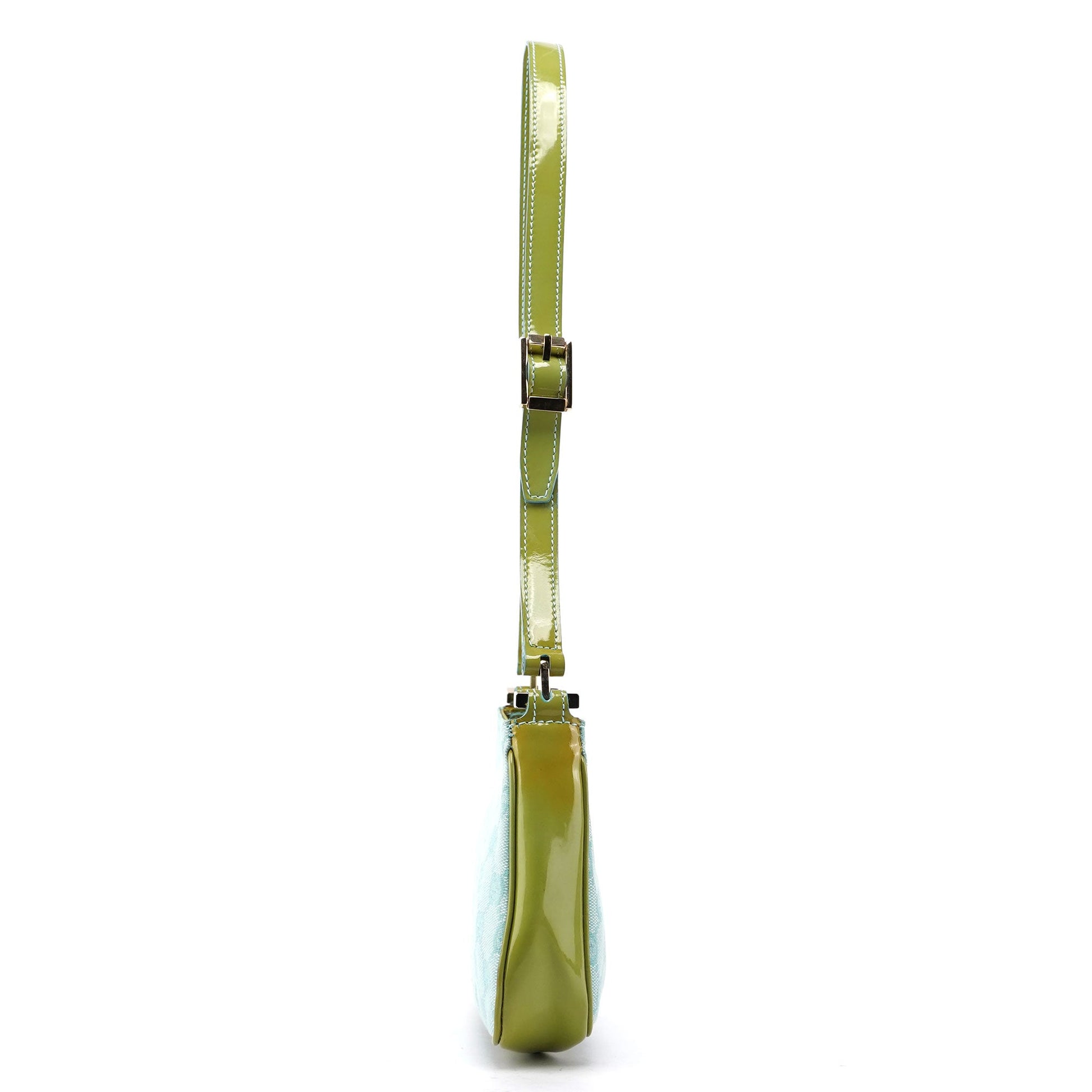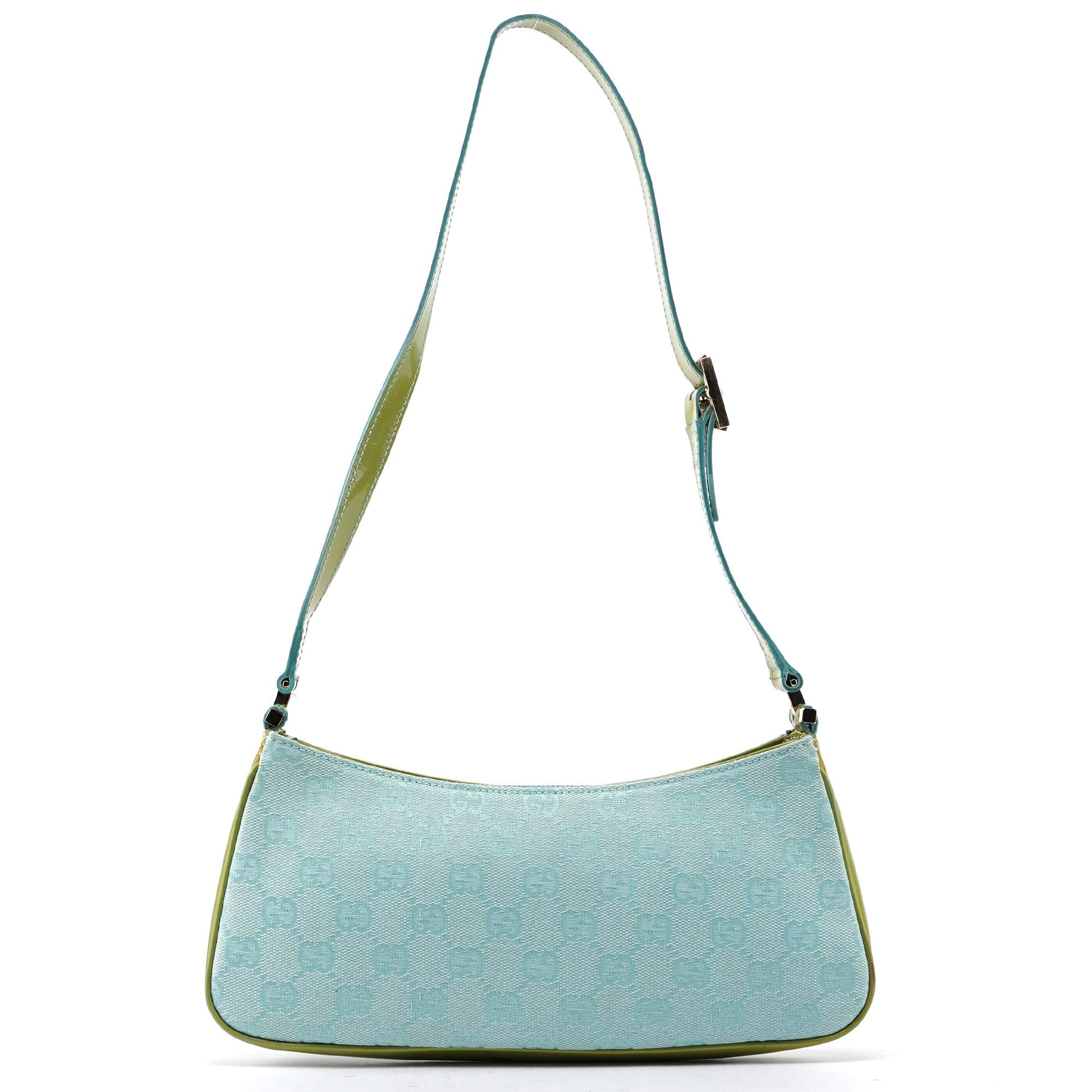 Designed by Tom Ford in the late 1990s, the Gucci GG mini bag showcases a blue GG monogram canvas paired with contrasting green patent leather. Its gold-tone hardware accents add a touch of elegance. Lined with satin, it features a small interior pocket for essentials.