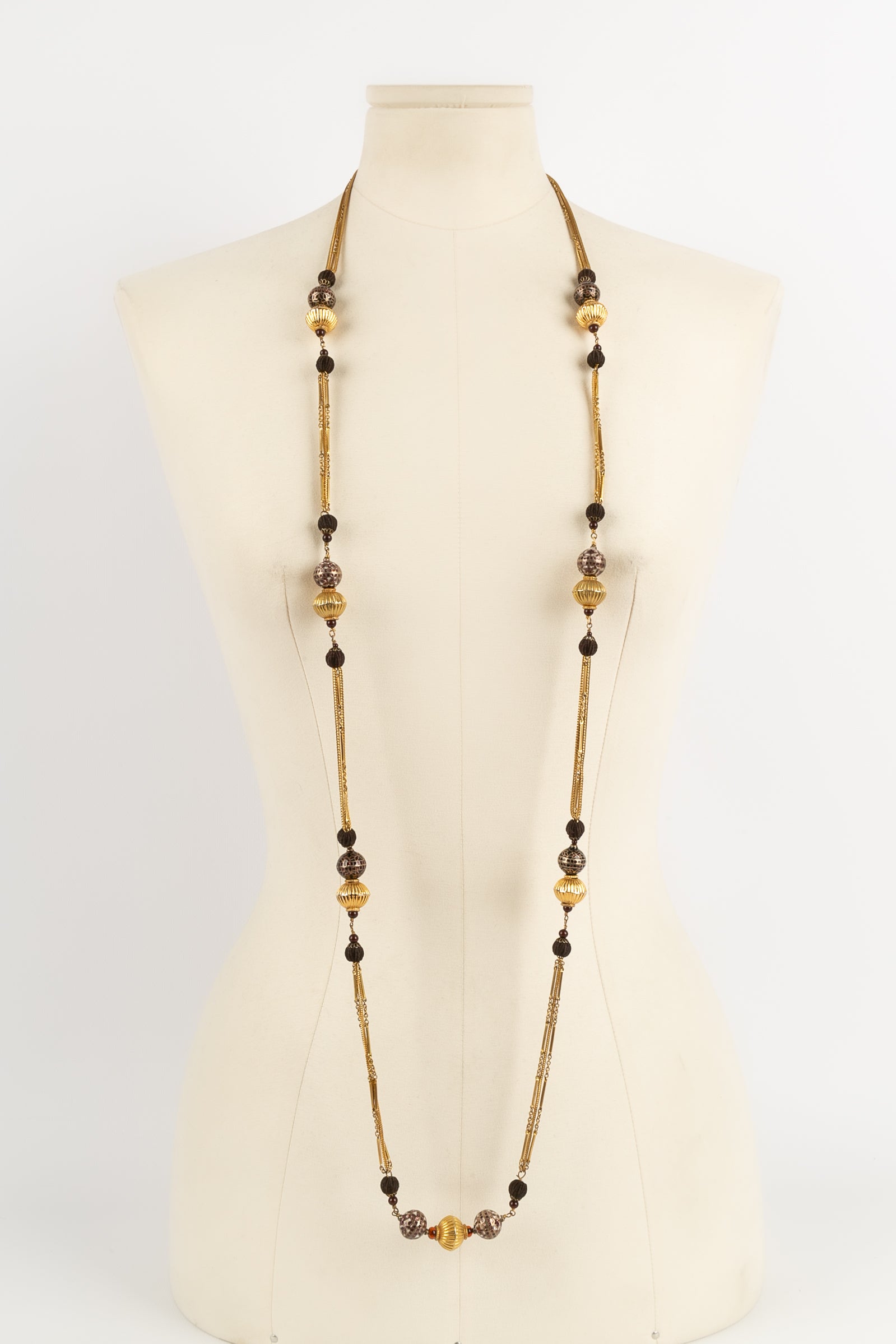 CHANEL -Sautoir en métal doré décoré de perles en tissu et métal.