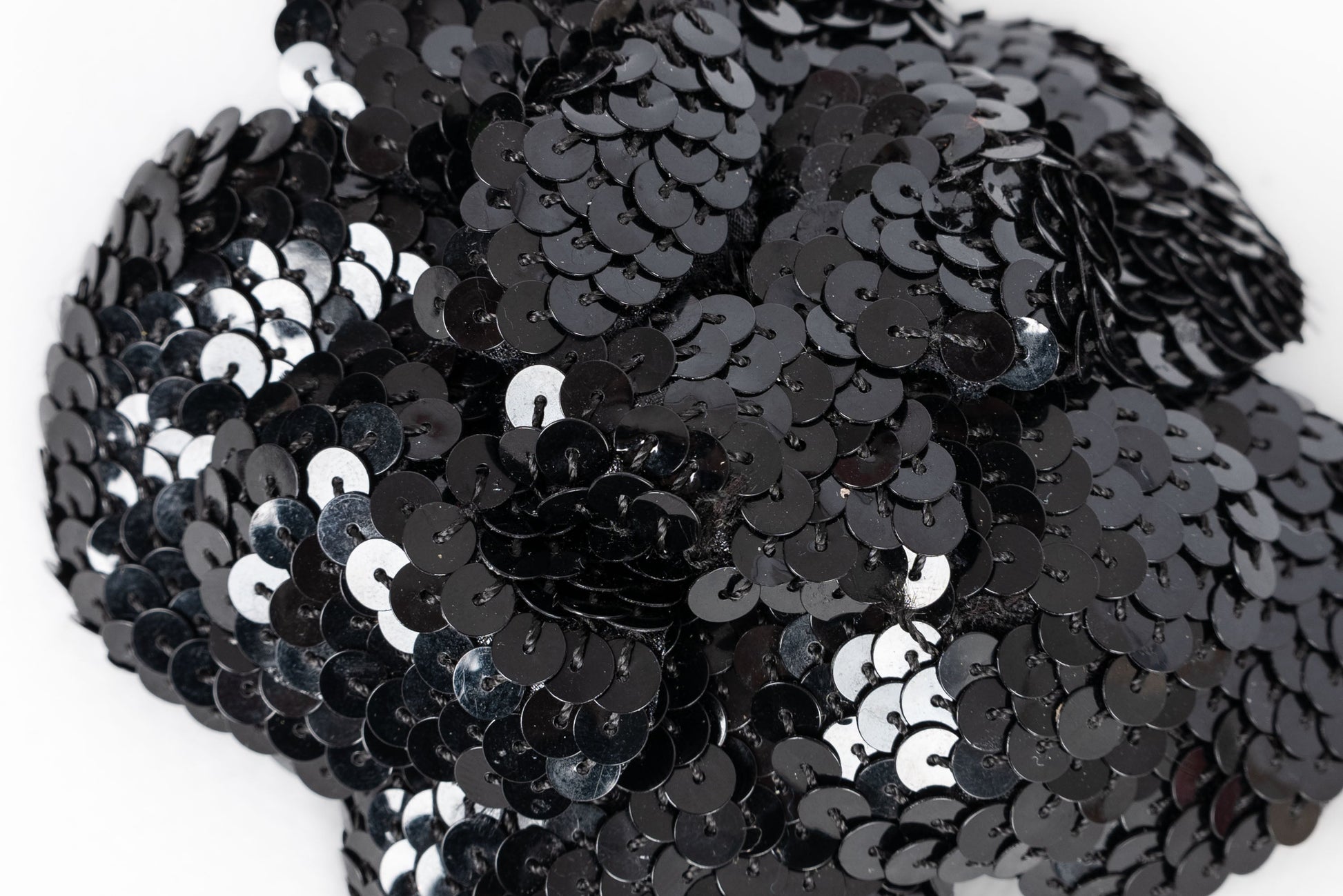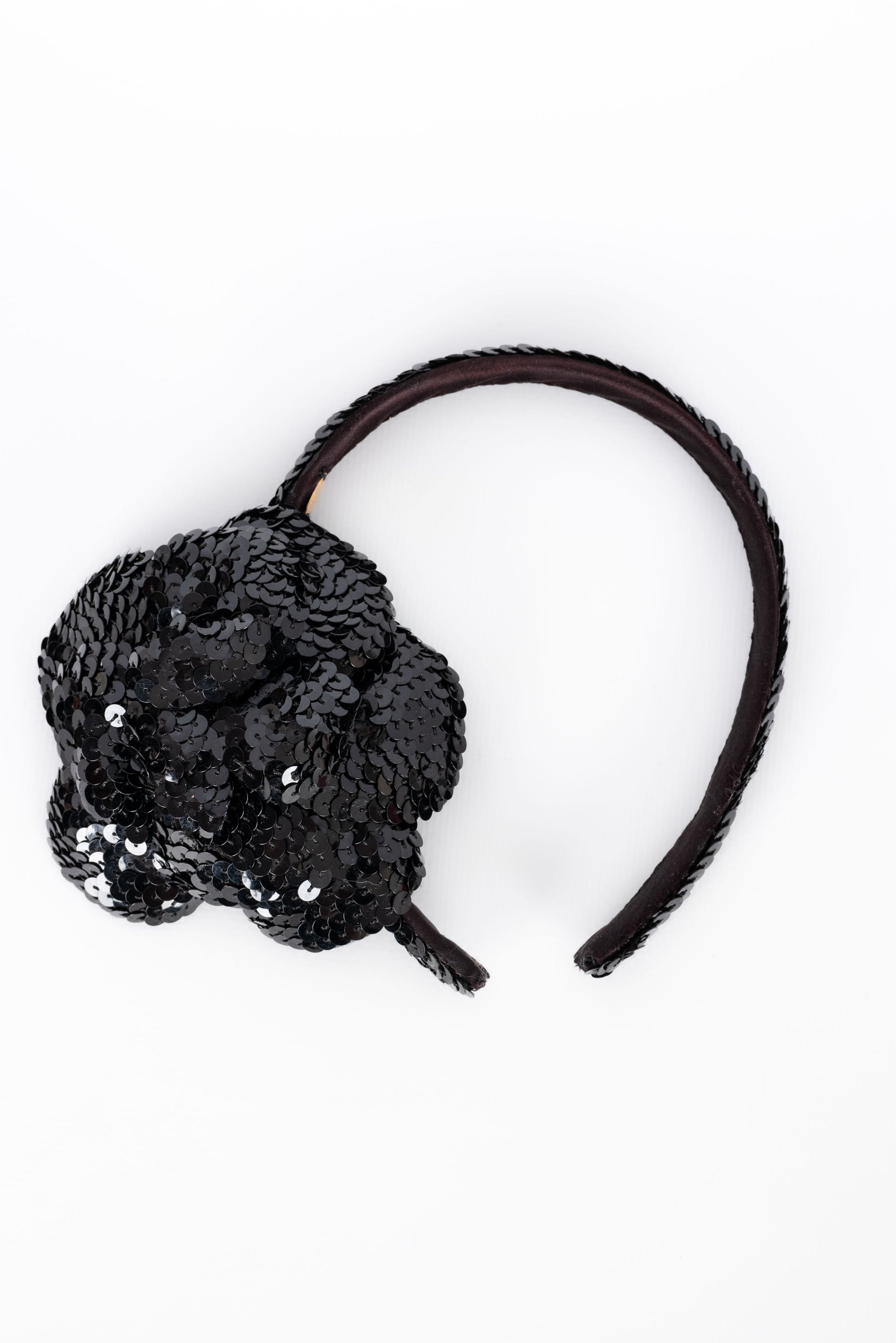 CHANEL -(Made in France) Serre-tête à paillettes noires décoré d'un camélia.