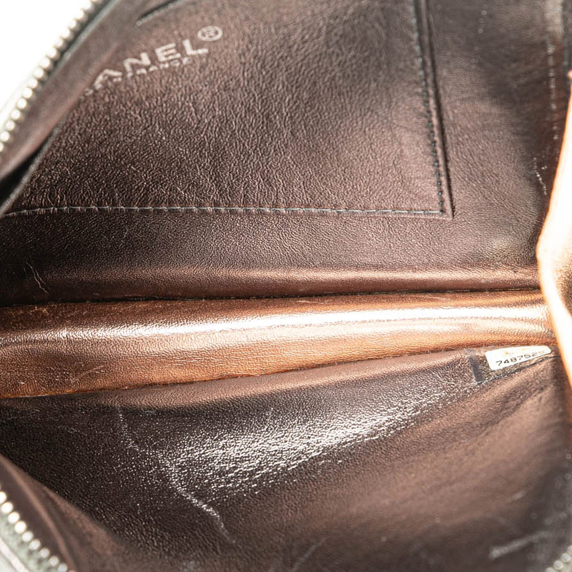 Product Details: Silver Chanel Chocolate Bar Lambskin Handcuff Wristlet Clutch Bag. This clutch bag features a quilted leather body, a zip-around closure, a woven leather chain wrist strap and silver-tone hardware, and an interior slip pocket. 4.9" L x 7.5" W x 0.8" D, 7.5" drop. Serial number 7487529.