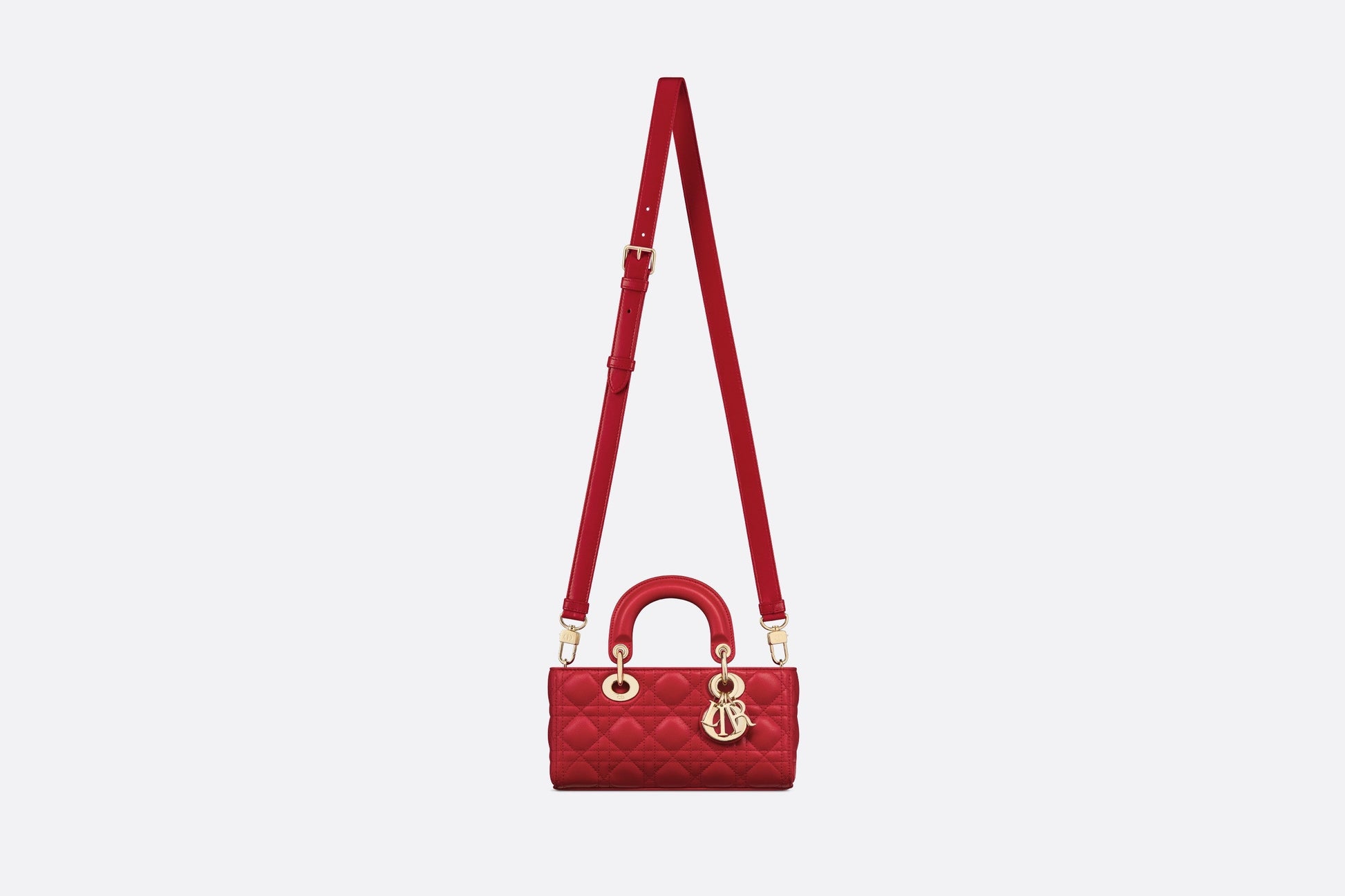 The Lady D-Joy bag captures the House's vision of elegance and beauty by showcasing the iconic streamlined aesthetic of the Lady Dior line. Crafted in amaryllis red lambskin with Cannage stitching, the refined and timeless style's quilted texture is immediately recognizable. Pale gold-finish metal D.I.O.R. charms elegantly illuminate its silhouette. Featuring one removable chain strap and another adjustable and removable leather strap, the small Lady D-Joy bag can be carried by hand, worn over the shoulder or crossbody as a daily companion.