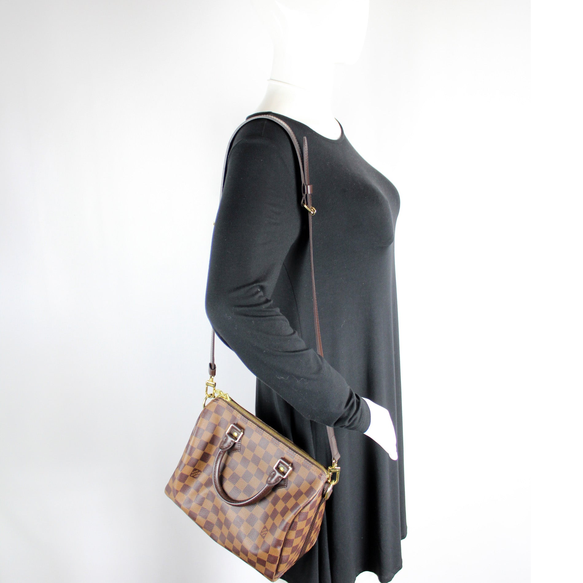 This Louis Vuitton Speedy 25 Bandouliere is guaranteed 100% . The exterior is in the classic Louis Vuitton Damier Ebene coated canvas.