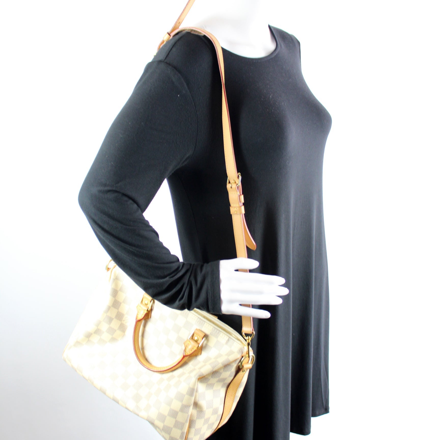 This Louis Vuitton Speedy 30 is guaranteed 100% . The exterior is in the classic Louis Vuitton Damier Azur coated canvas.