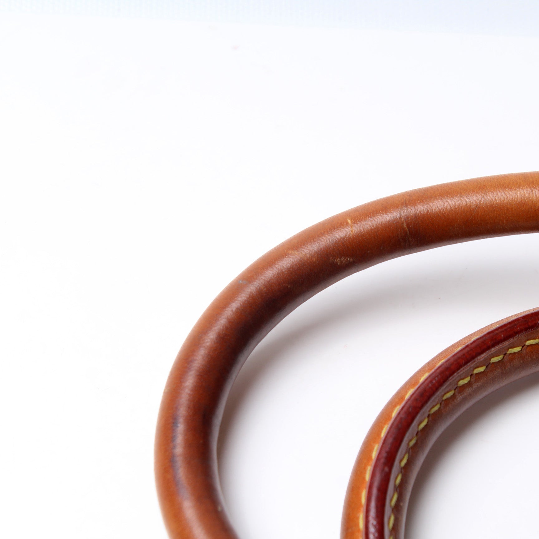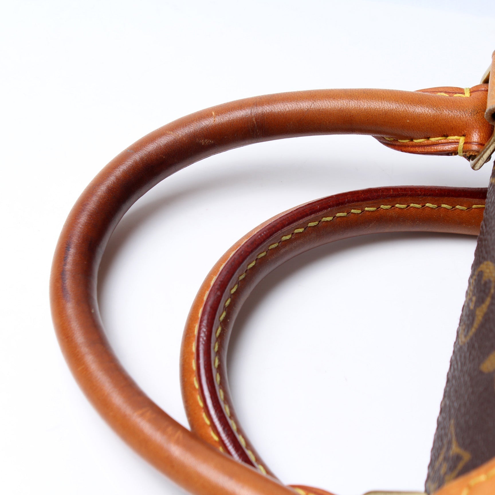 Handle: The leather handles show signs of wear and heavy discoloration.