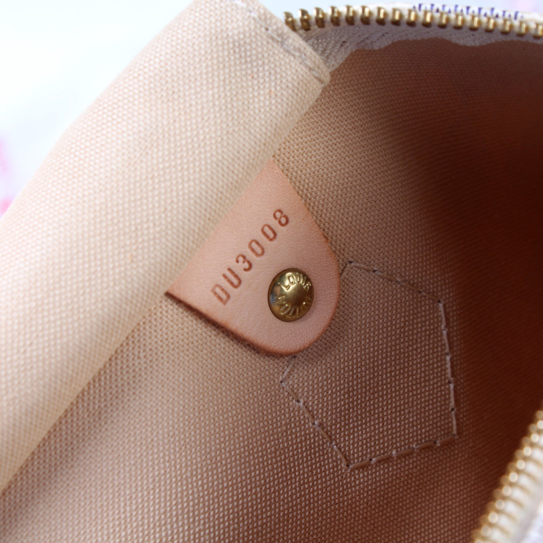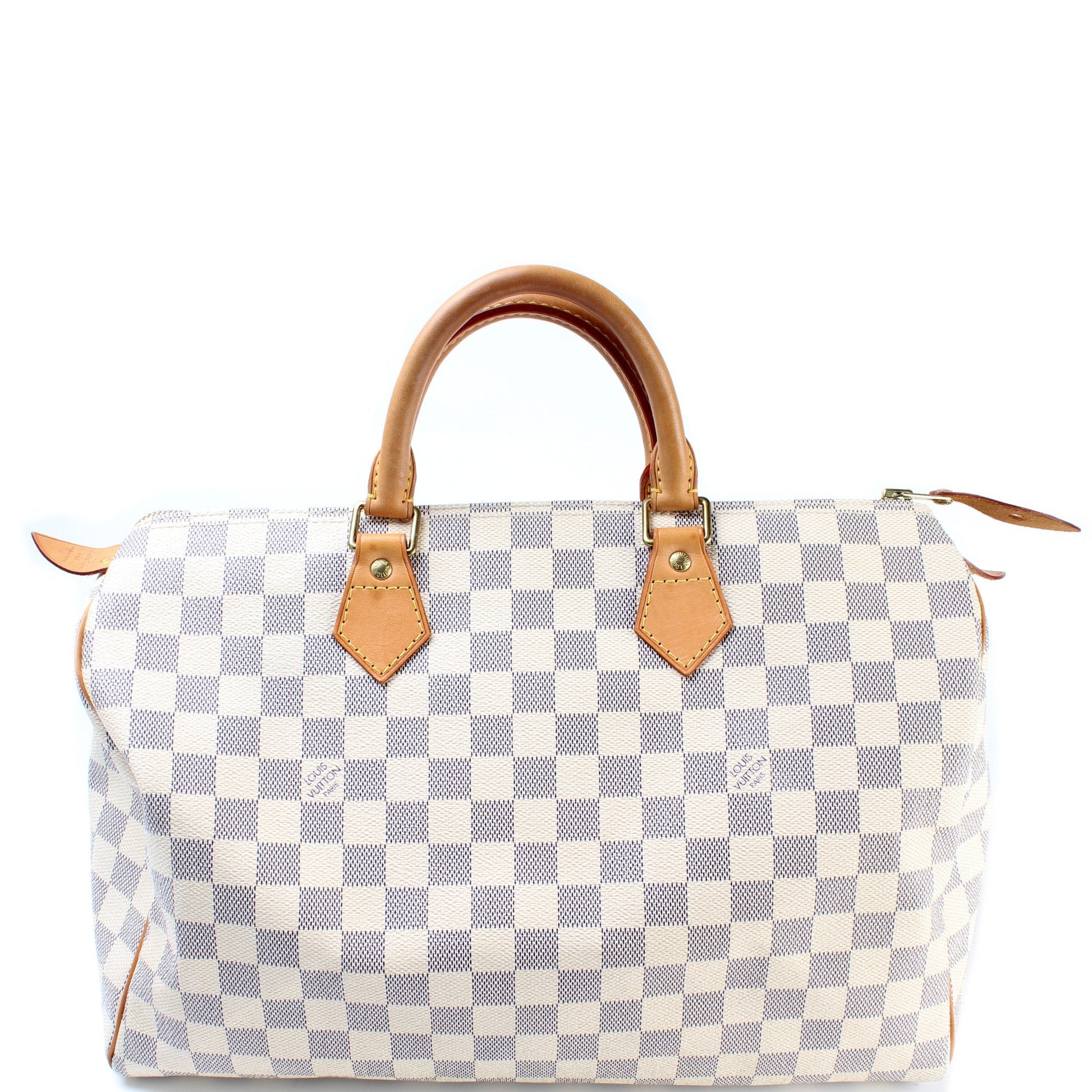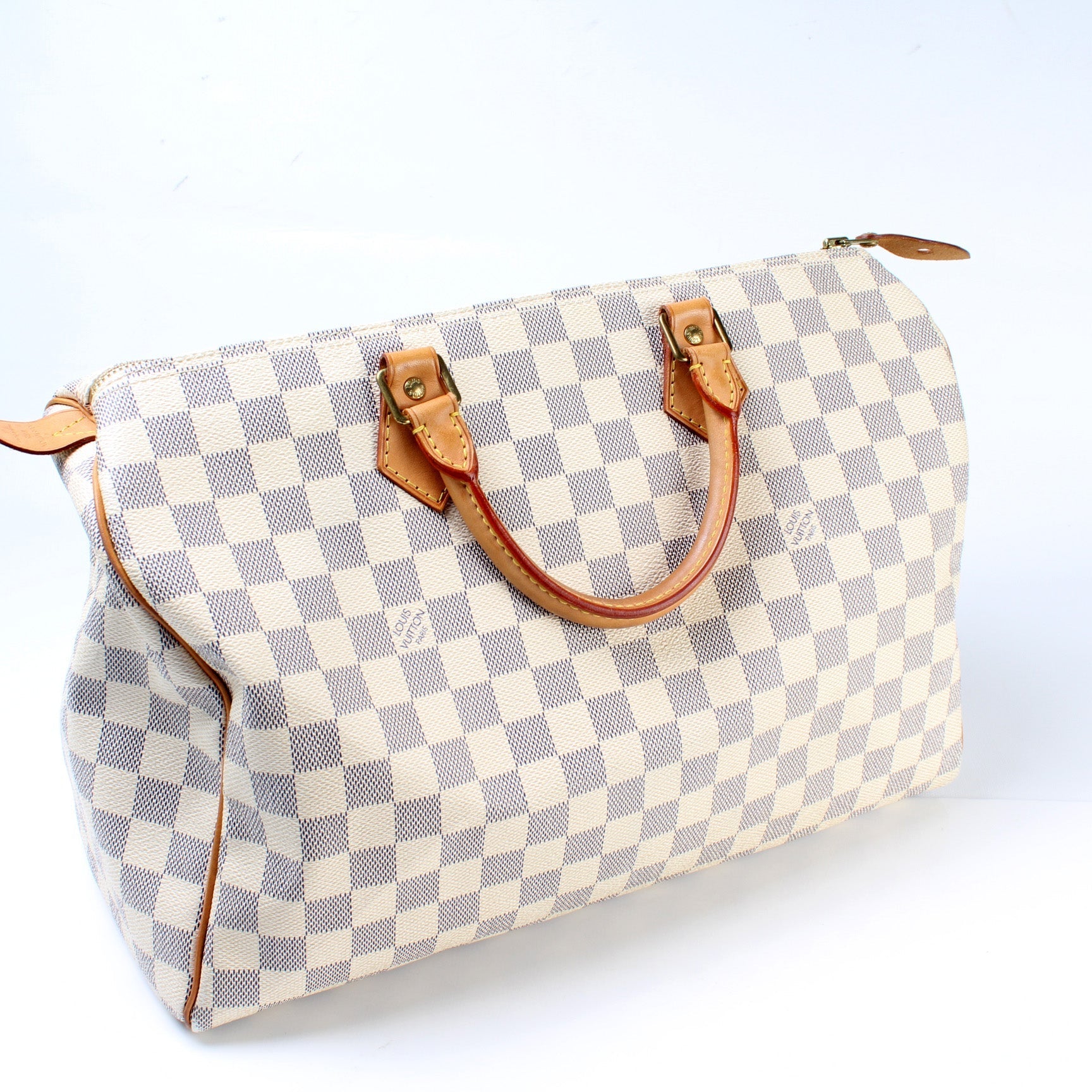 This Louis Vuitton Speedy 35 is guaranteed 100% . The exterior is in the classic Damier Azur coated canvas.