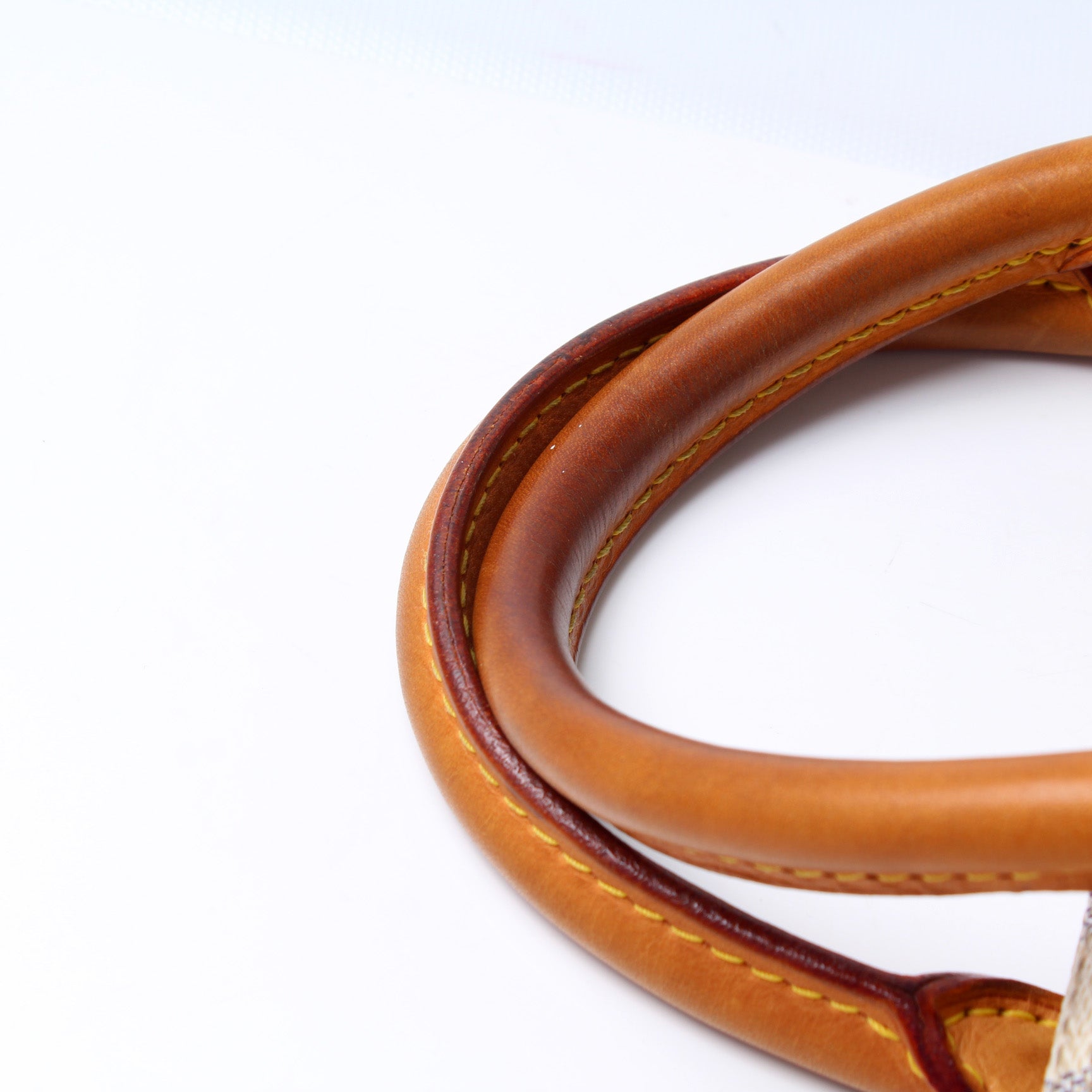 Exterior: The exterior coated canvas is free of any rips or cracks. The corners and leather piping show wear and discoloration.