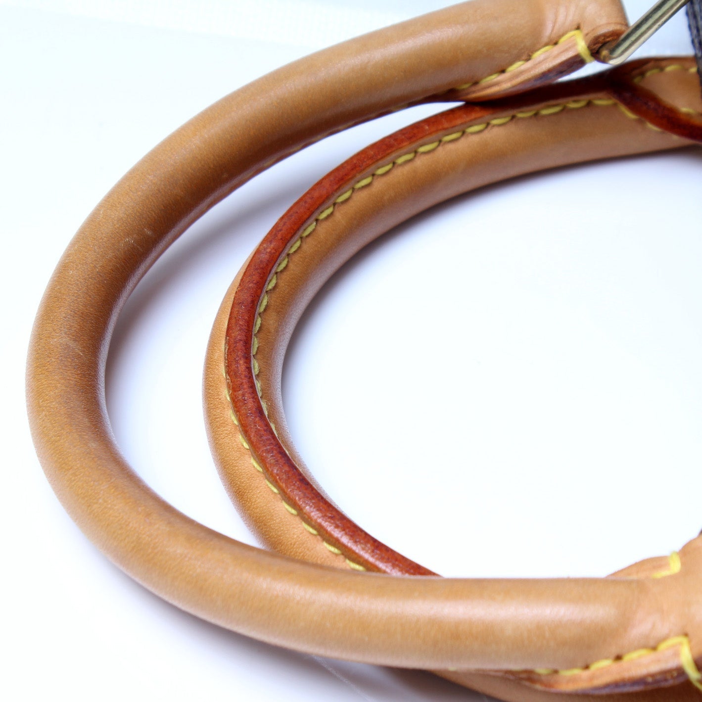 Handle: The leather has discoloration and scuffs.